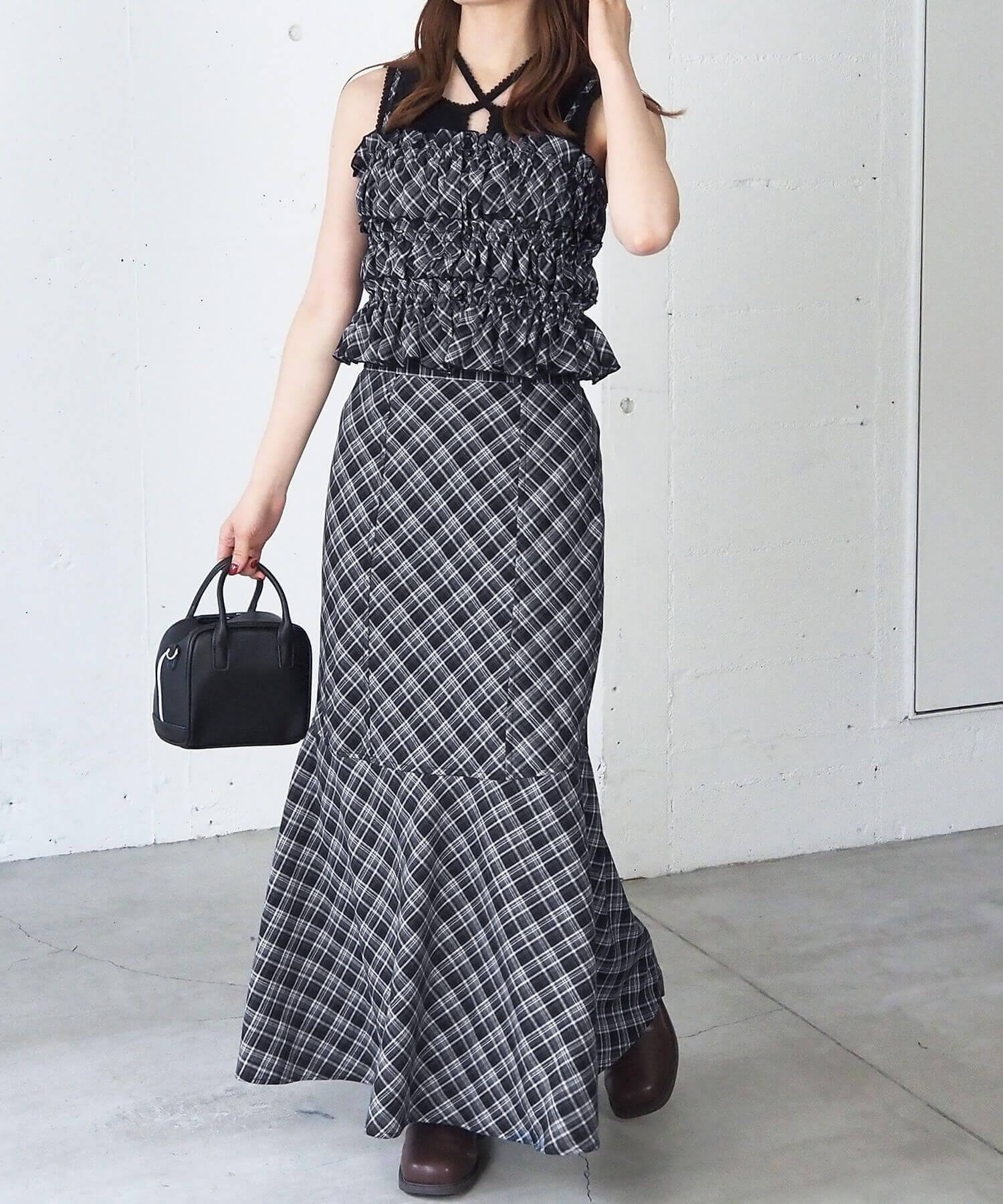 チェックアシメフリルキャミ