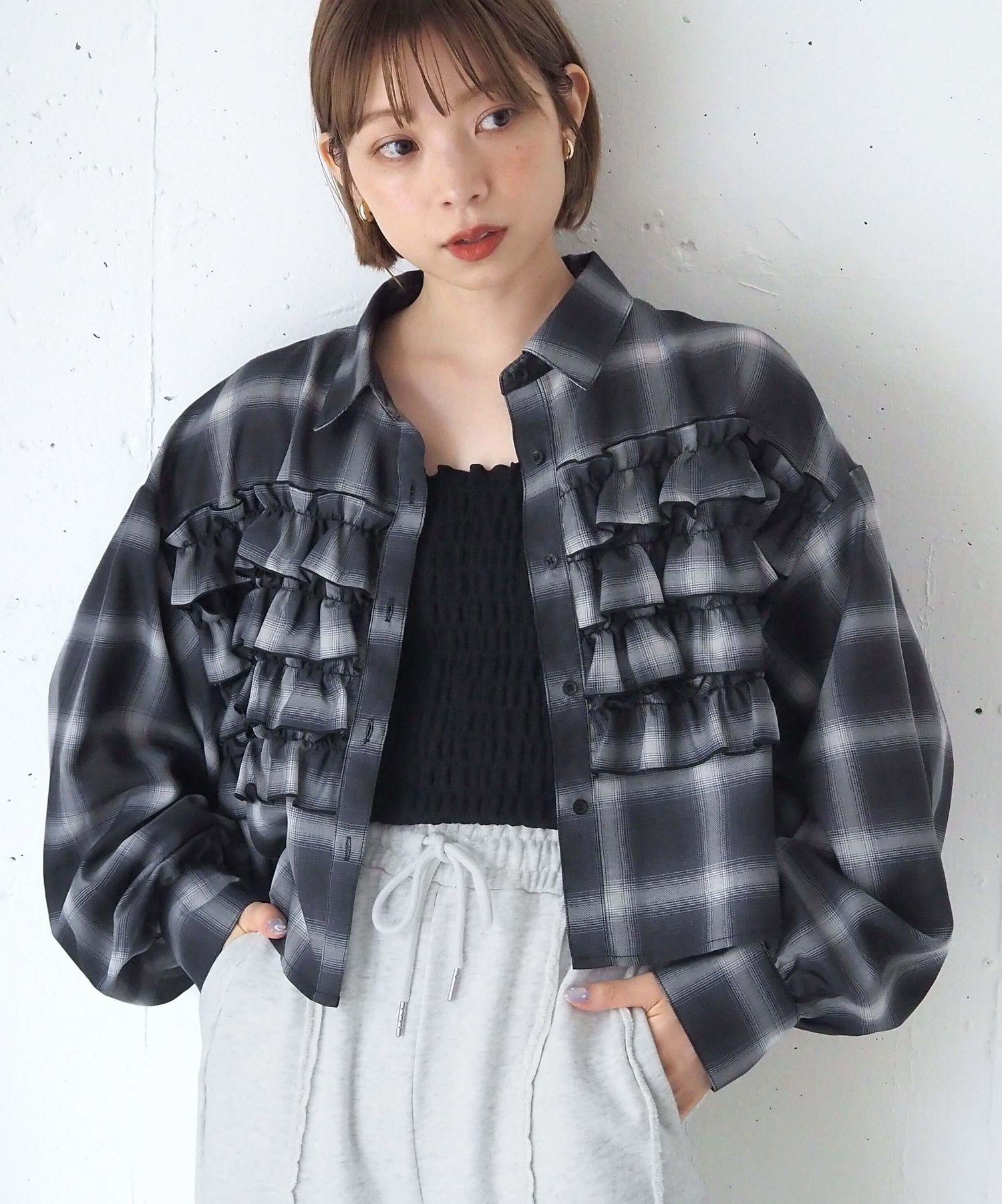 チェック段々フリルショート丈シャツ