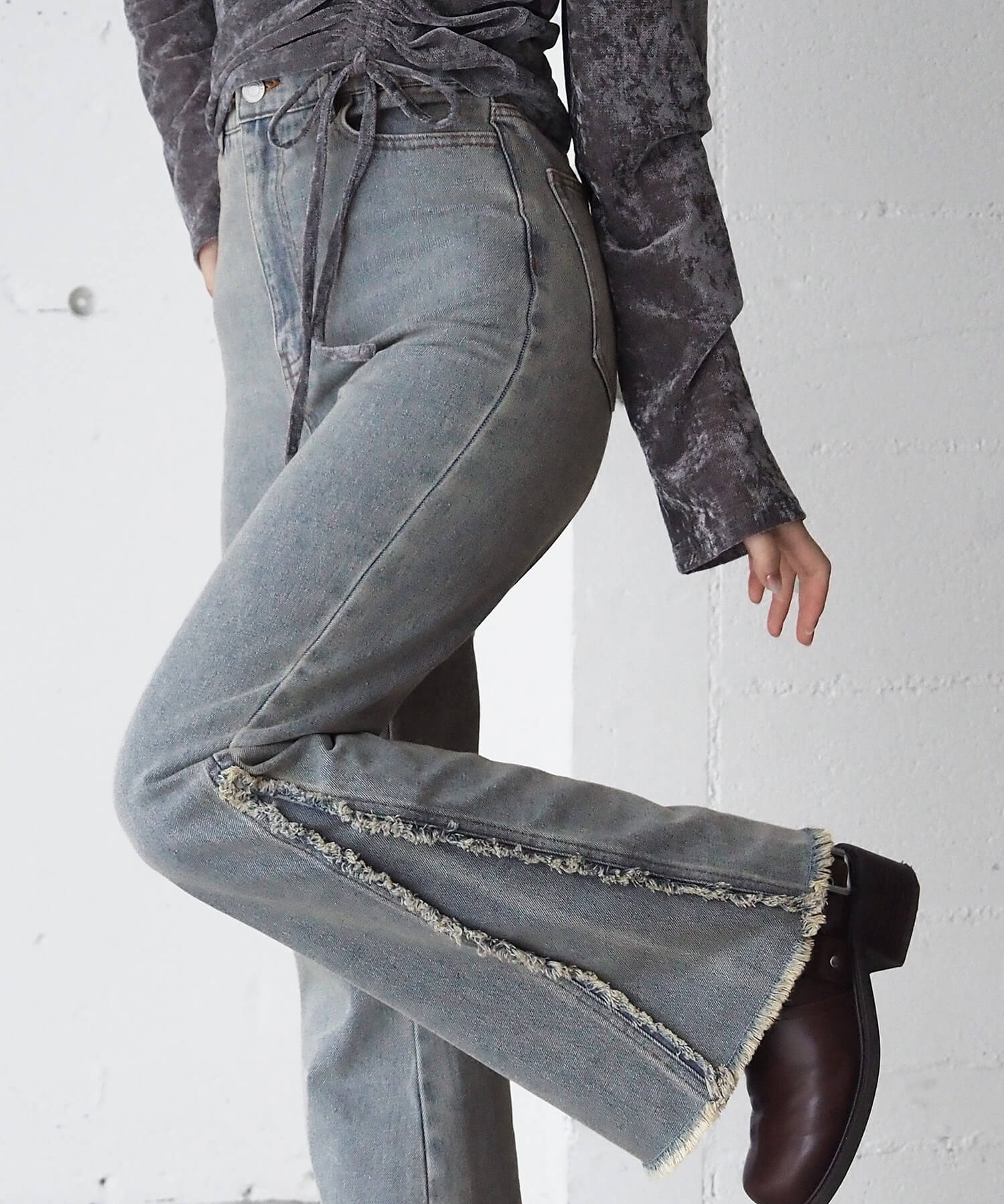 【ウェスト調整可能/2サイズ展開】脇フリンジフレアデニムパンツ