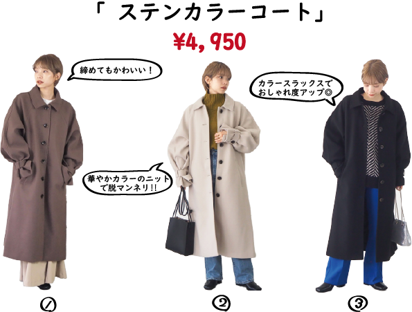 ロング丈は難しい!?と思いきや、ひざ下丈のロングコートは合わせるボトムを選ばない優秀アイテムです♪