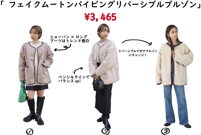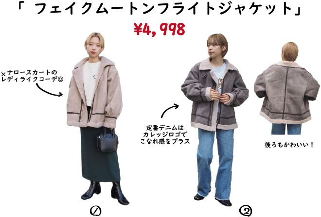 フェイクムートンはラフなスウェット×デニムコーデさえも上品に魅せてくれるのが魅力です。
