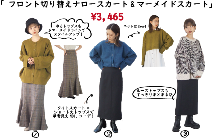 2021AWから不動の人気を誇るフロント切り替えナロースカート&マーメイドスカート。