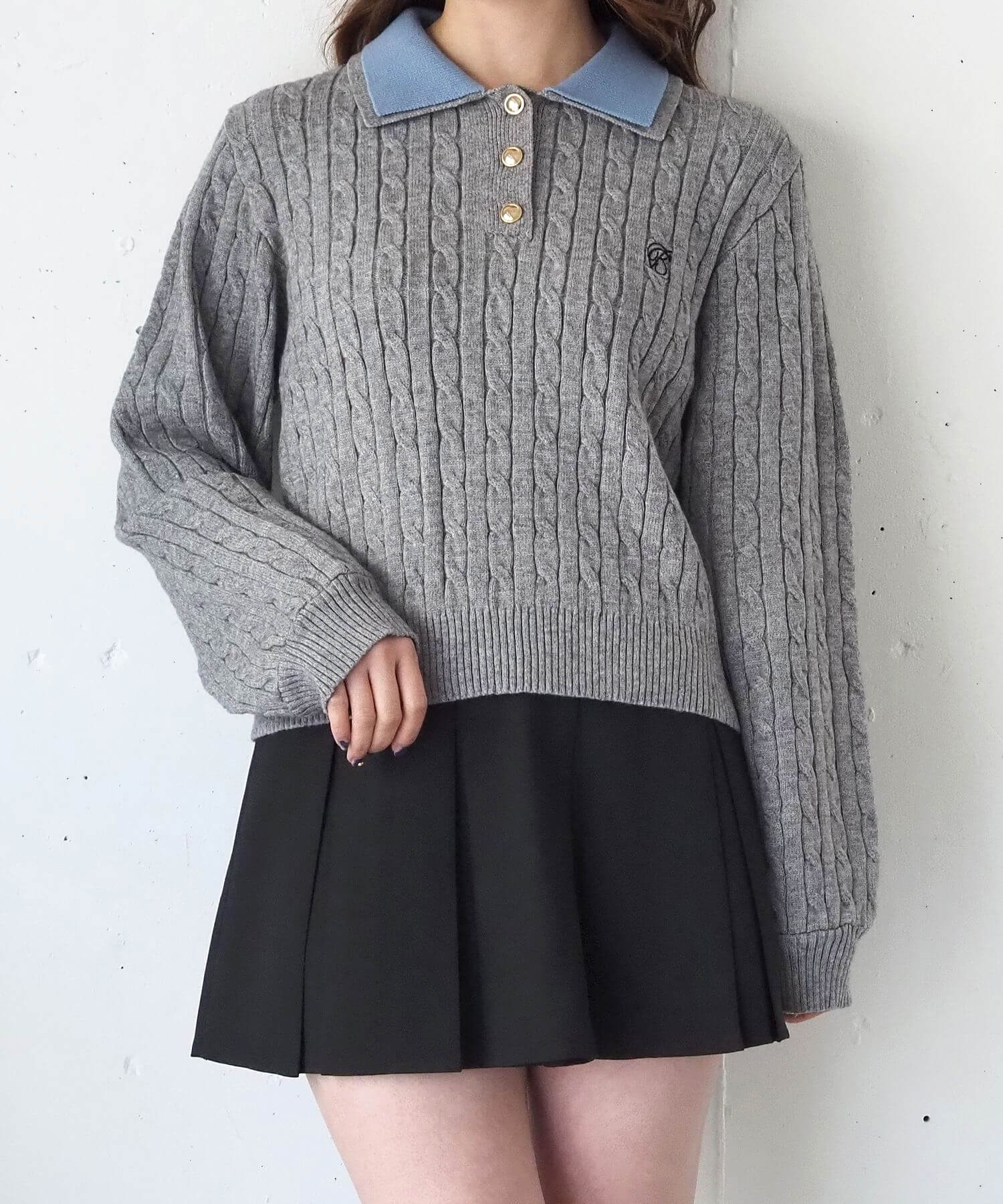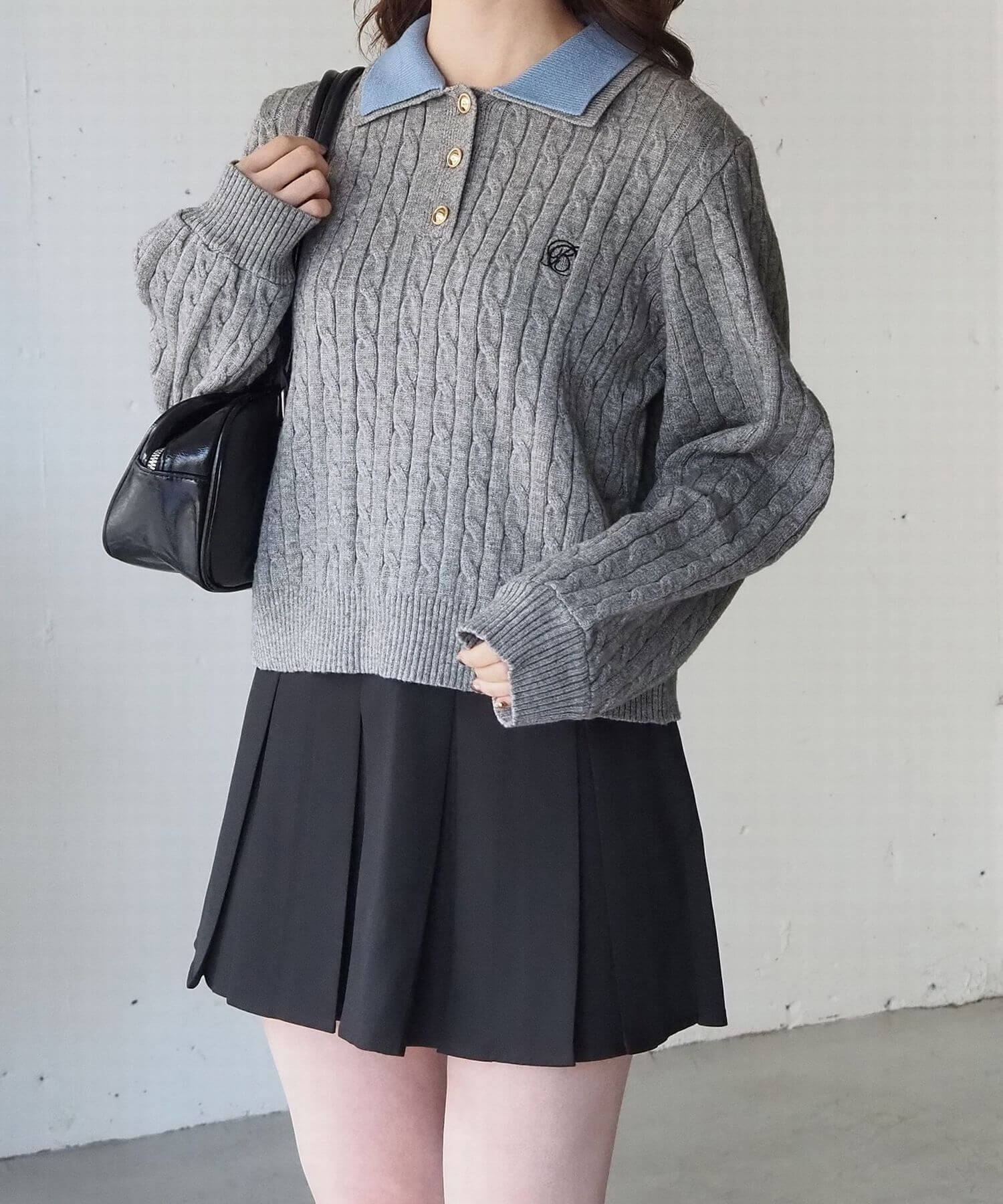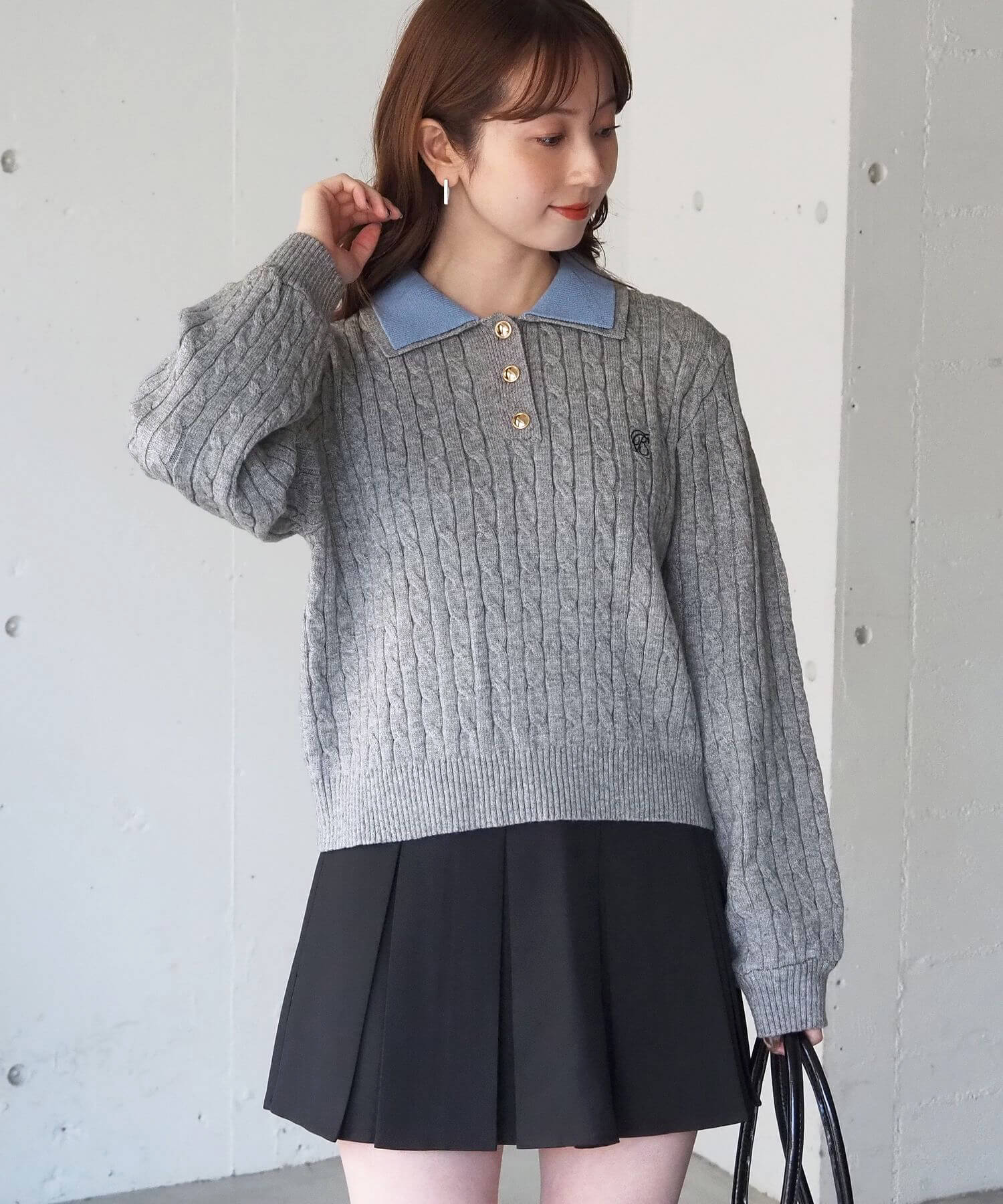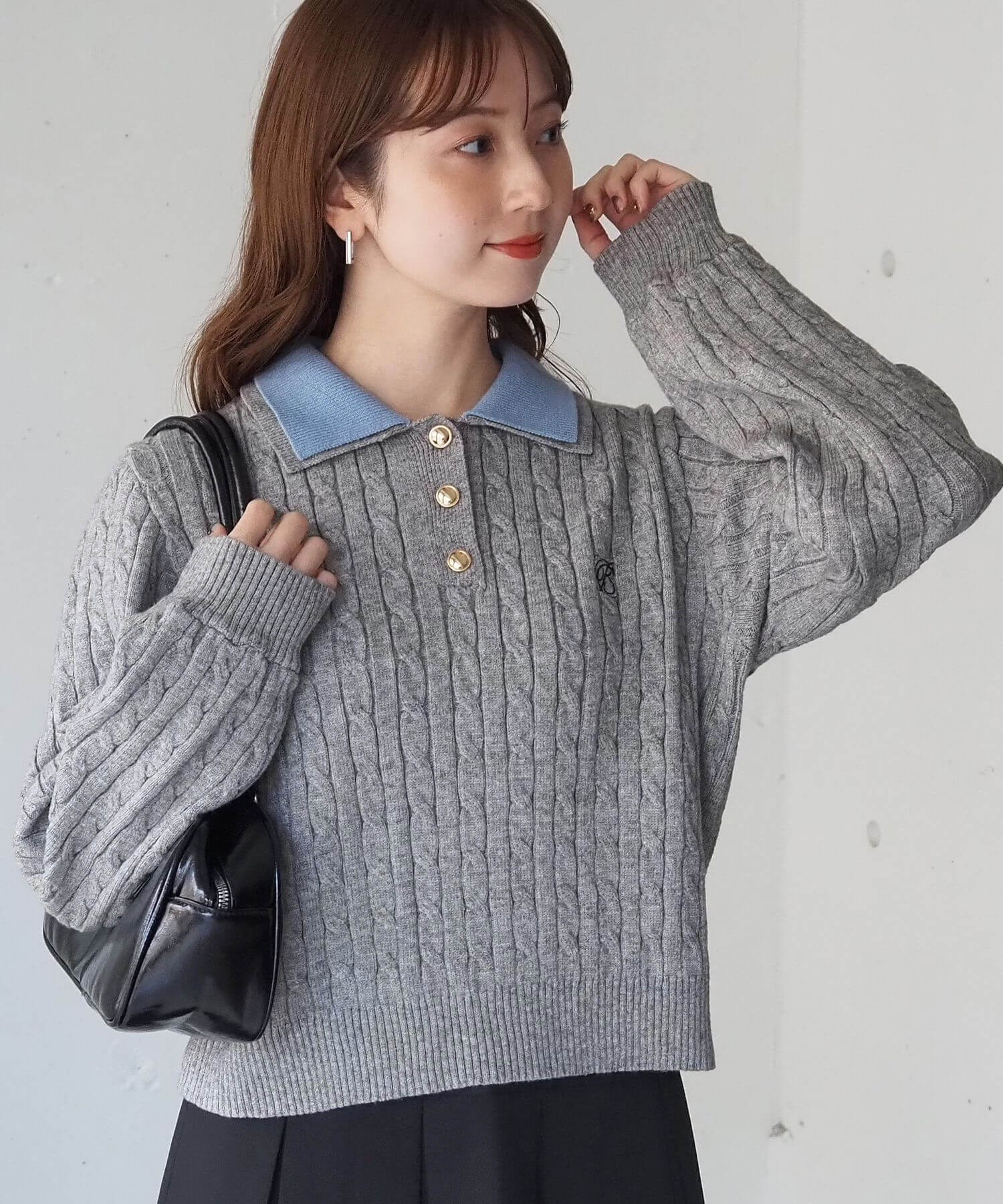 ・ロゴ刺繍やレトロな襟付きデザインが今っぽいケーブルニットです。