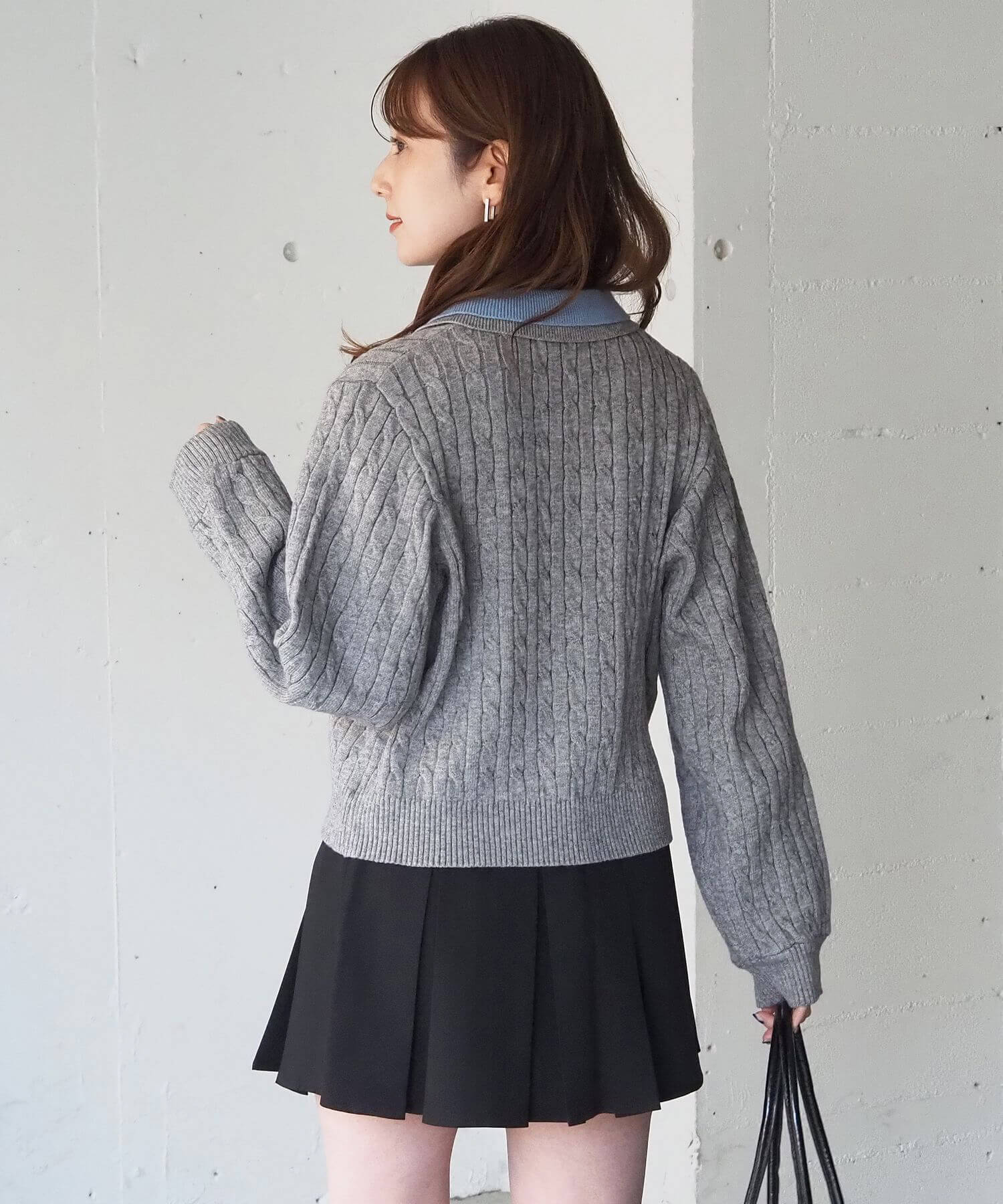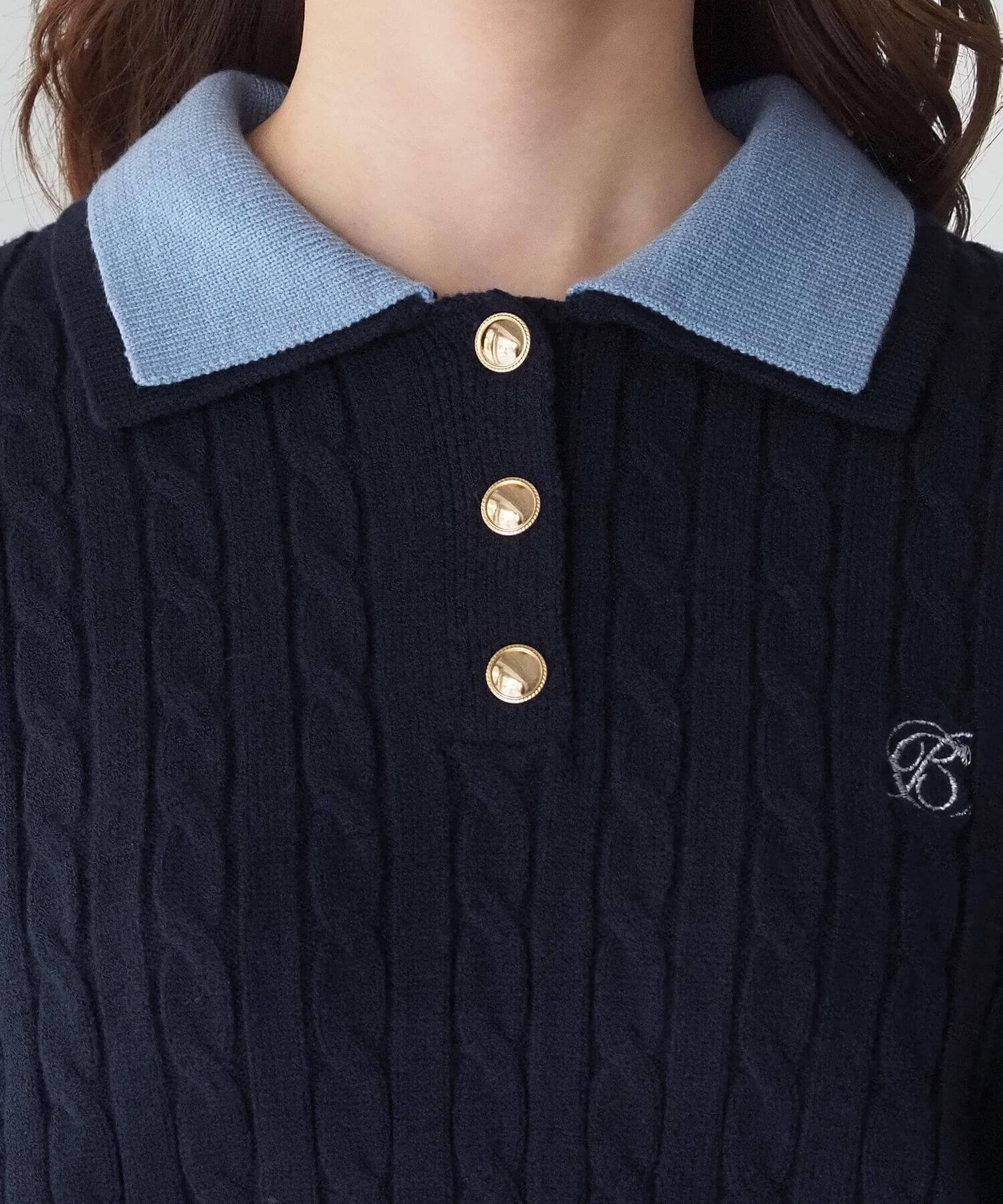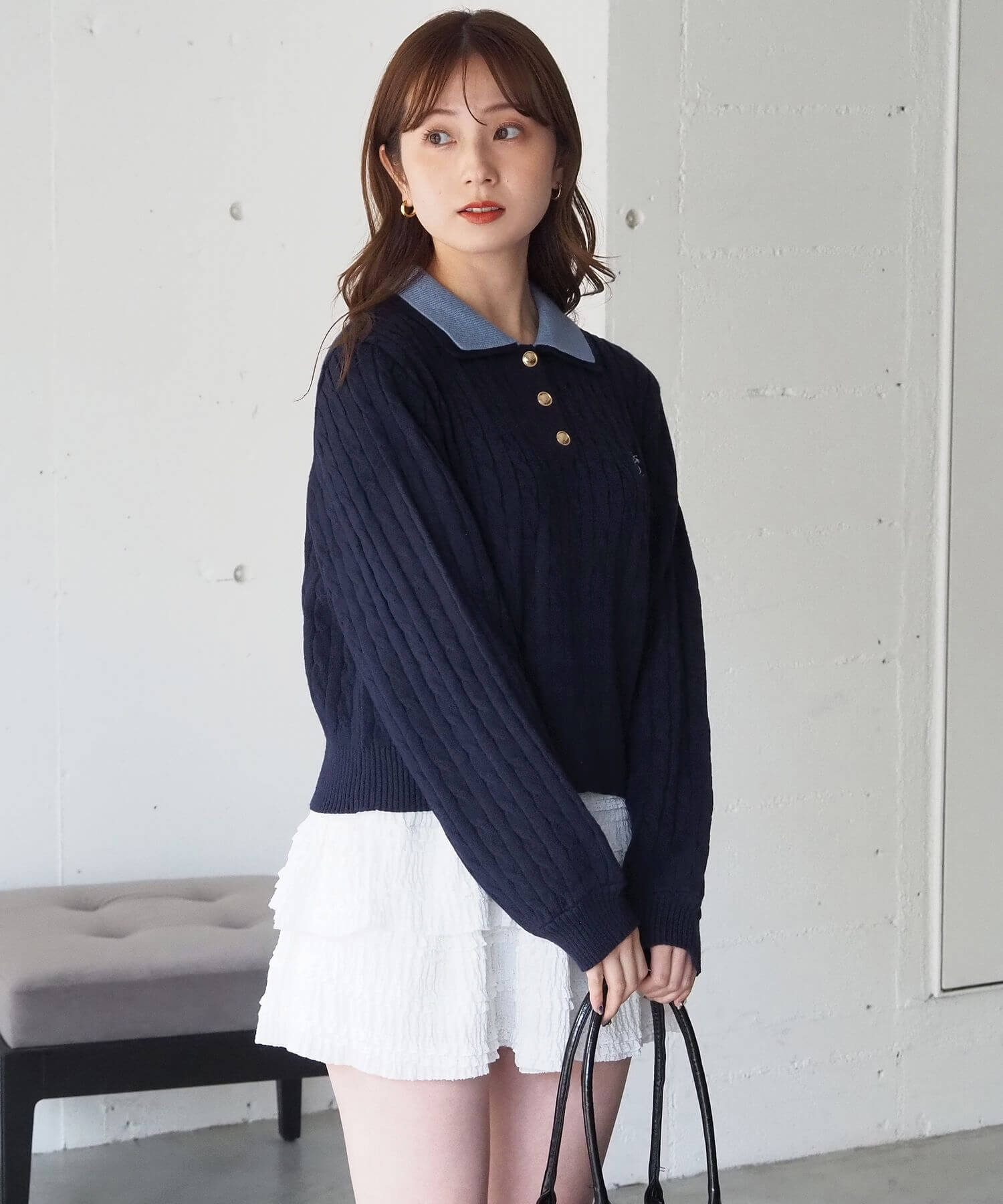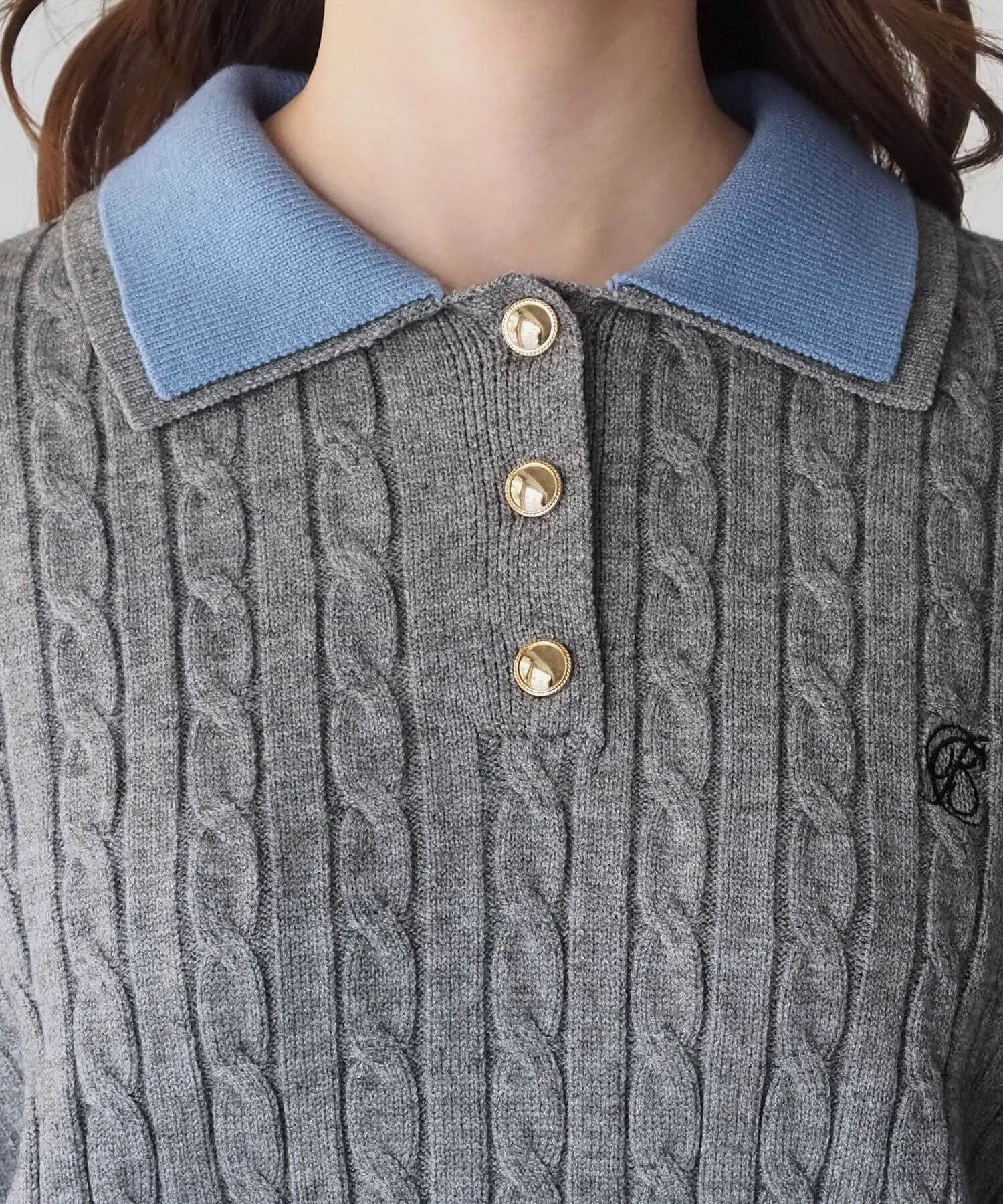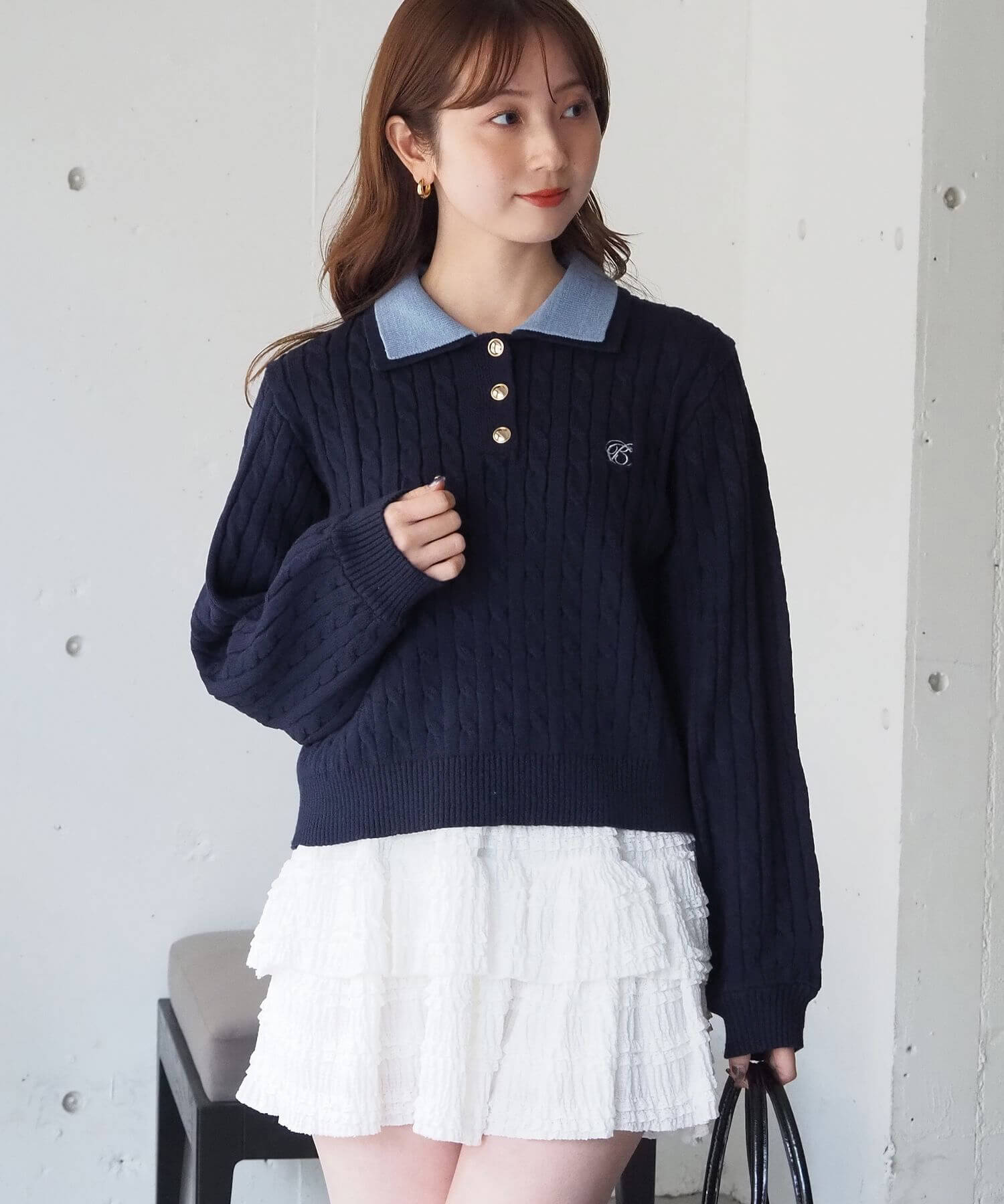 ・ロゴ刺繍やレトロな襟付きデザインが今っぽいケーブルニットです。