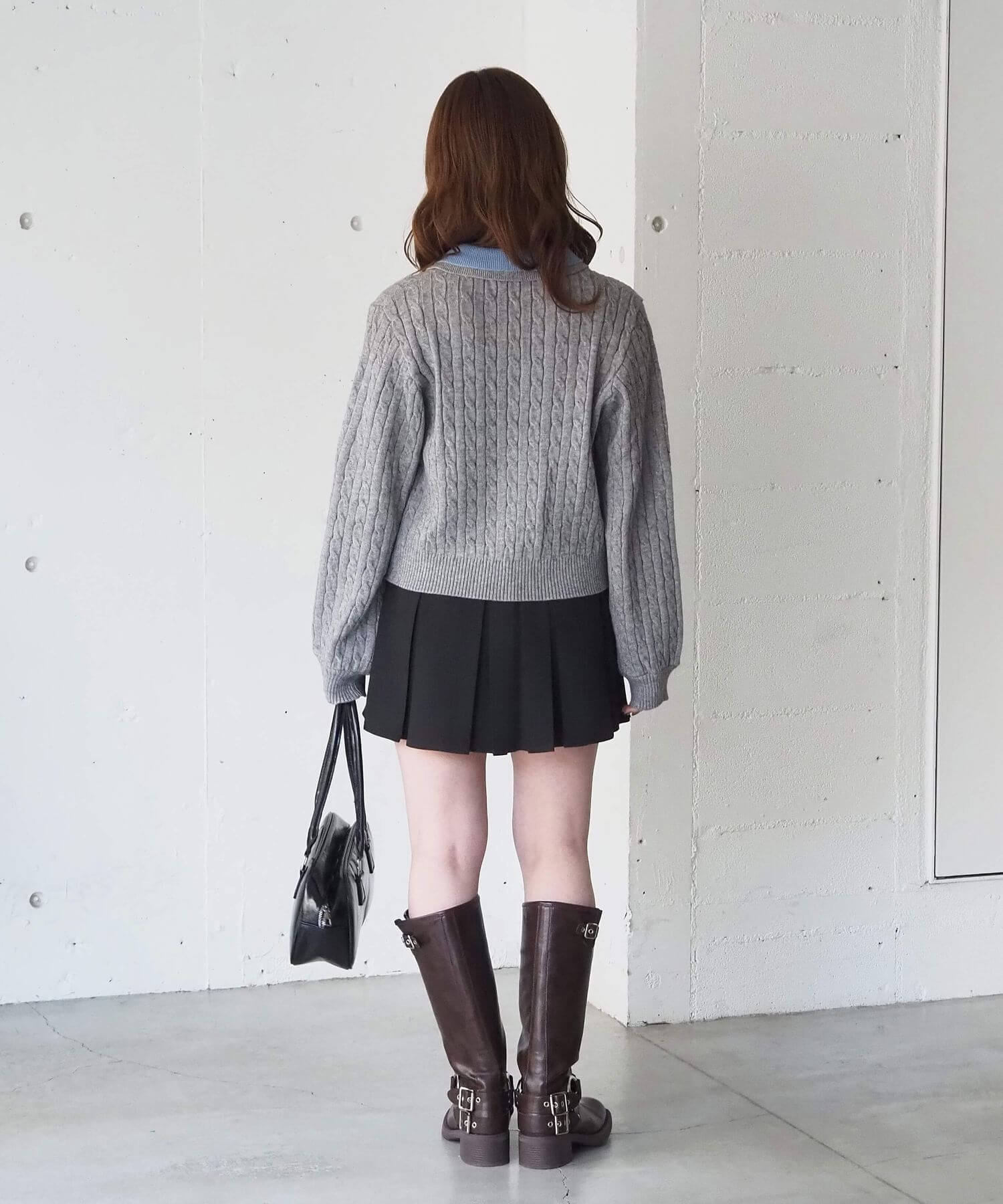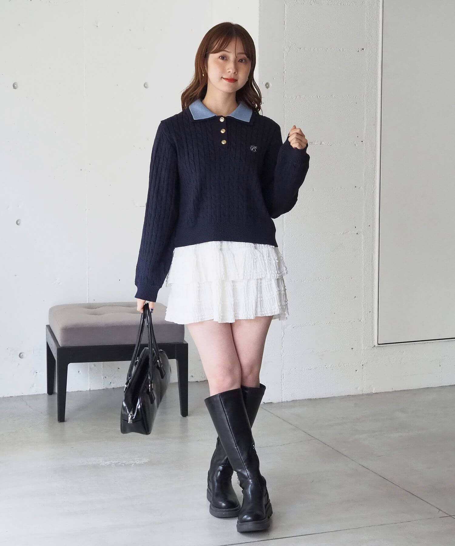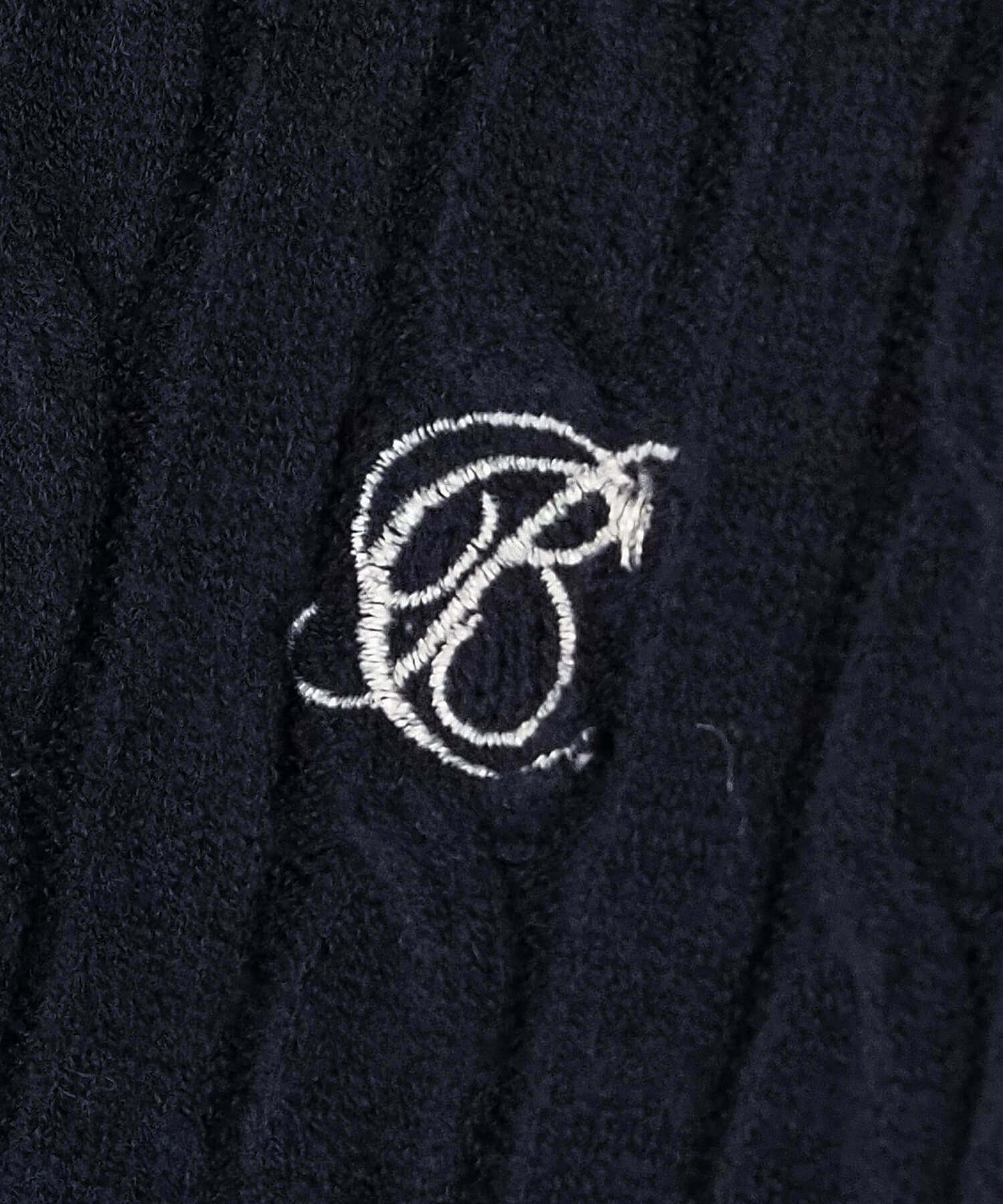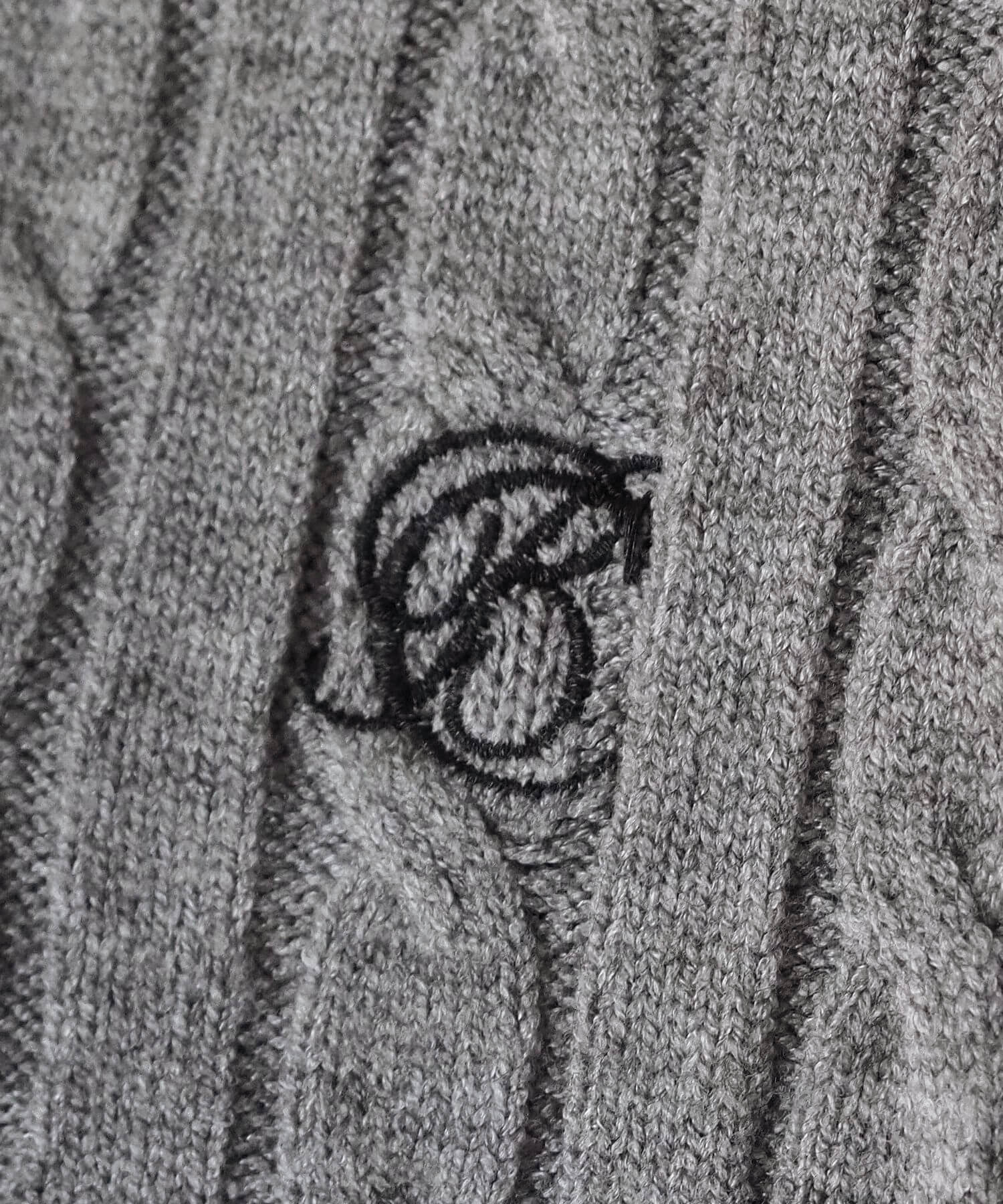 ・ロゴ刺繍やレトロな襟付きデザインが今っぽいケーブルニットです。