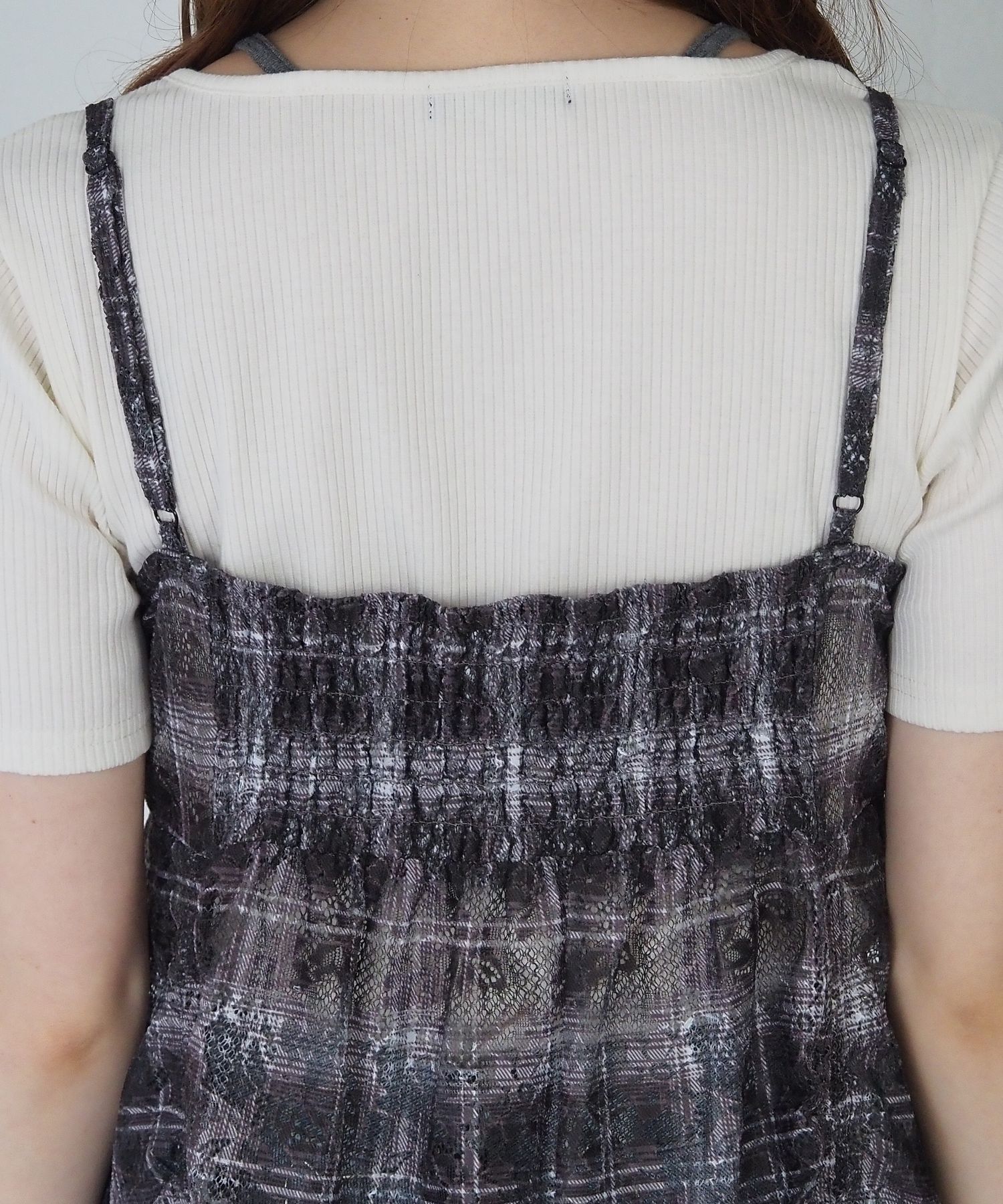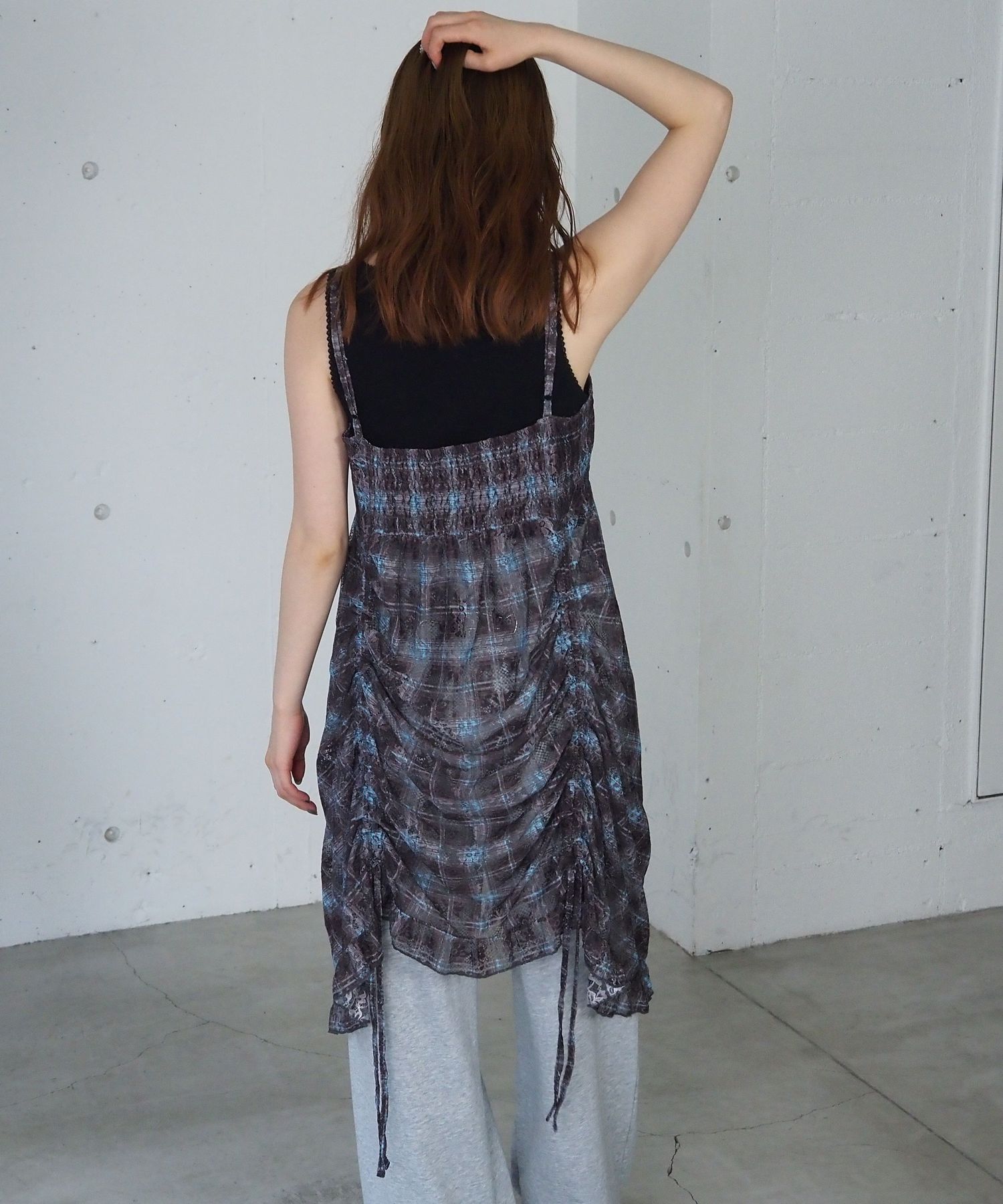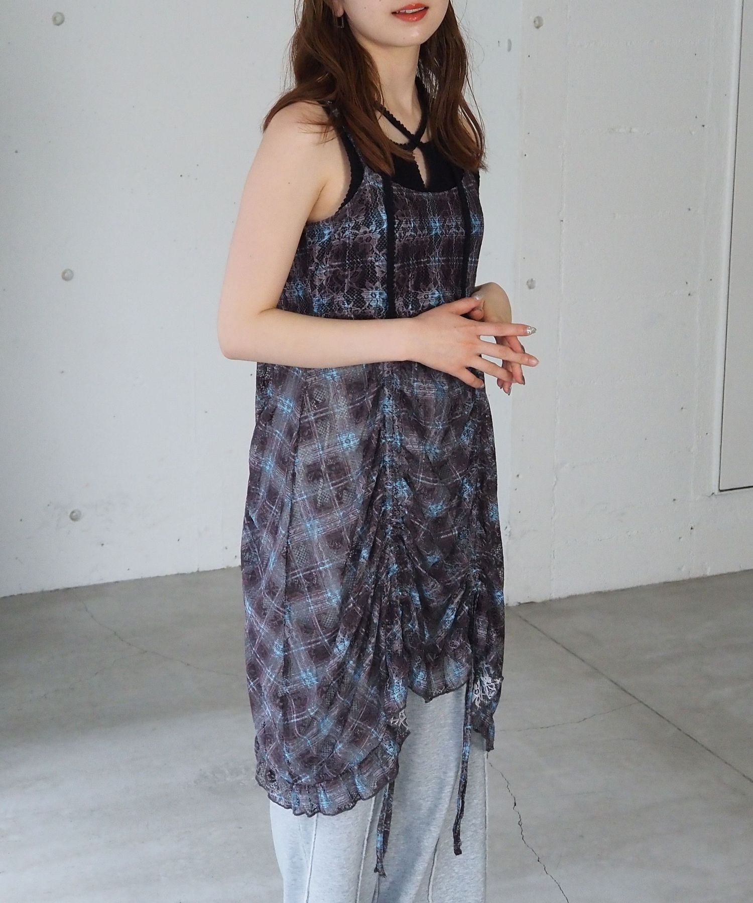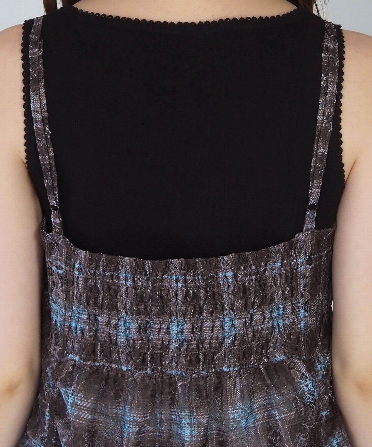 ・前後のドロストデザインがアクセントになった総レースのキャミチュニック。