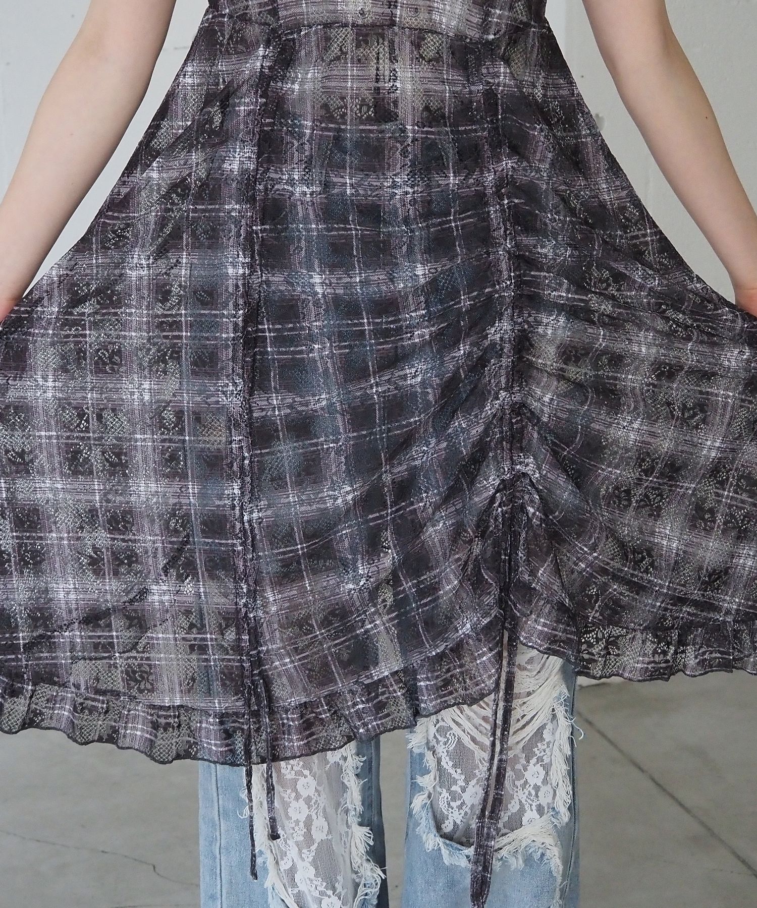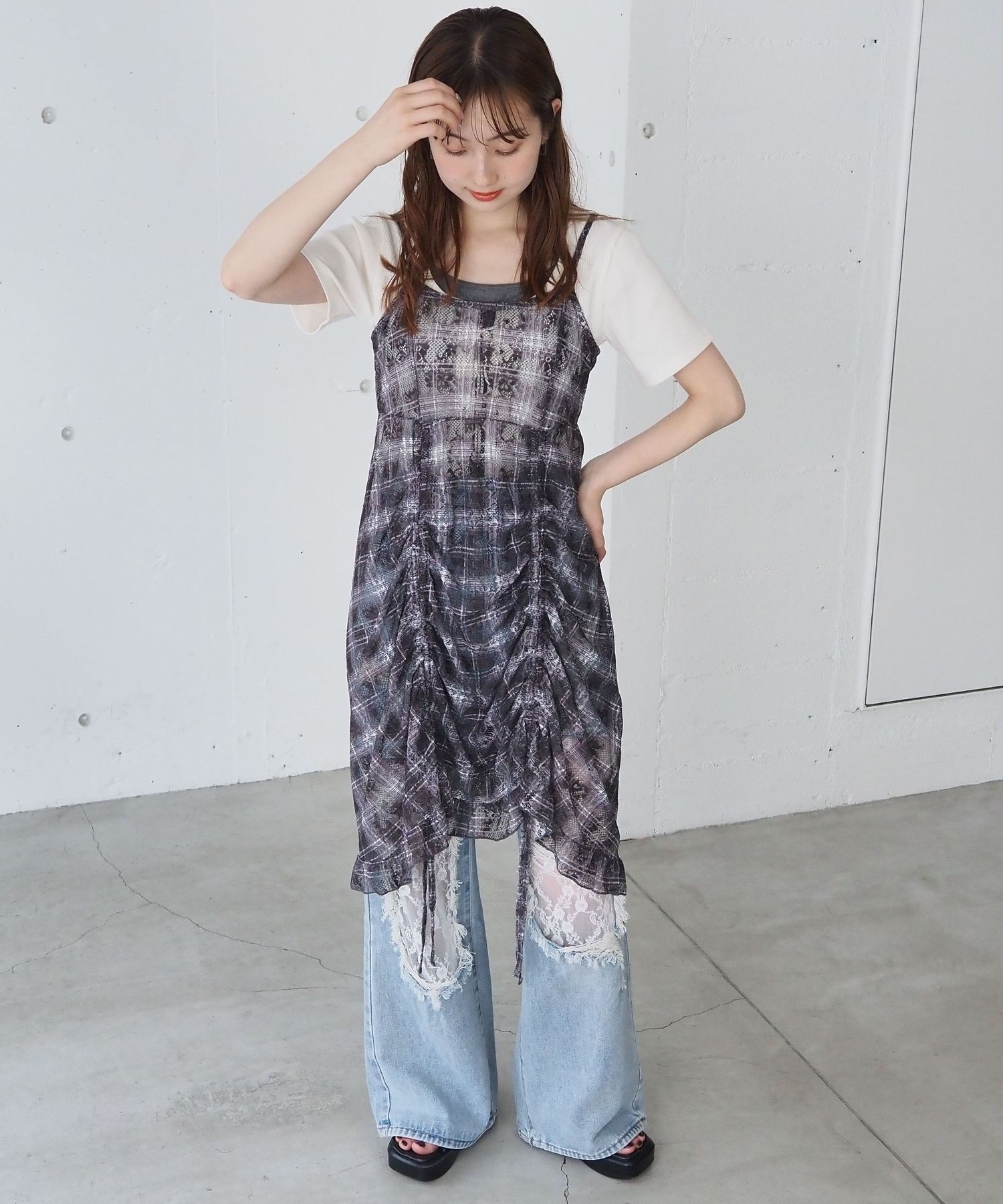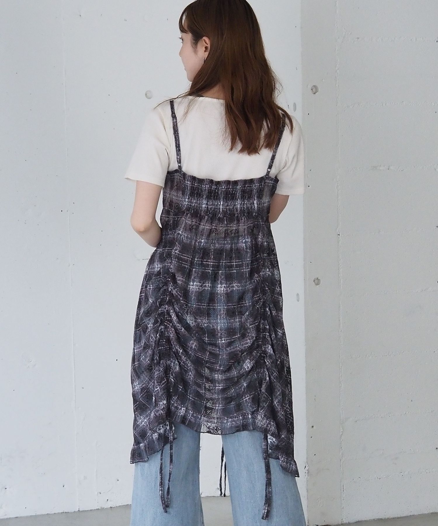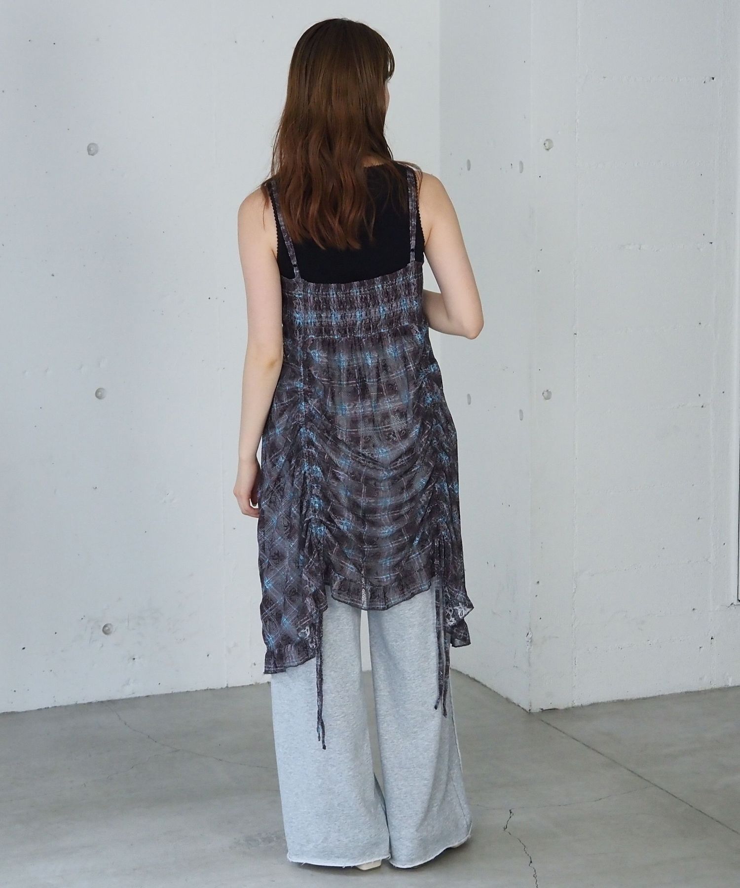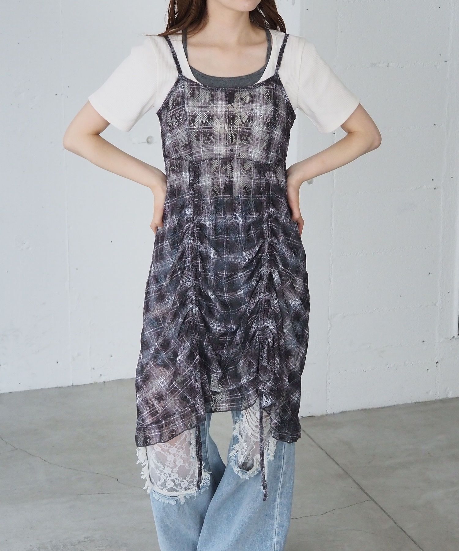・前後のドロストデザインがアクセントになった総レースのキャミチュニック。