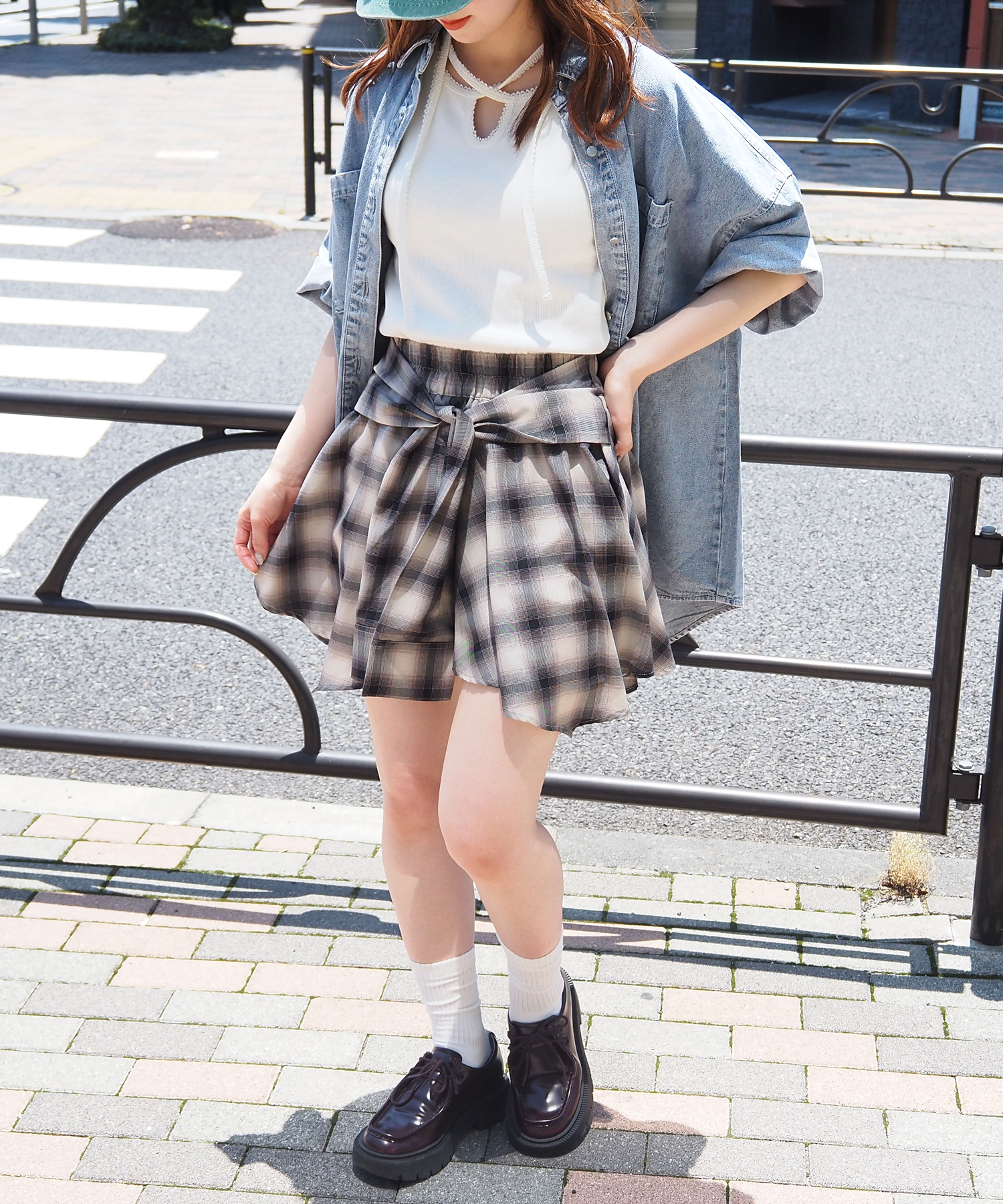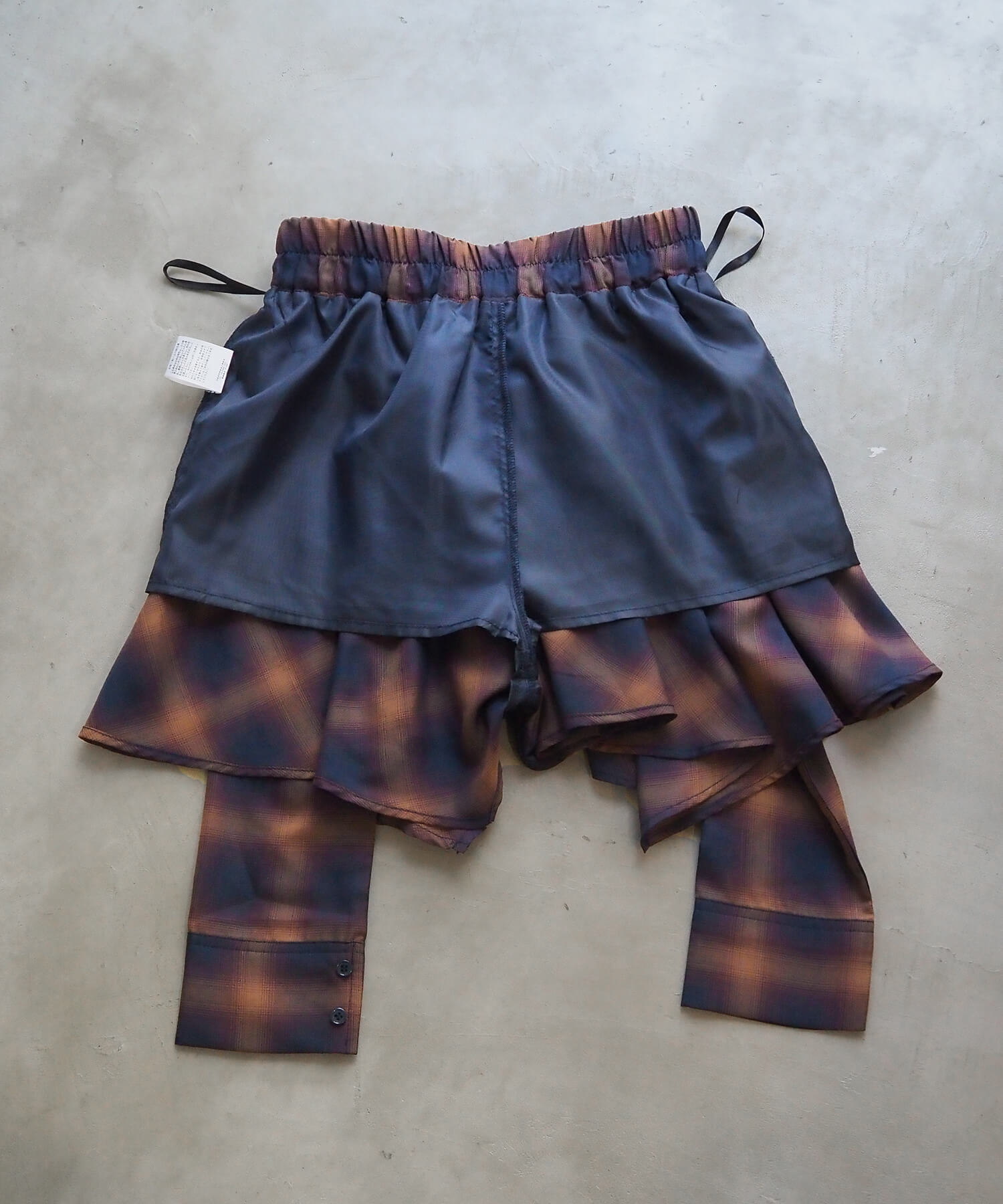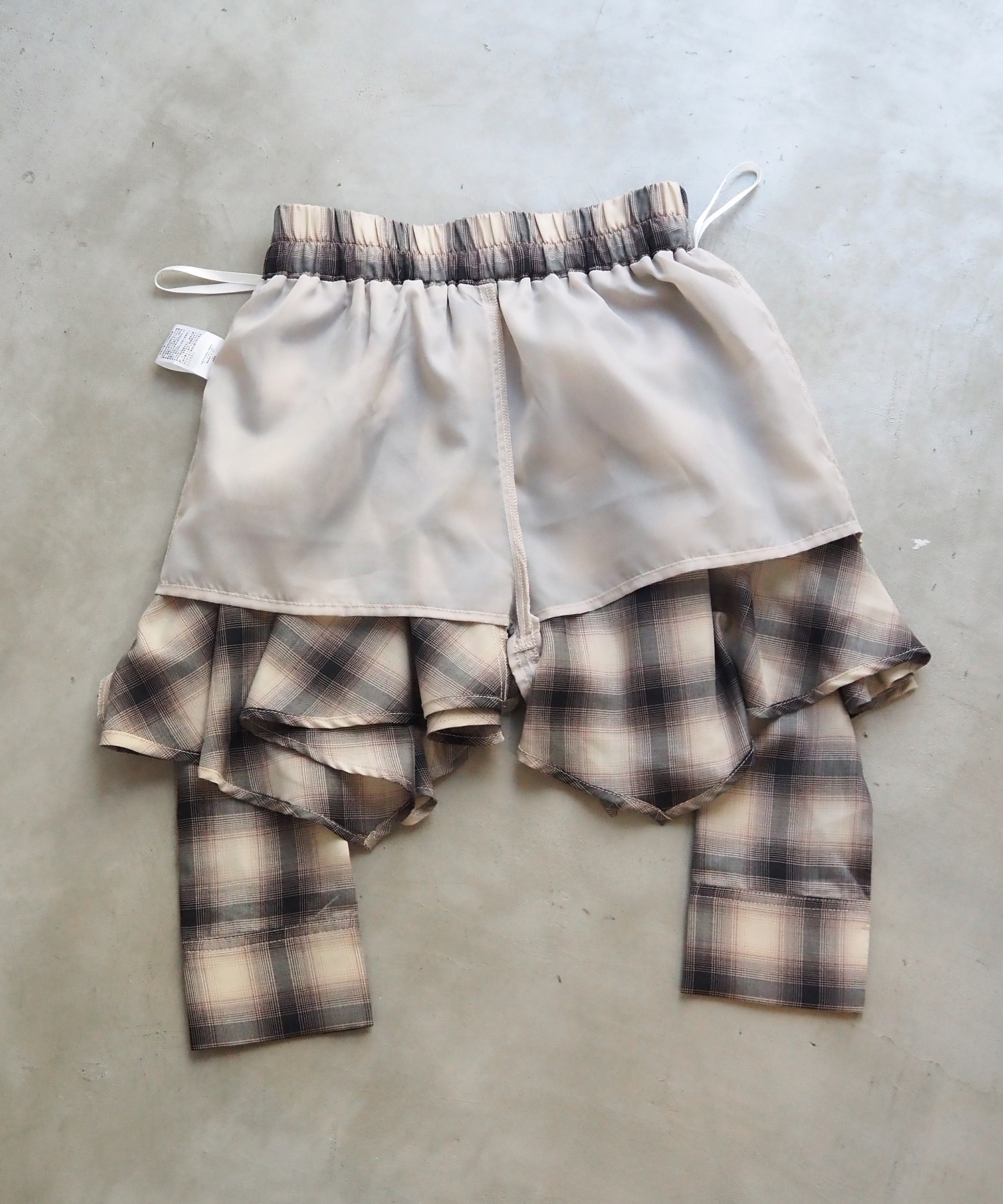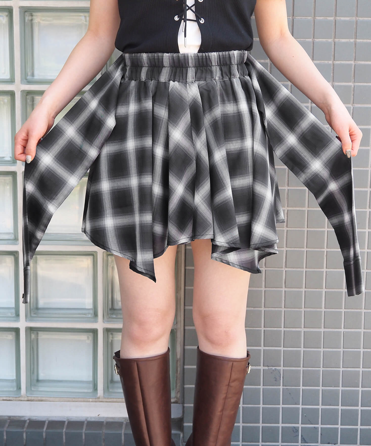 ・チェックシャツを腰に巻いたようなデザインとイレヘムが目を惹くミニスカパンです。