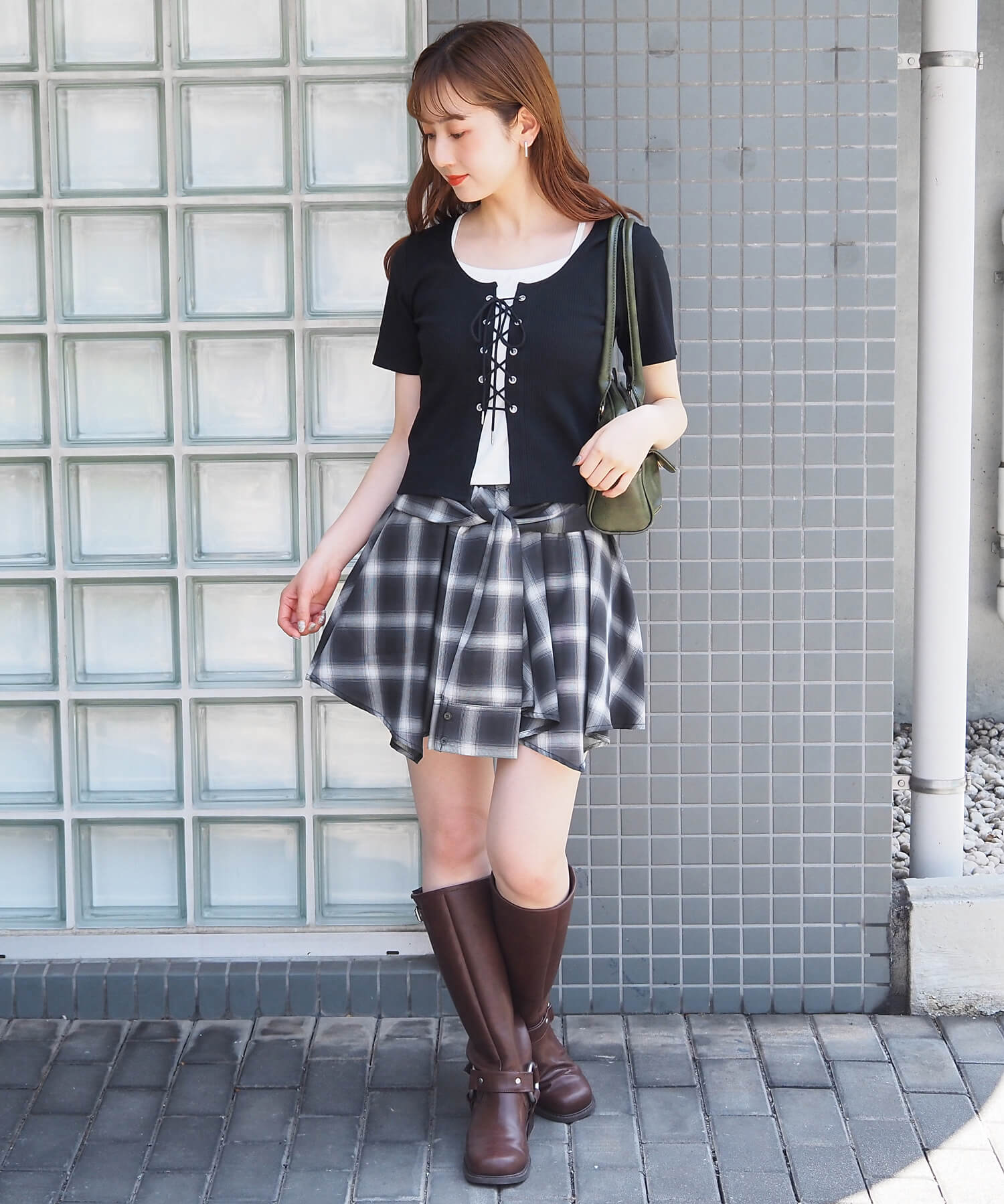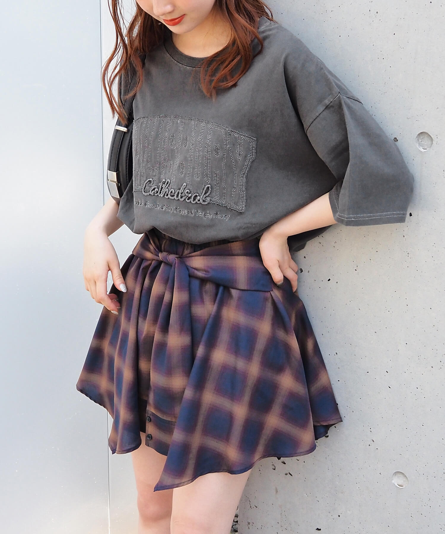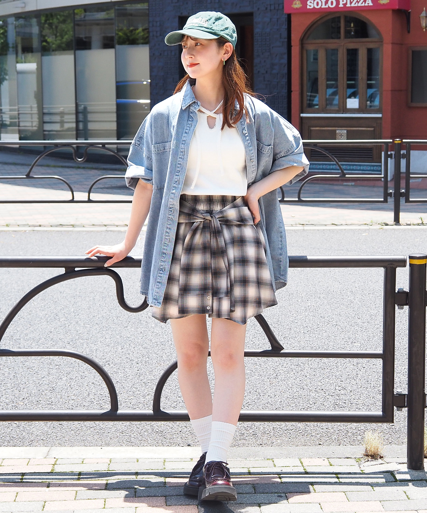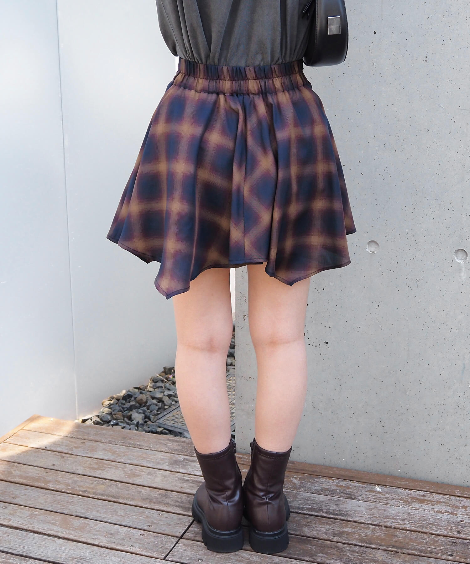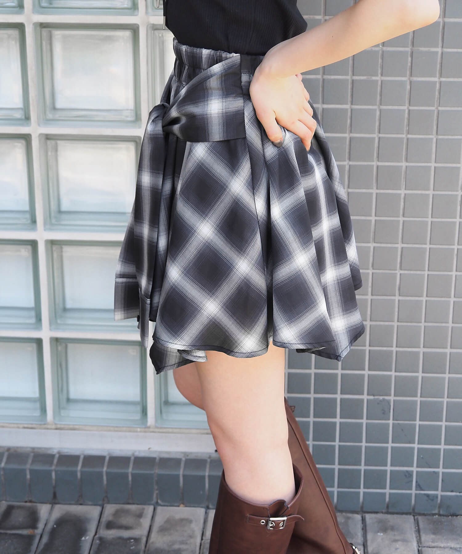 ・チェックシャツを腰に巻いたようなデザインとイレヘムが目を惹くミニスカパンです。