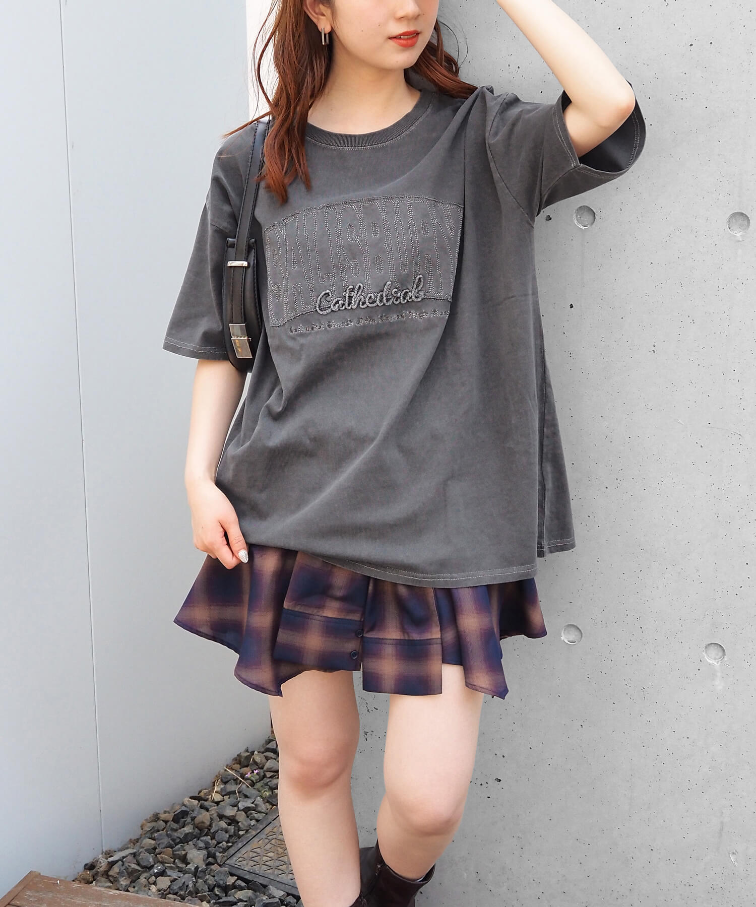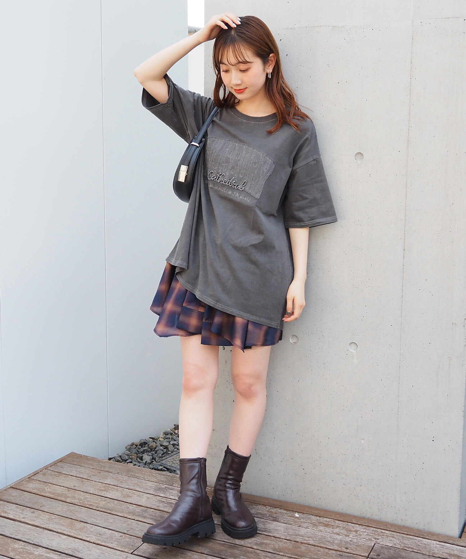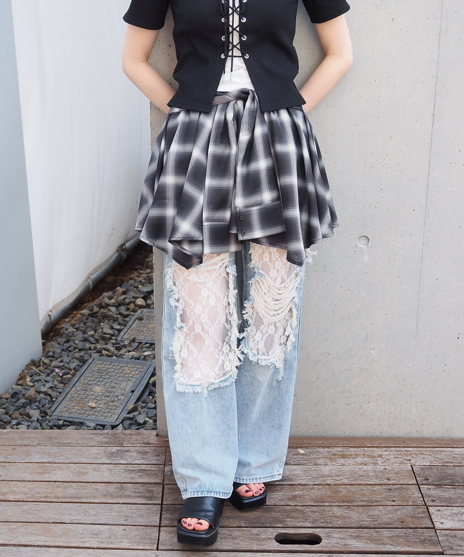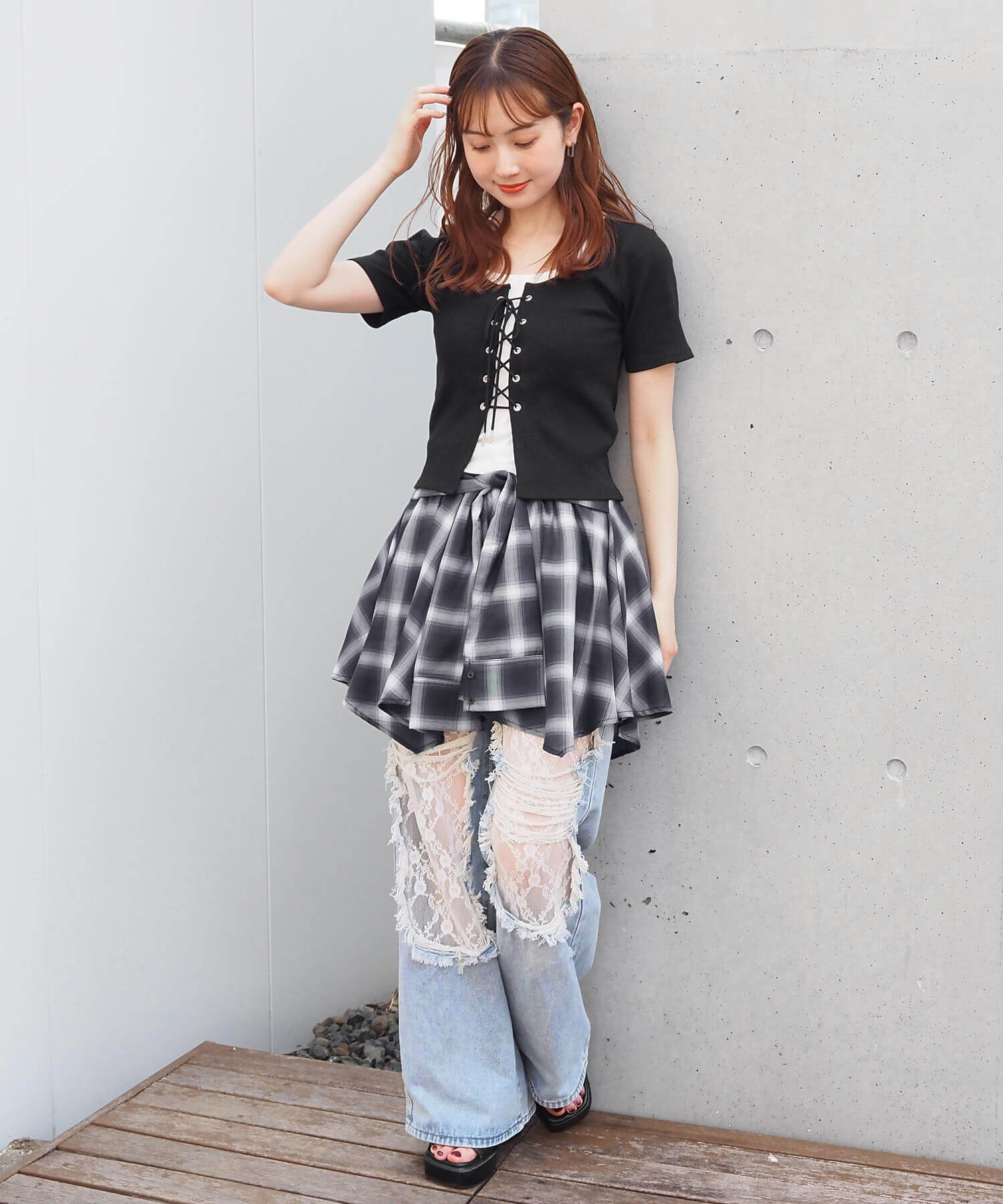 ・チェックシャツを腰に巻いたようなデザインとイレヘムが目を惹くミニスカパンです。