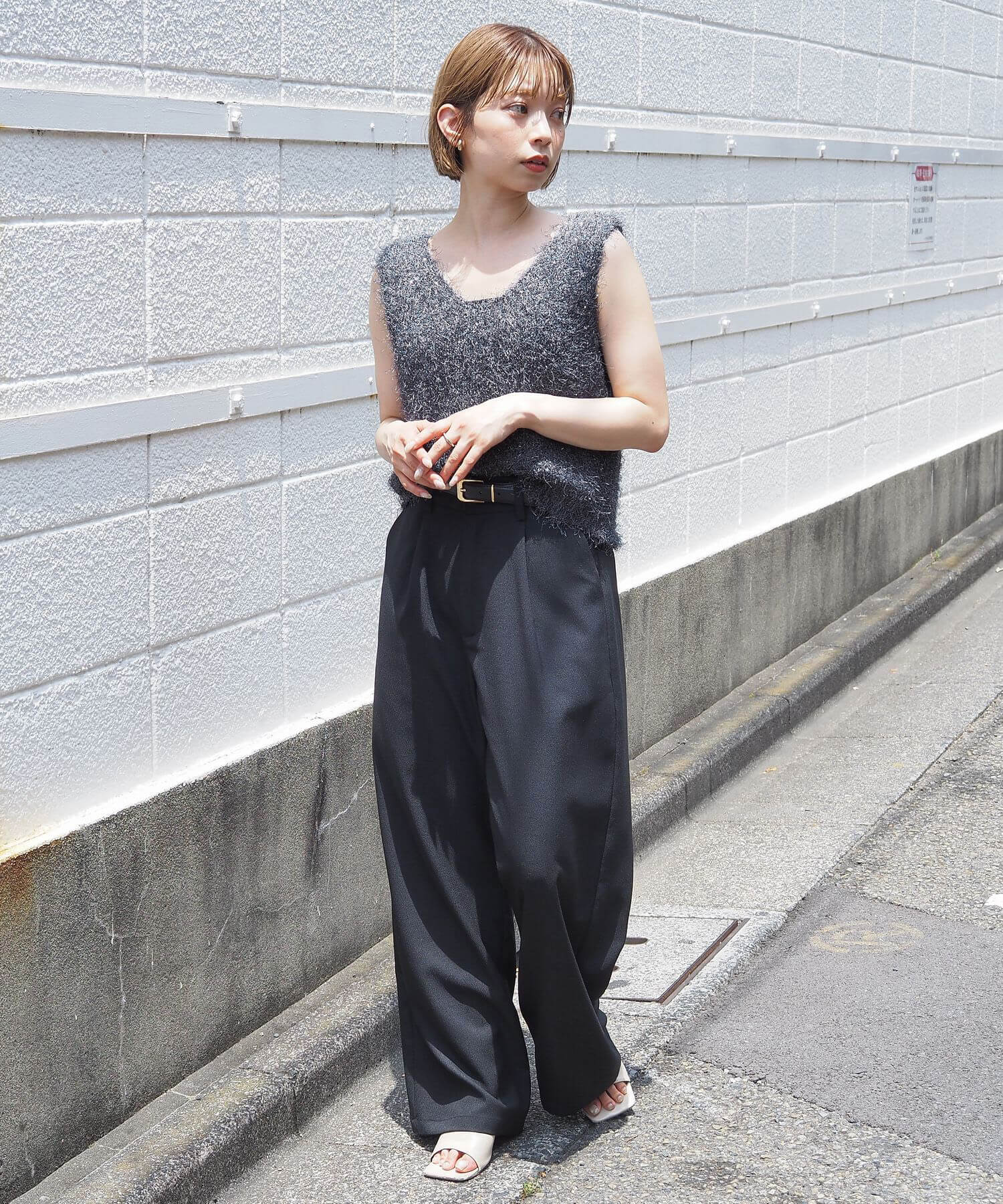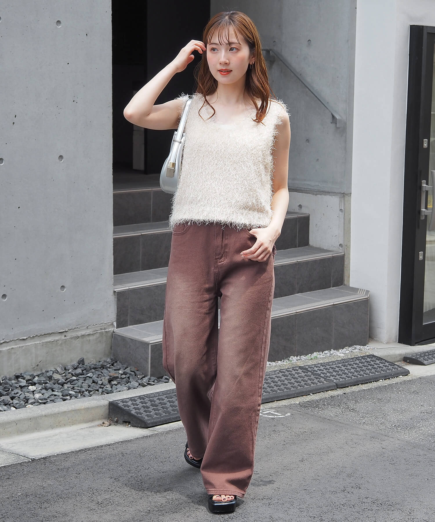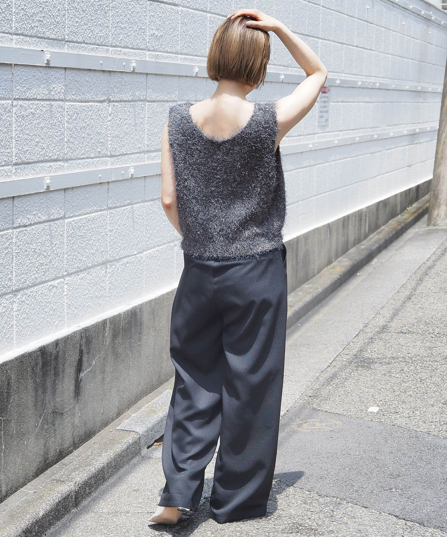 ・ラメ糸を生かして、スラックスやヒールでドレスアップも決まります。