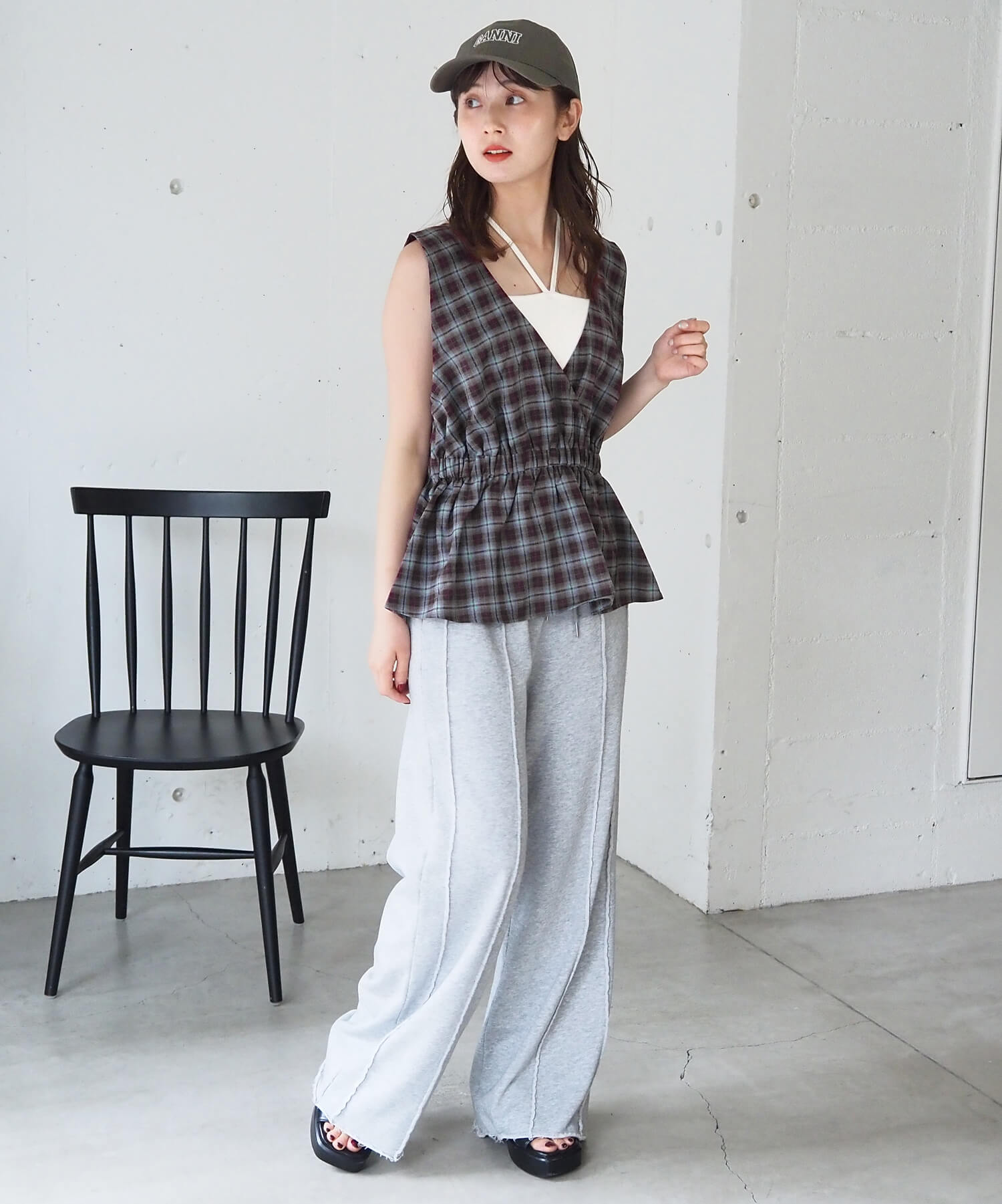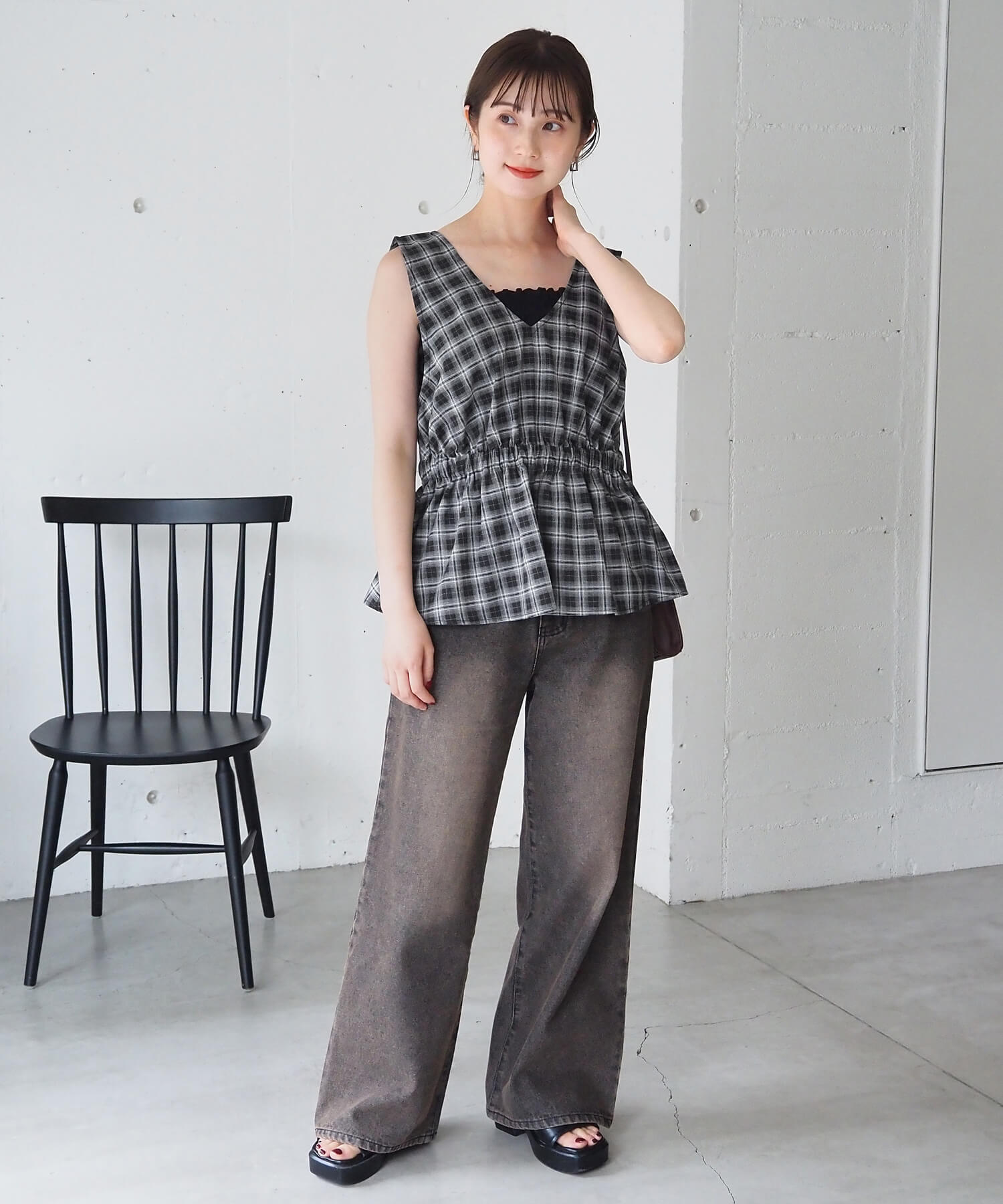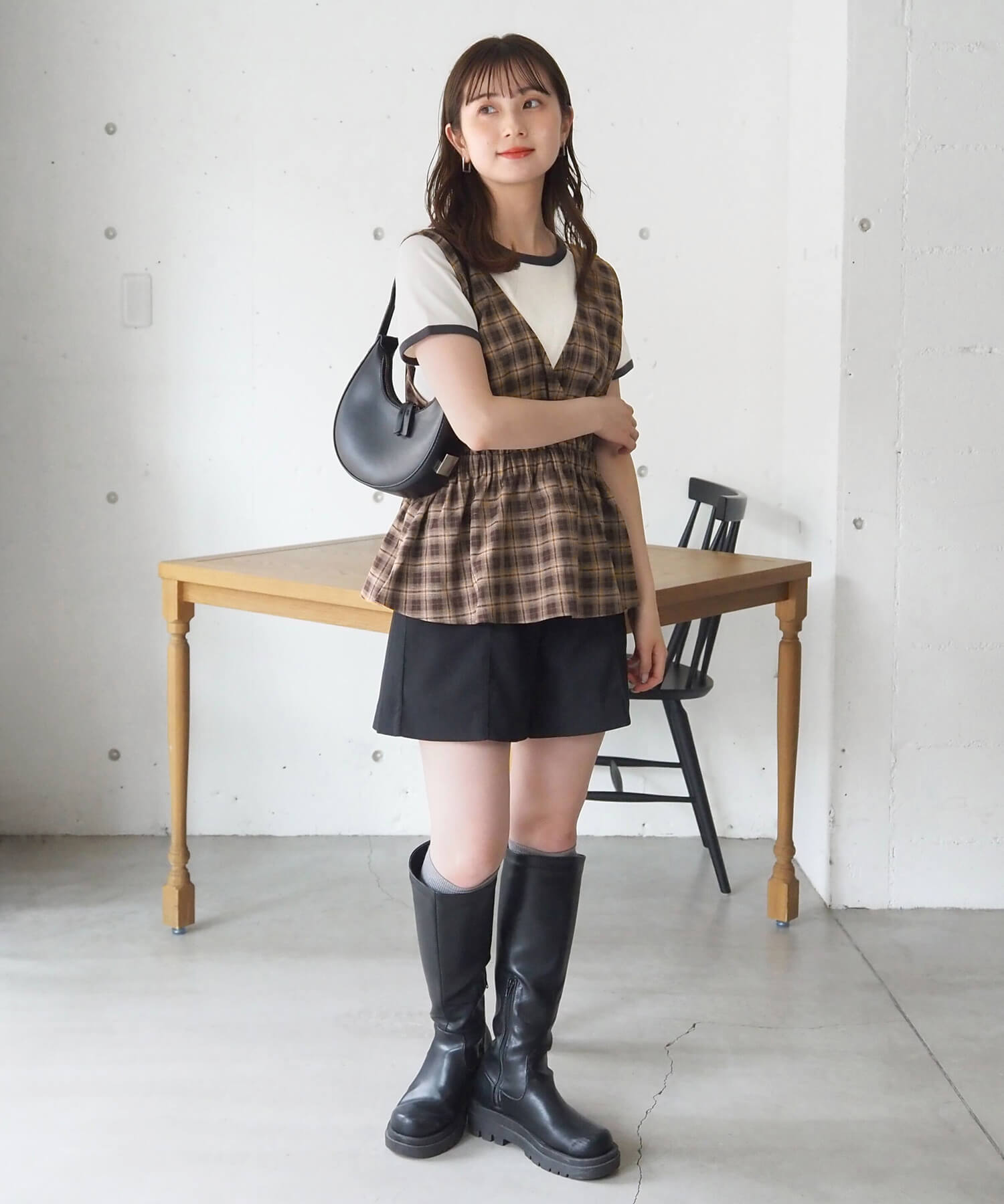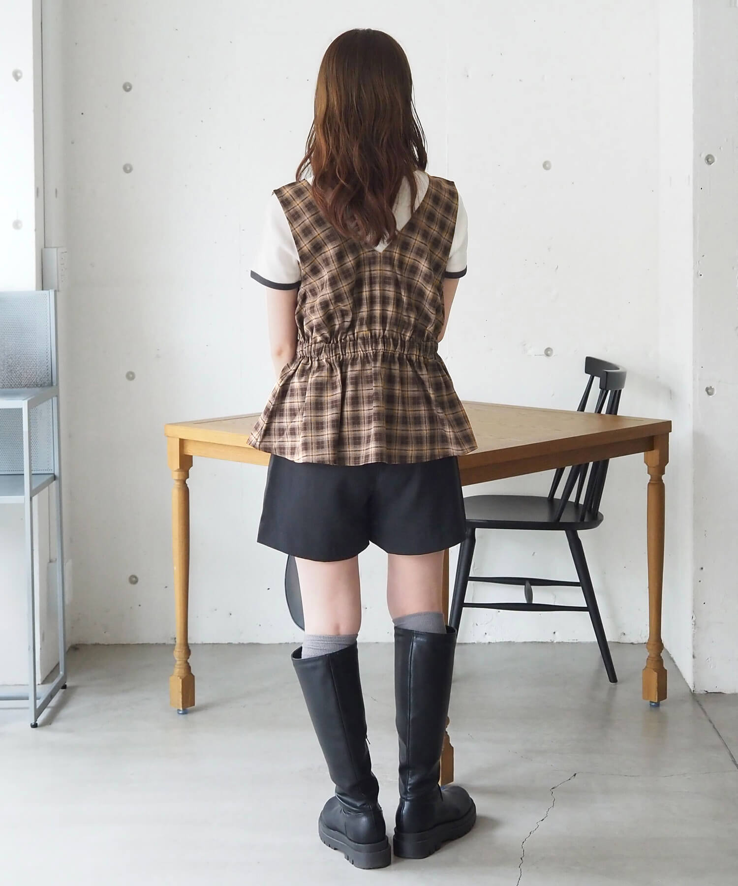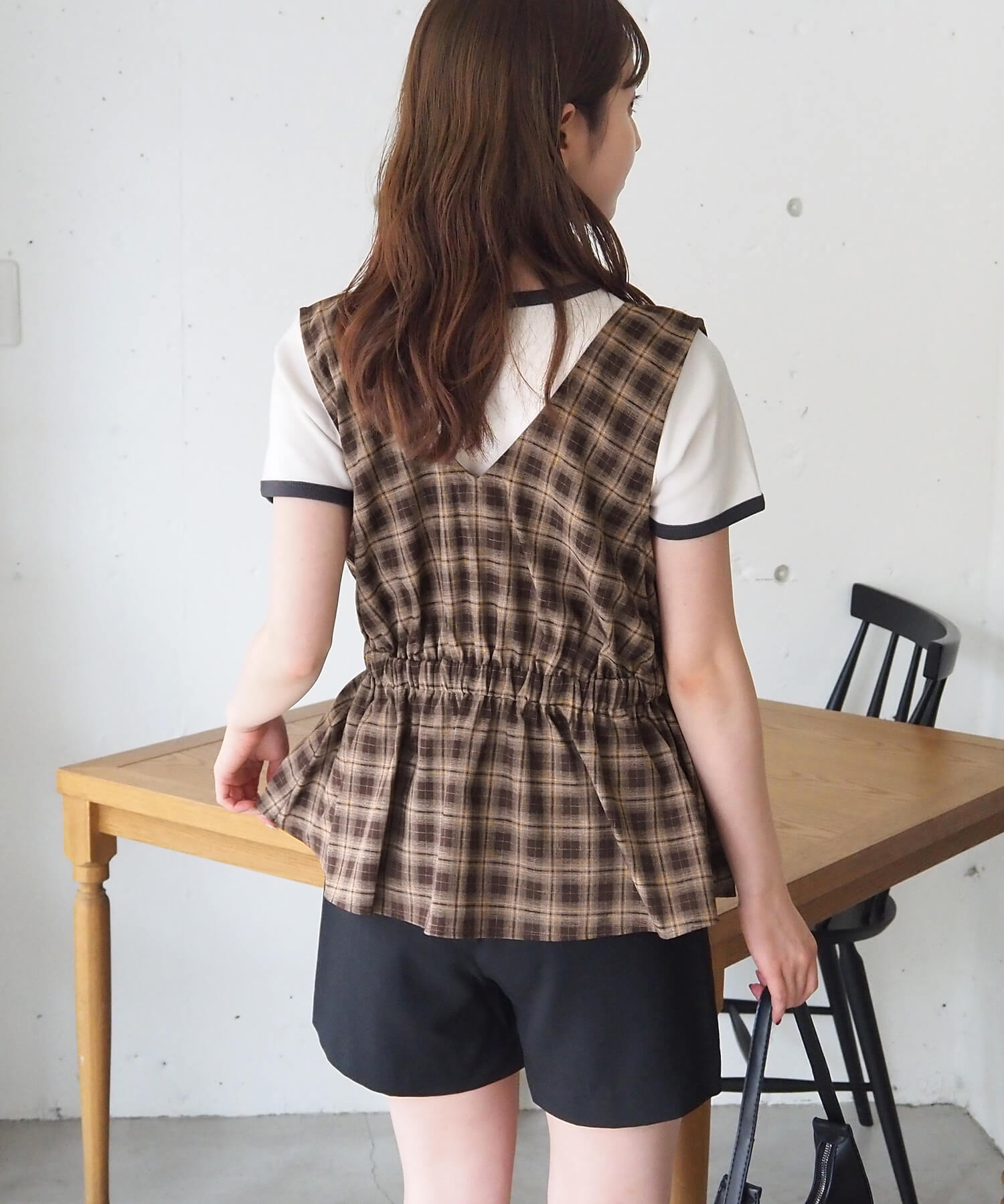 ・落ち着いたカラーの甘過ぎないチェックがオトナカジュアルにぴったりなペプラムベストです。