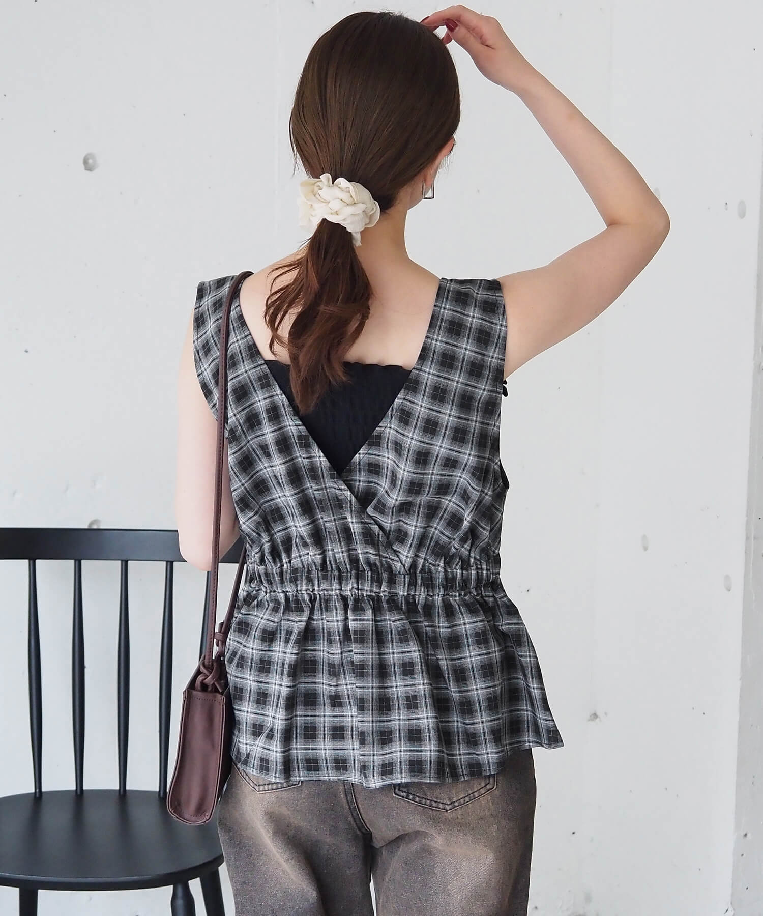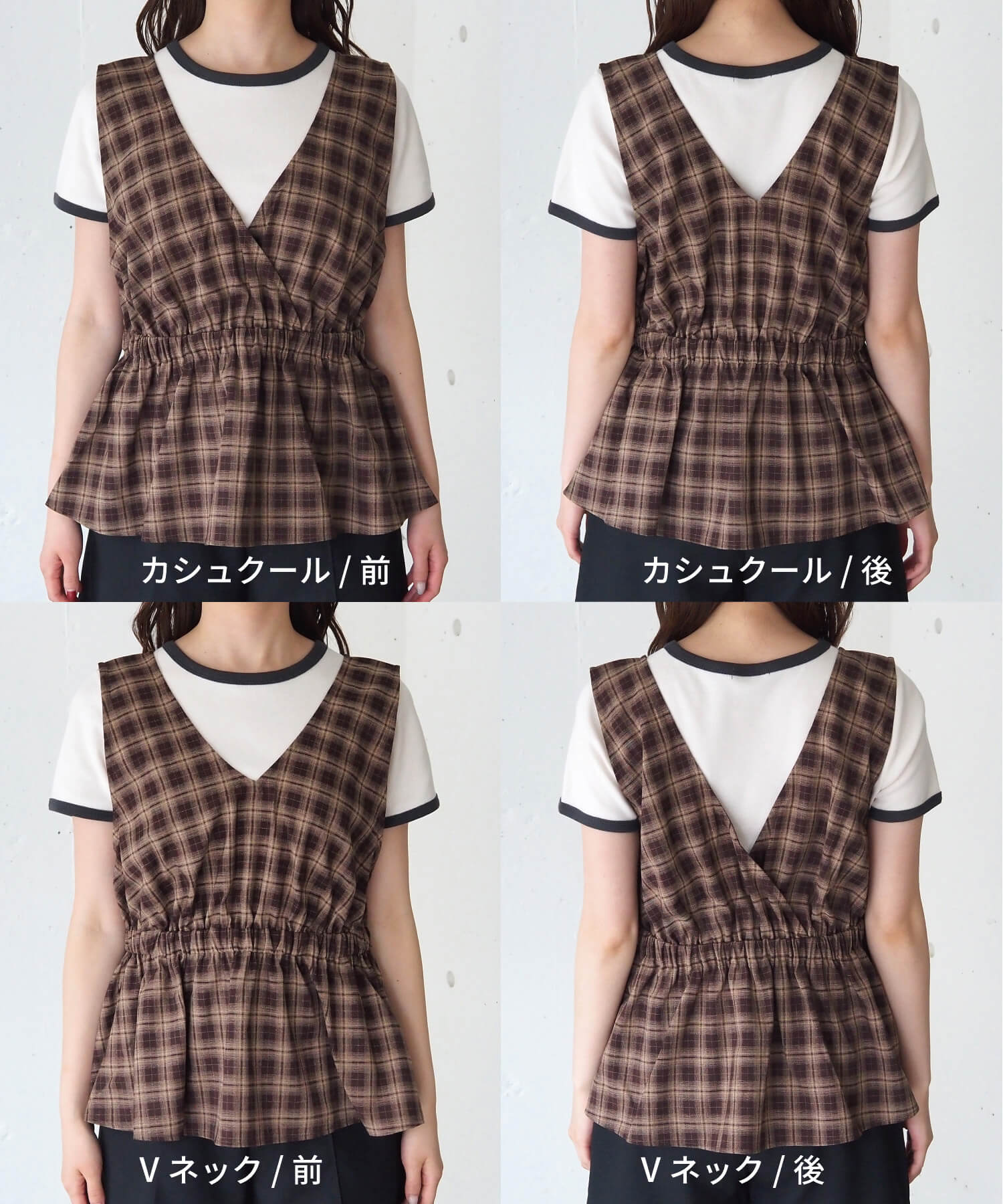 カシュクールとVネック、前後2wayで着られるペプラムベスト
