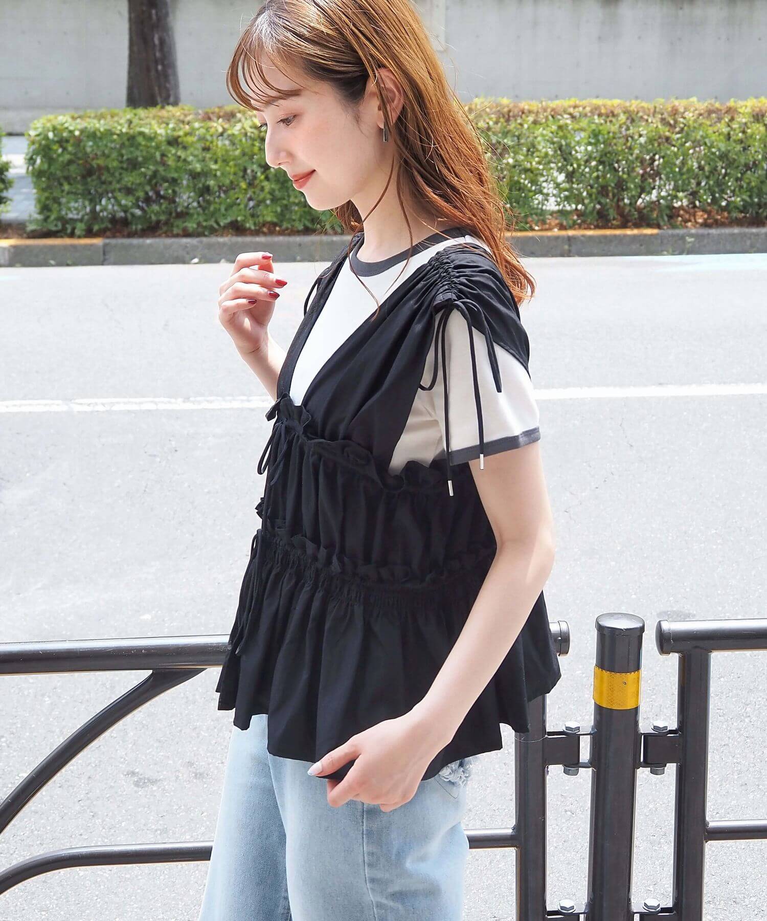 ・ノースリーブインナーで涼しくコーディネート。気になる肩回りをカバーする袖口なので、華奢なノースリーブが苦手な方にもおすすめです。