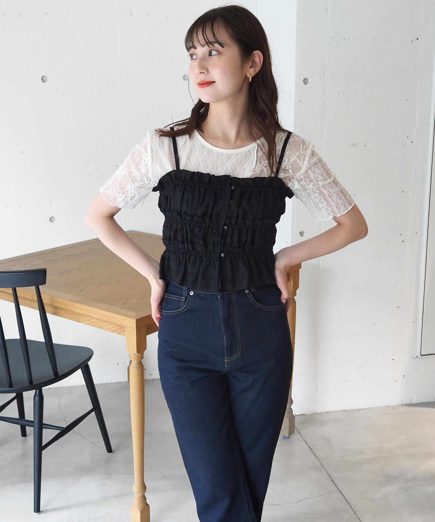 ・キャミビスチェをデニムでカジュアルに。コンパクトに見えるショート丈なので、ワイドシルエットやルーズデニム、ダメージデニムもおすすめです。