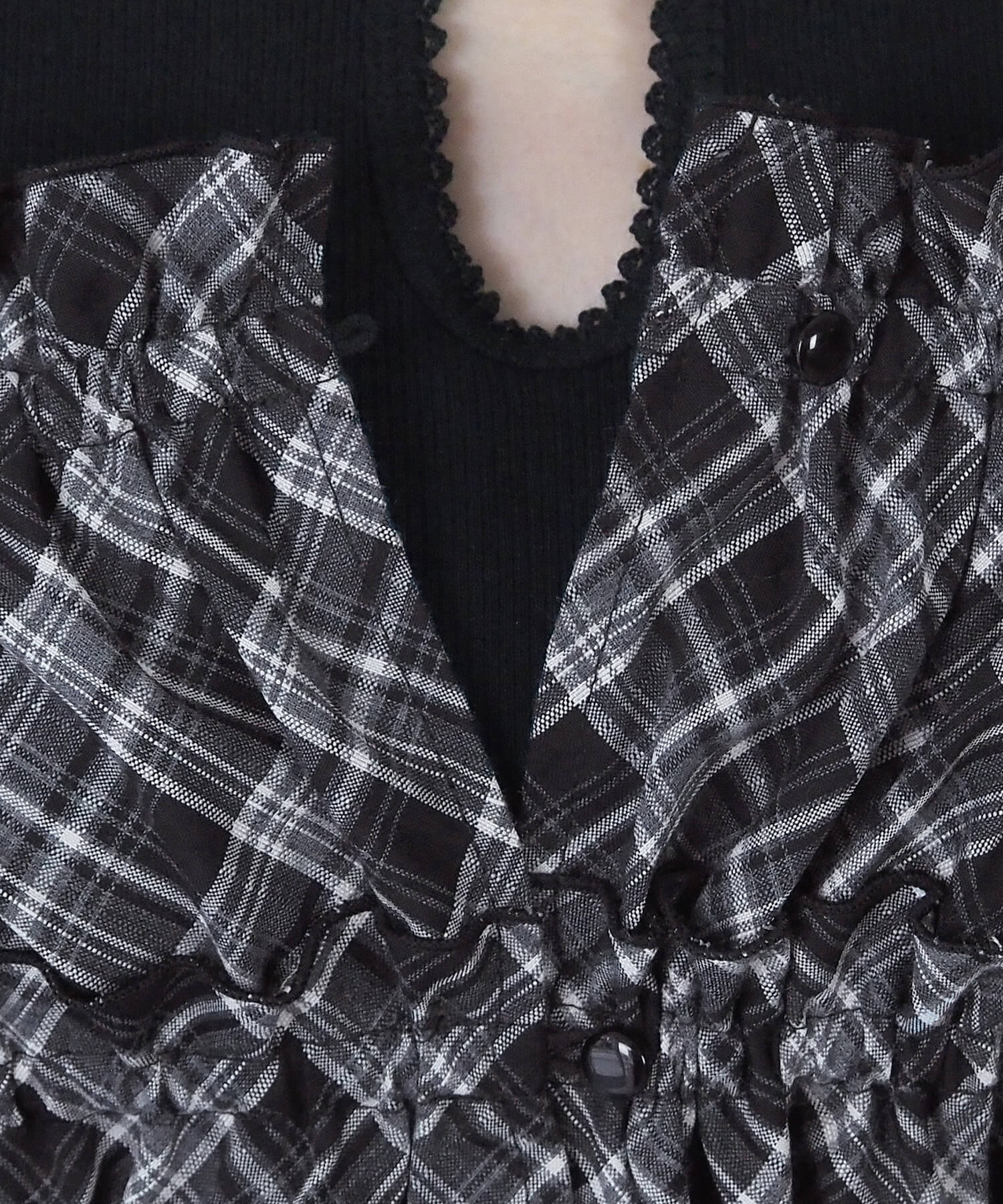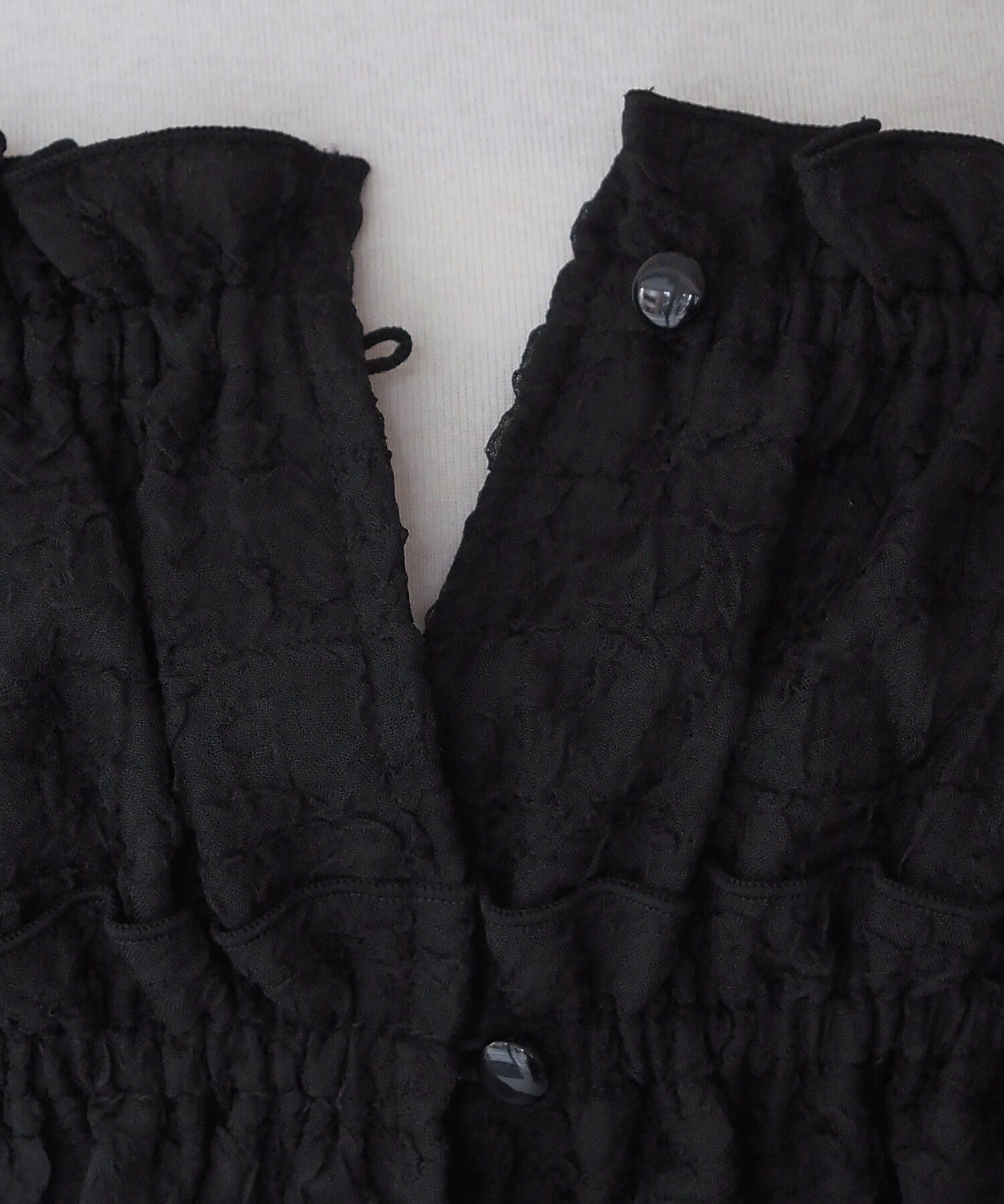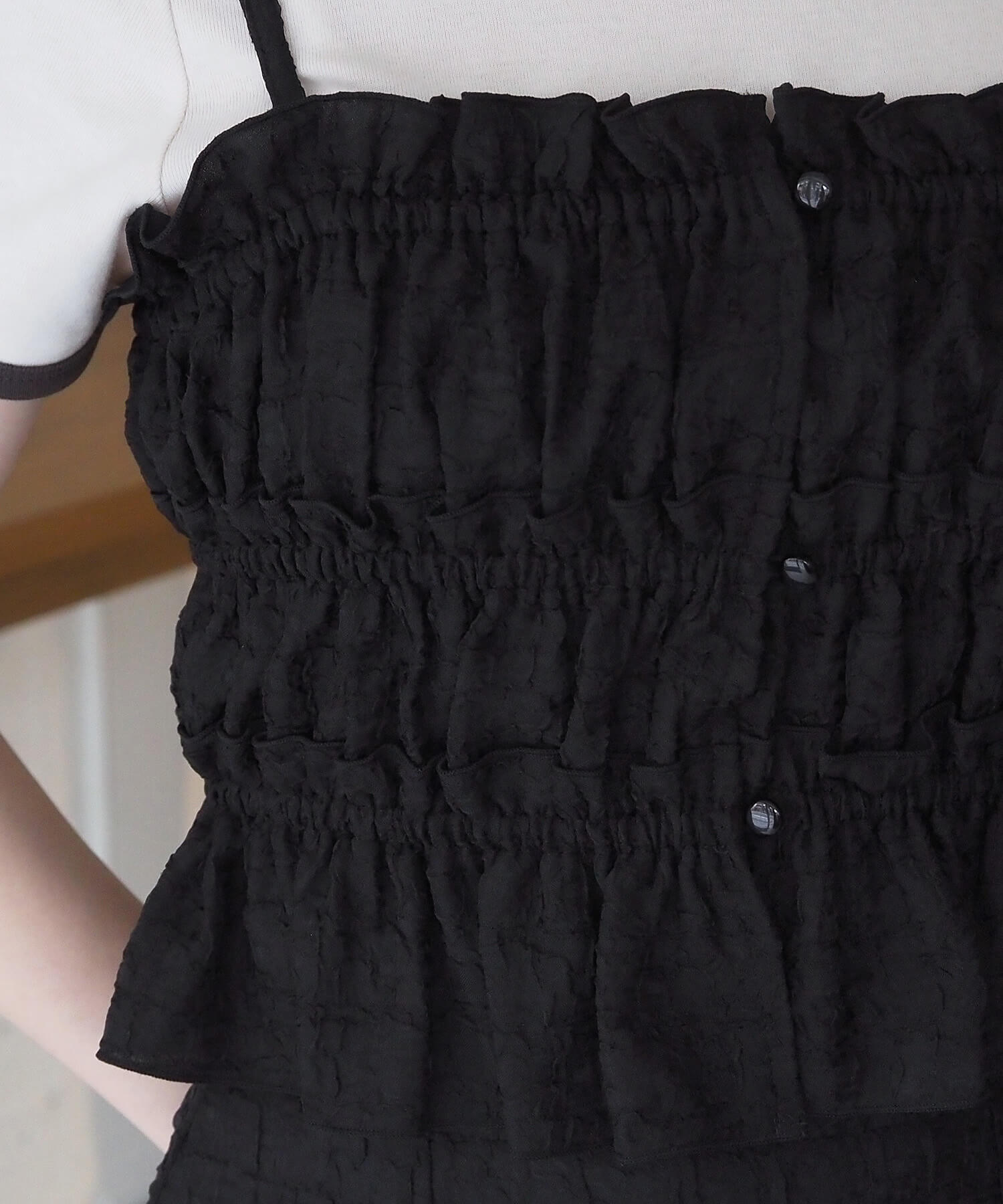 ・ビスチェはたっぷりのギャザーとポイントのフリルが贅沢な1着。トップスだけでも着映えするデザインを目指し、細かなディティールにもこだわりました。