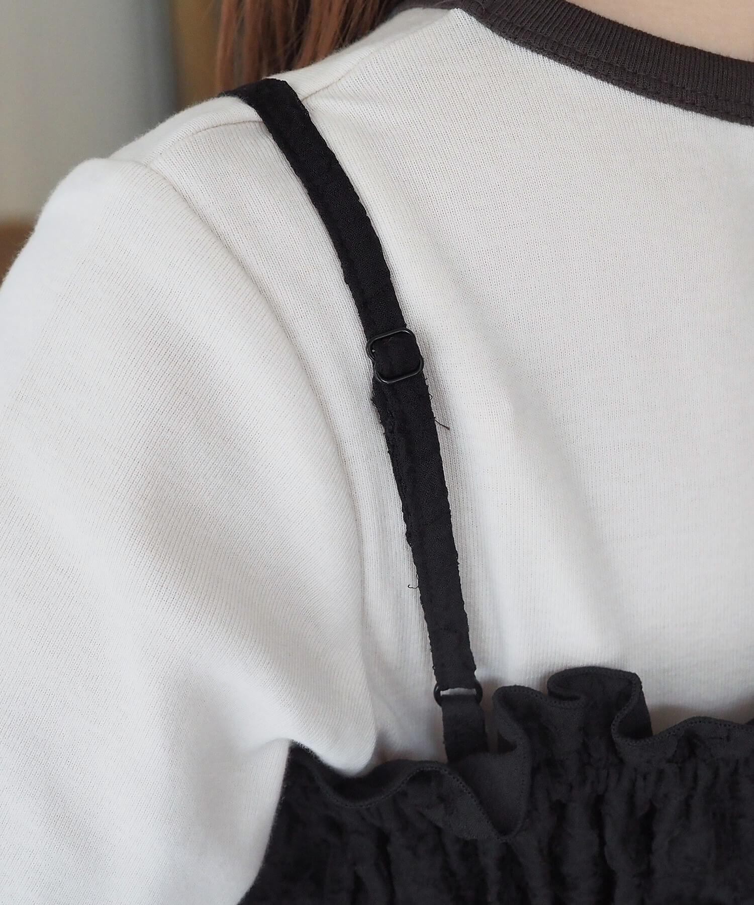 ・セットアップでワンピース風に。キャミインナーでノースリーブで、Tシャツに合わせてジャンパースカート風にカジュアルなコーディネートも楽しめます。