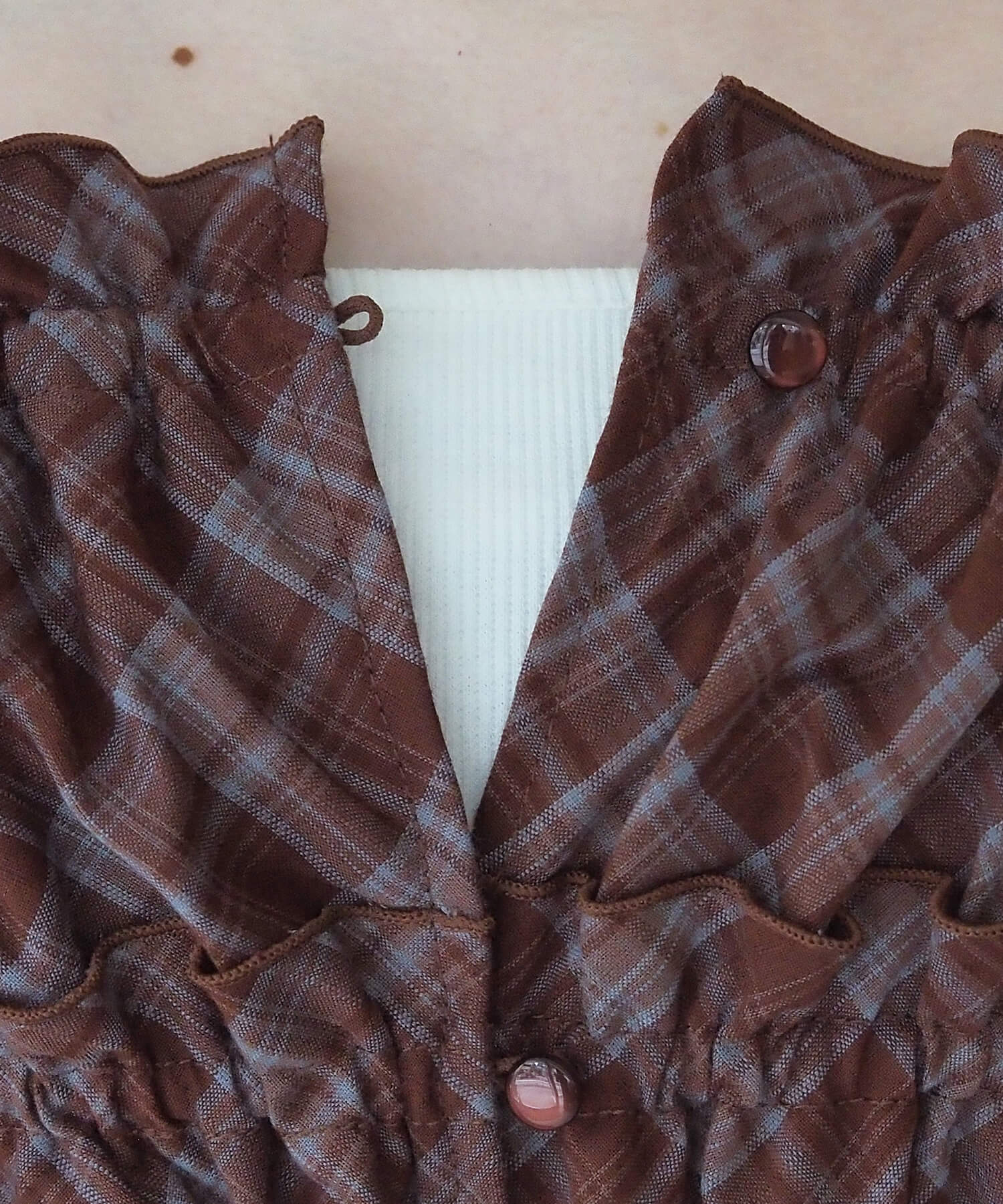 ・シャーリング部分にゴム入り、フロントボタンでも着脱可能。肩ひもはアジャスター付きです。