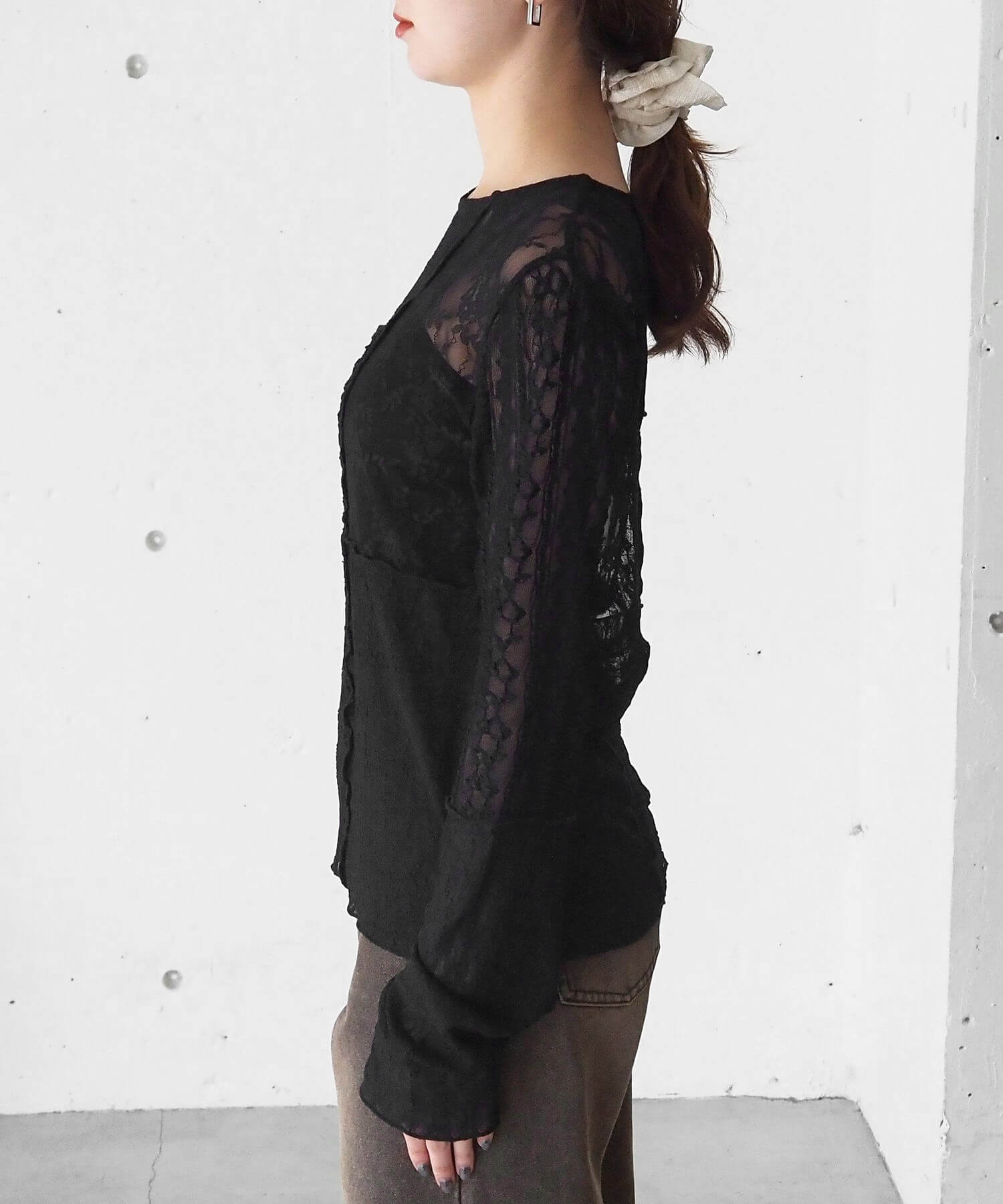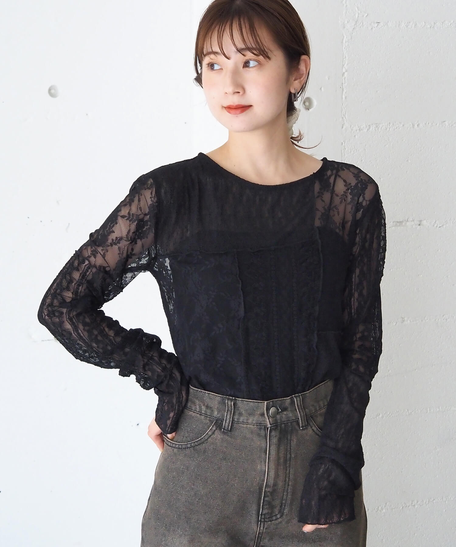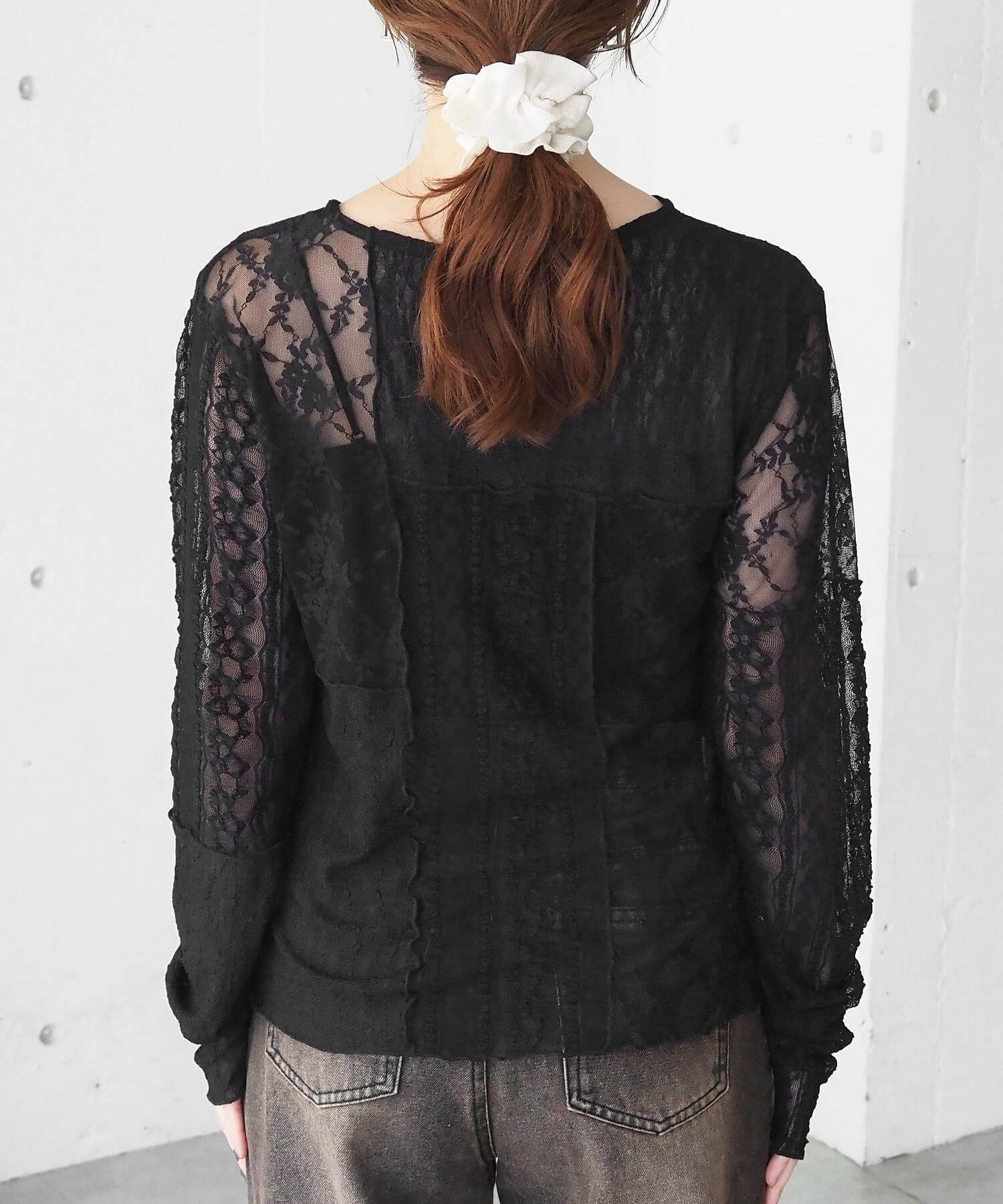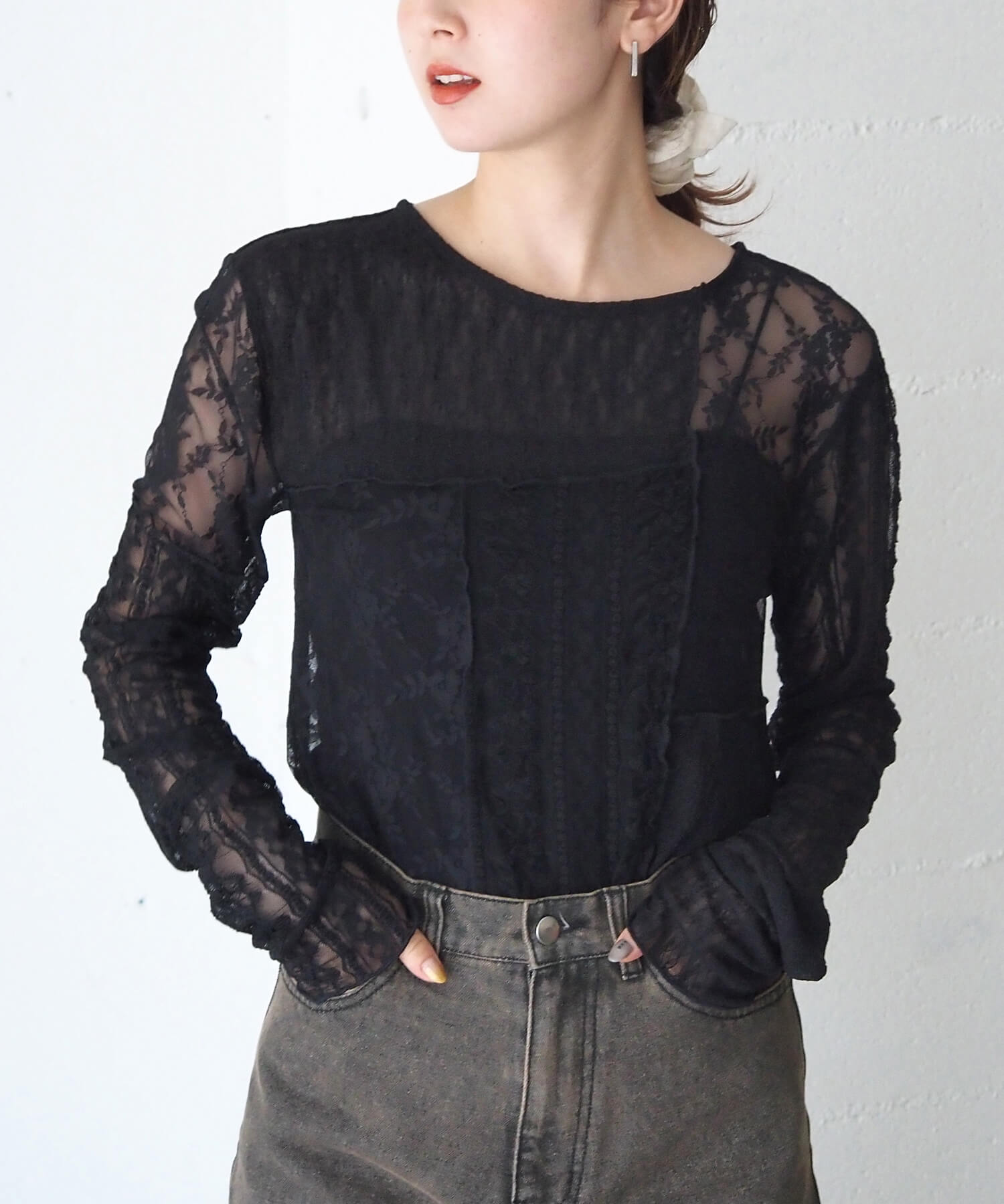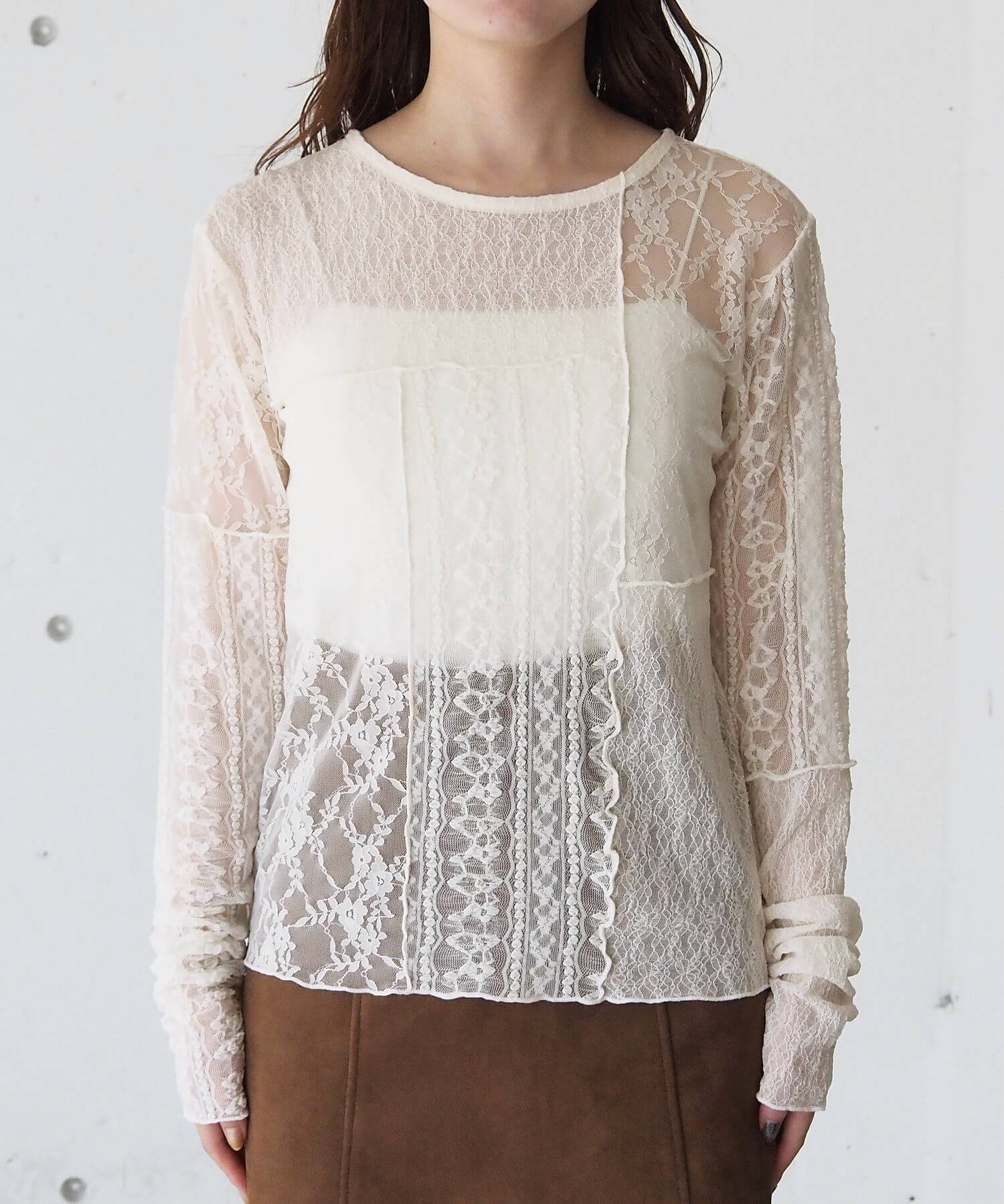 ・ストライプ柄/格子柄/小花柄、異なる3種類のレースを組み合わせた長袖シアートップスです。