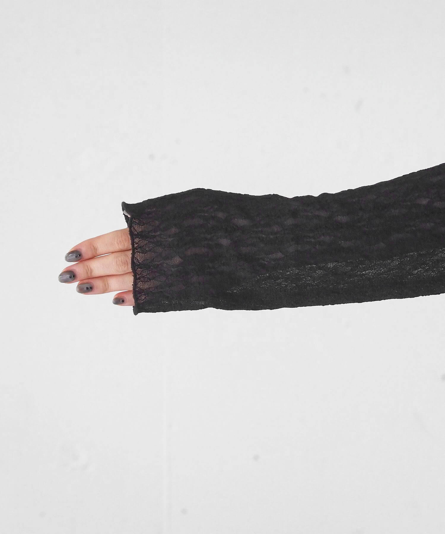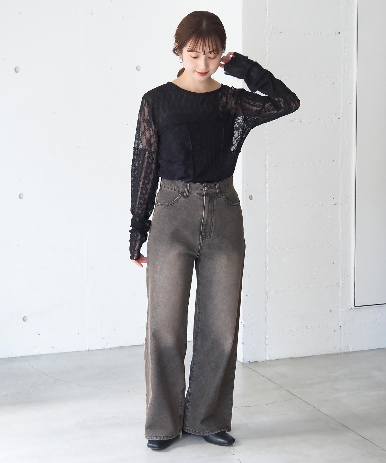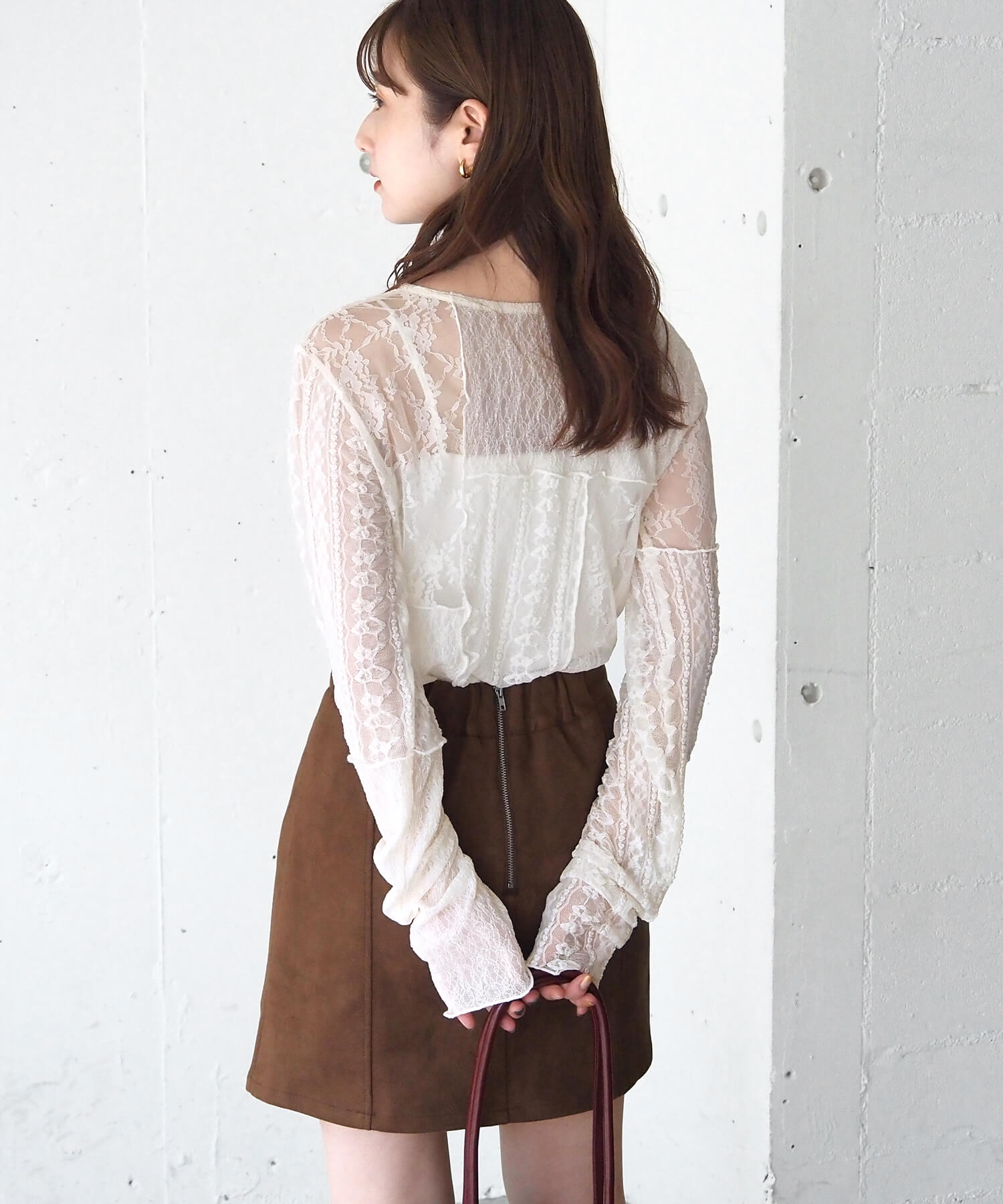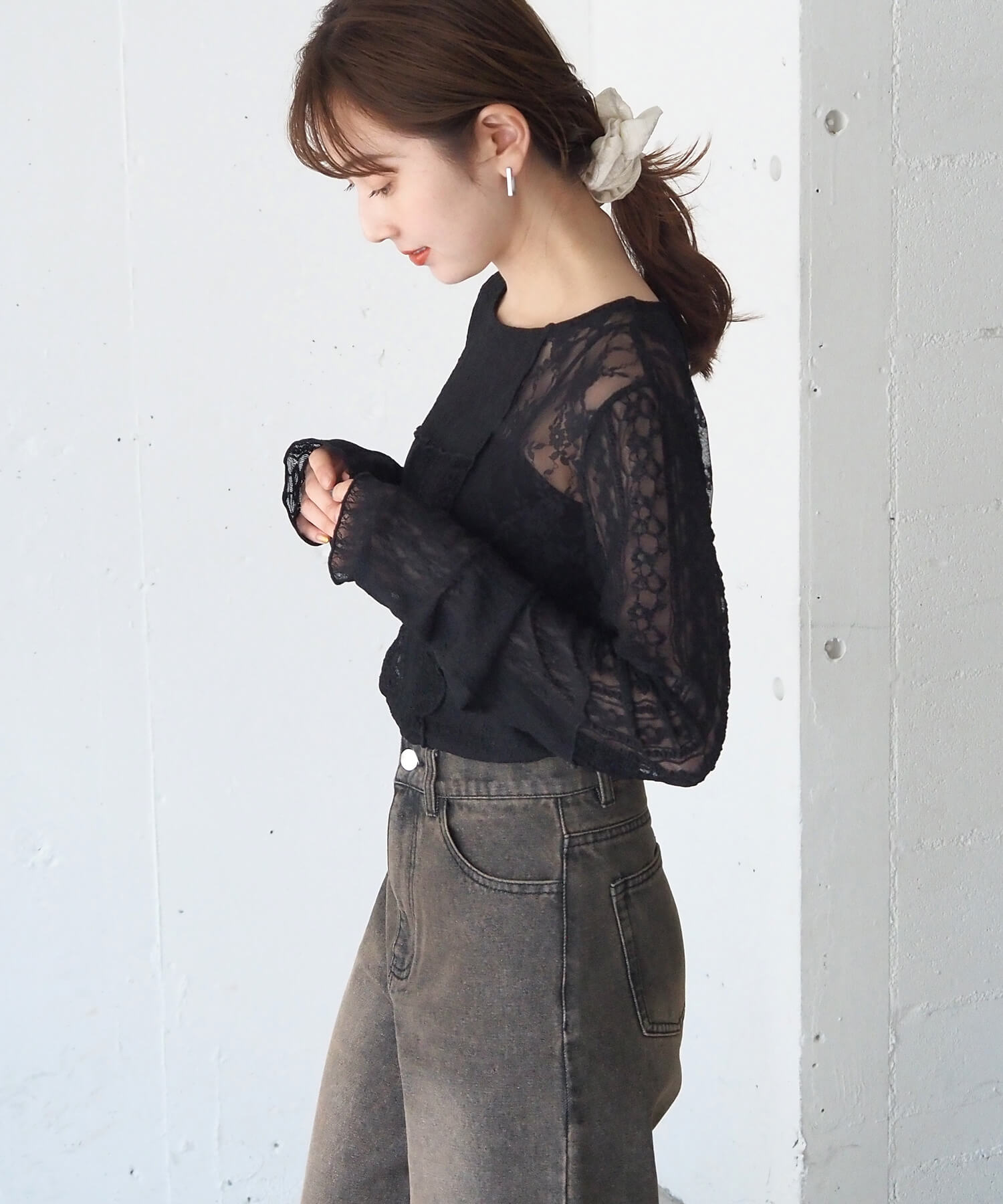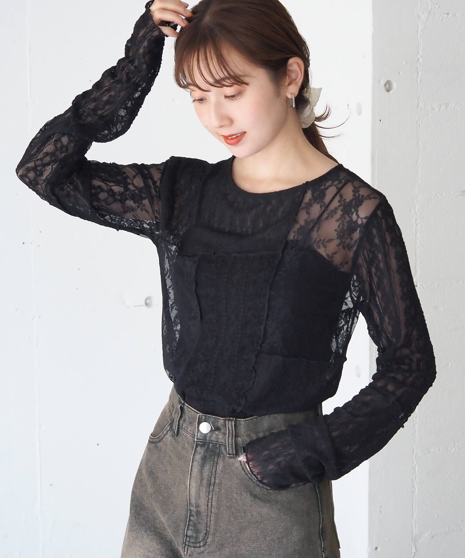 ・ストライプ柄/格子柄/小花柄、異なる3種類のレースを組み合わせた長袖シアートップスです。