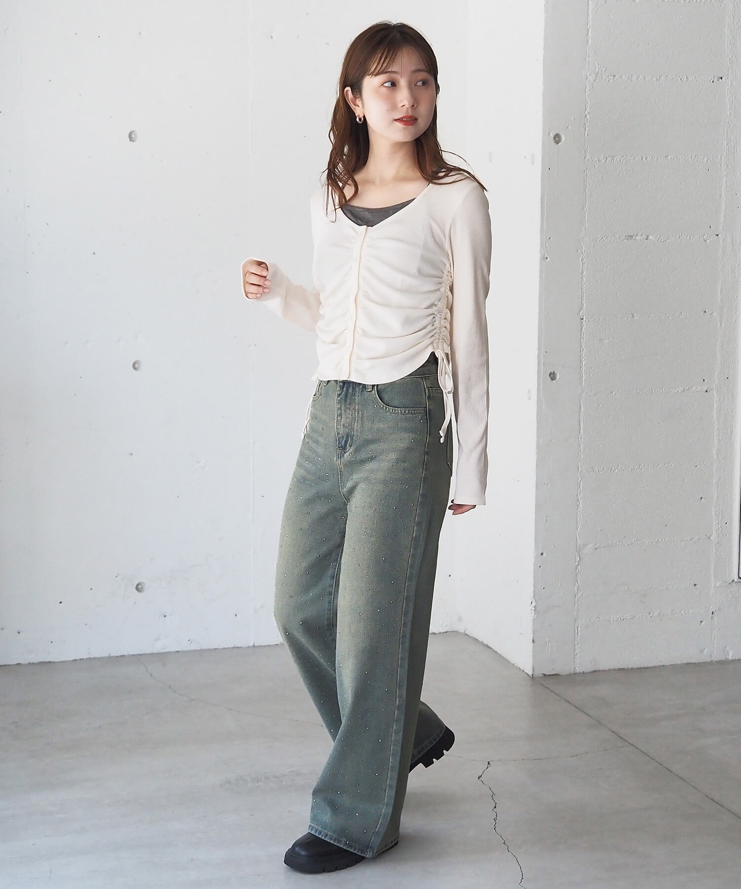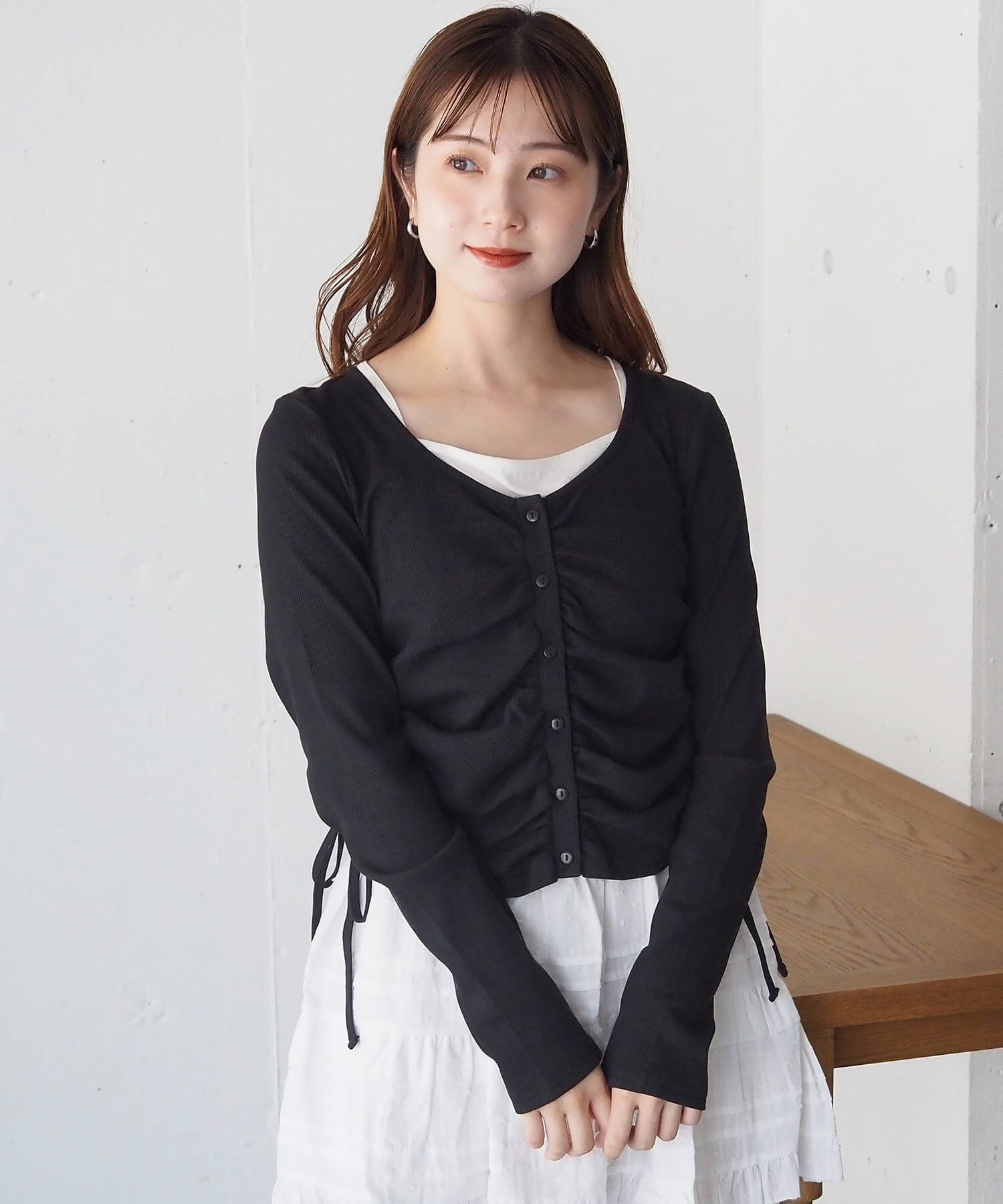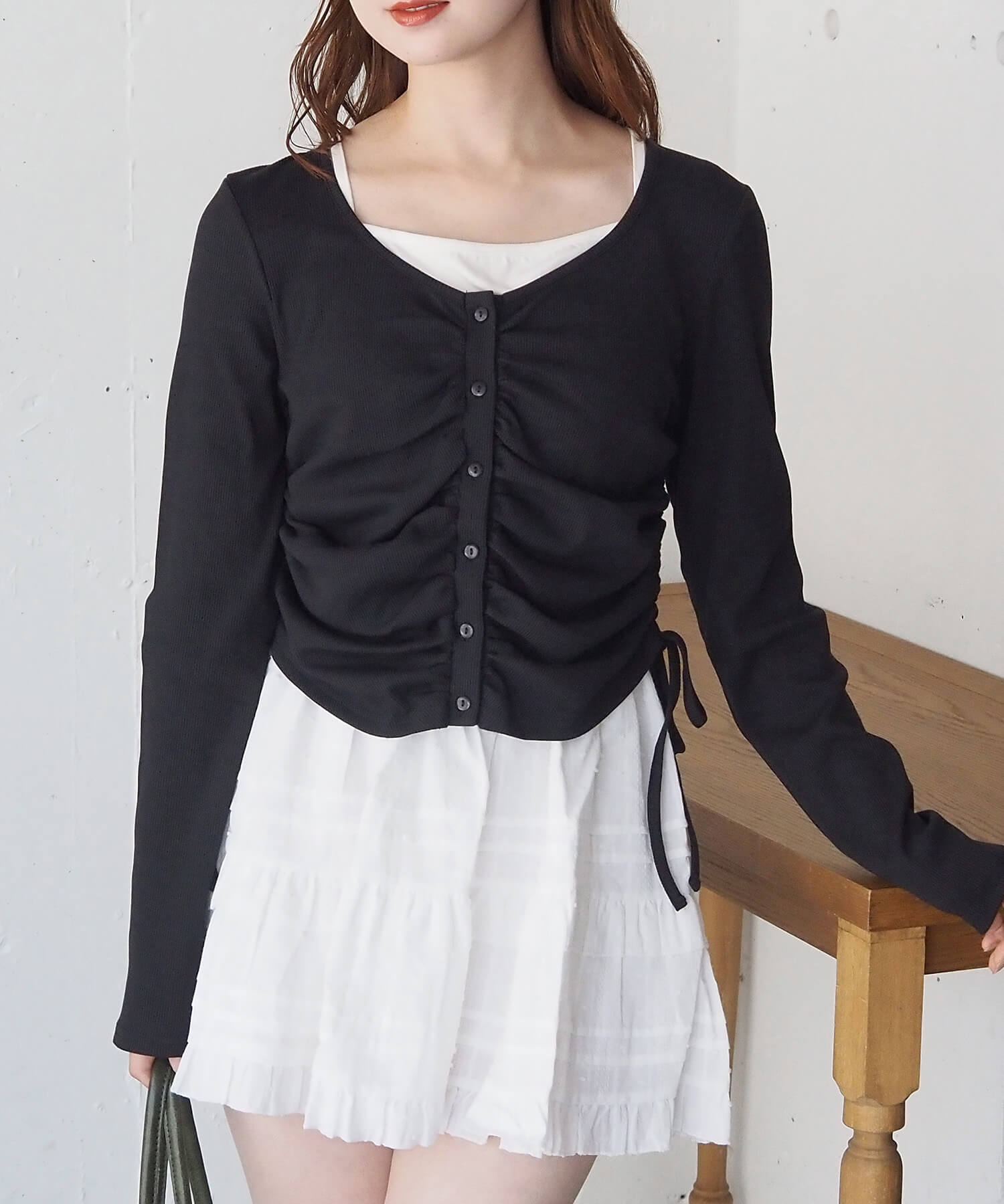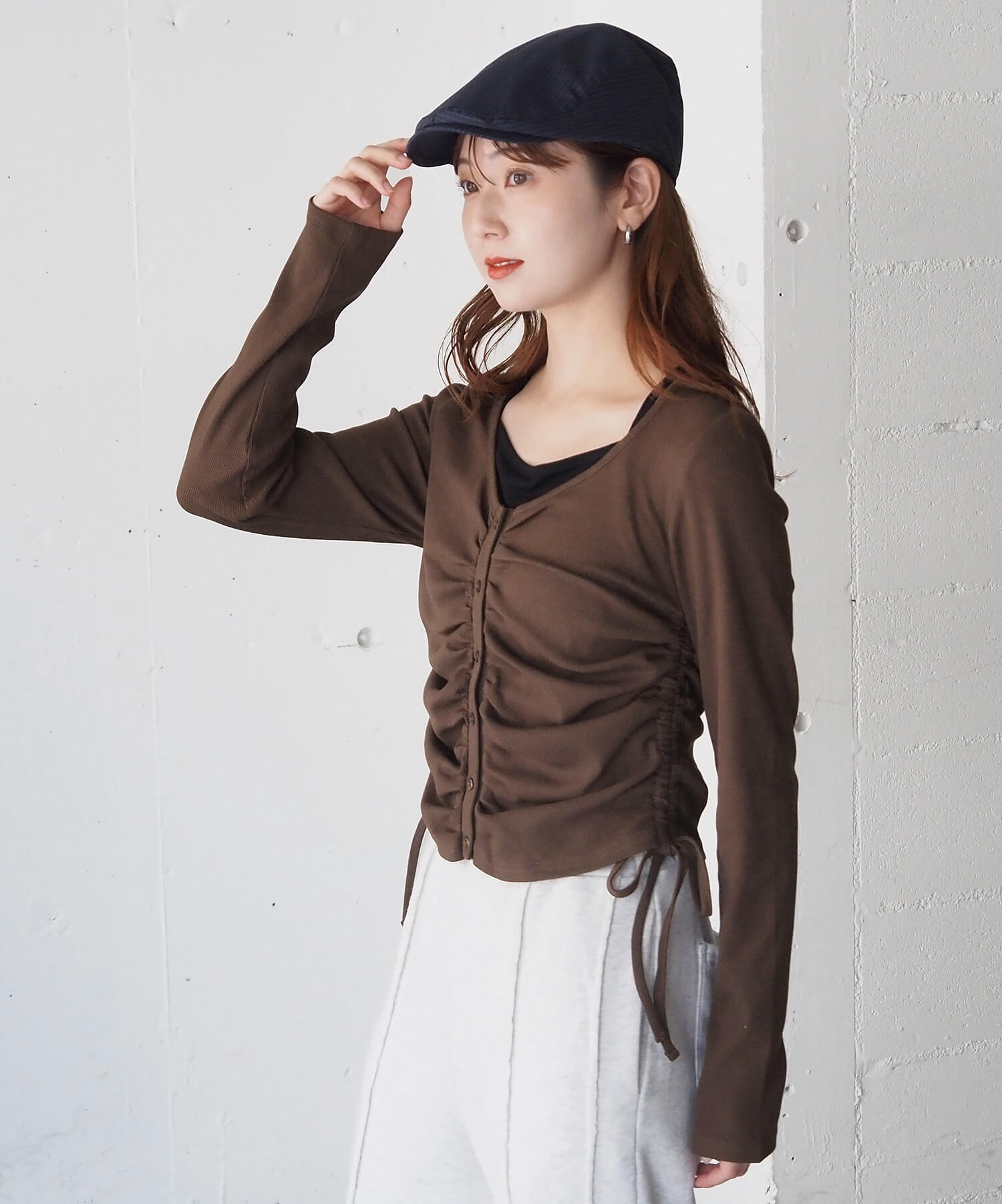 ・サイドのドロストとフロントのギャザーでトレンド感と着痩せ効果も抜かりなく◎