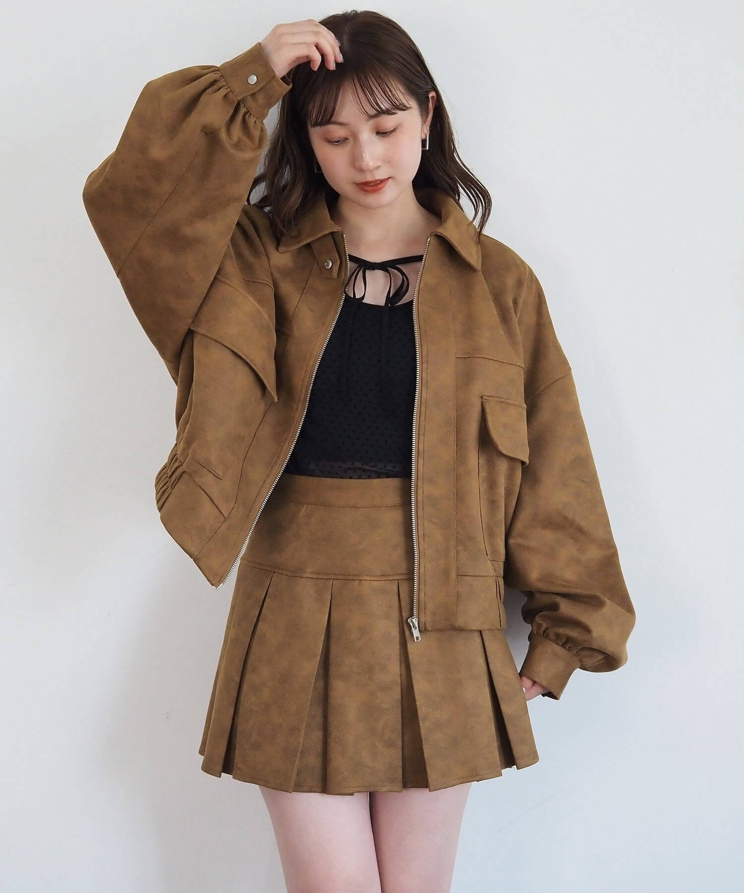 ・同生地のビッグショート合皮ブルゾン(品番:1760246493)と人気のセットアップコーデに。ブルゾンは丈違いで色違いを揃えるのもおすすめです。