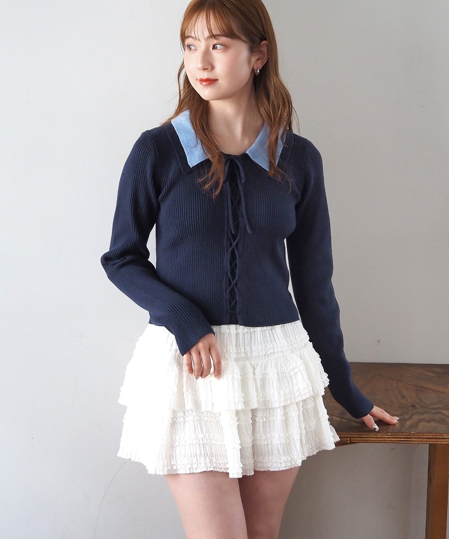 [新色登場] 前レースアップ襟付きニットプルオーバー