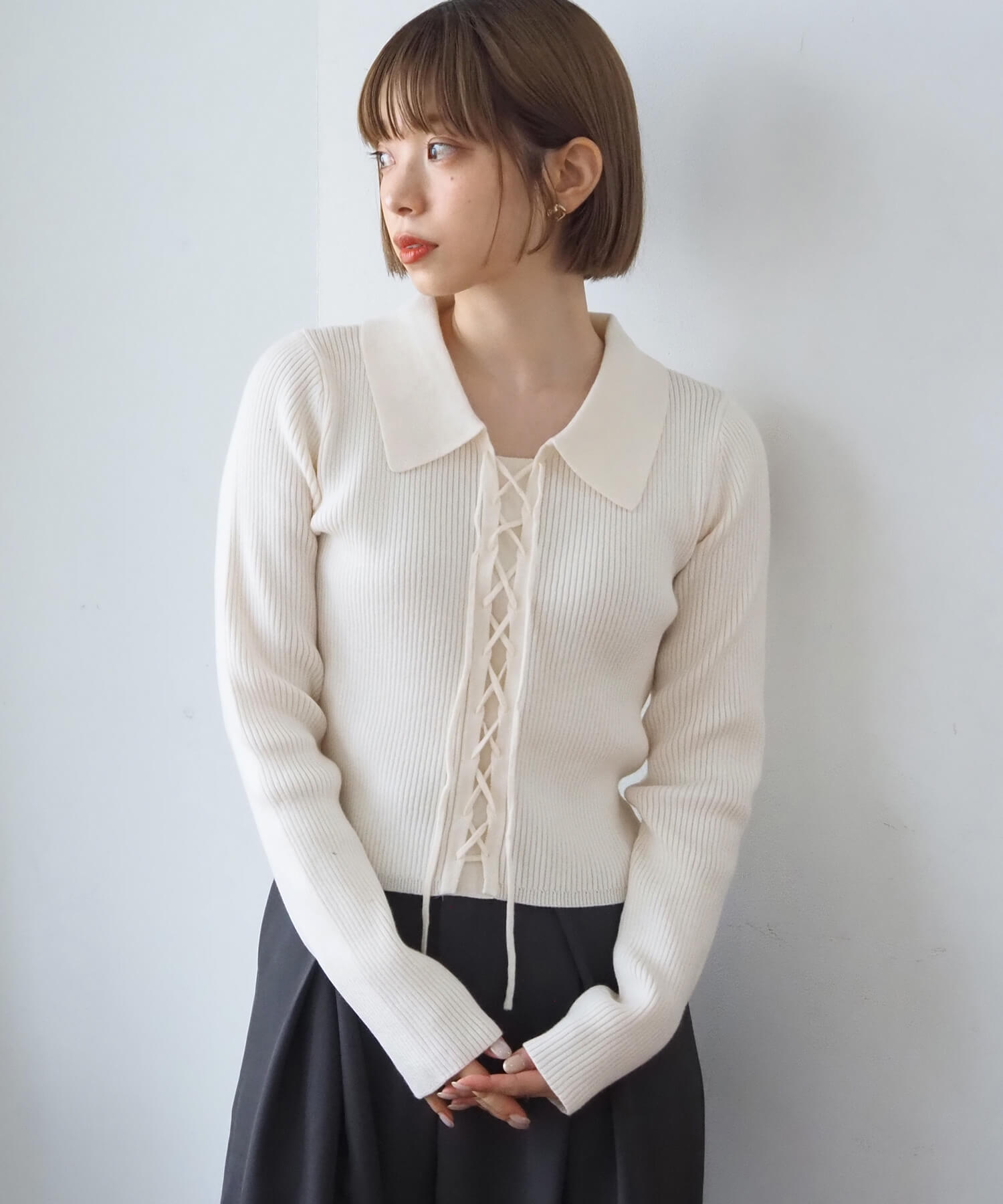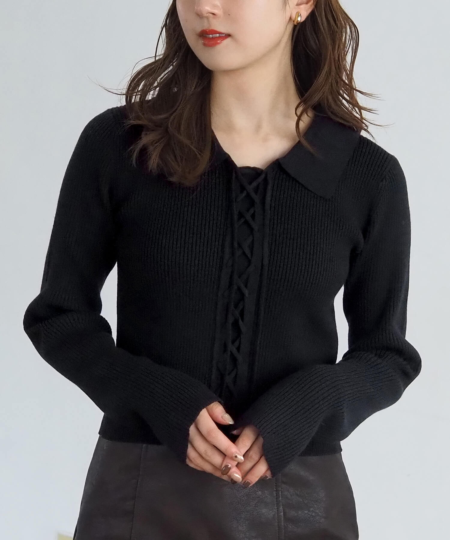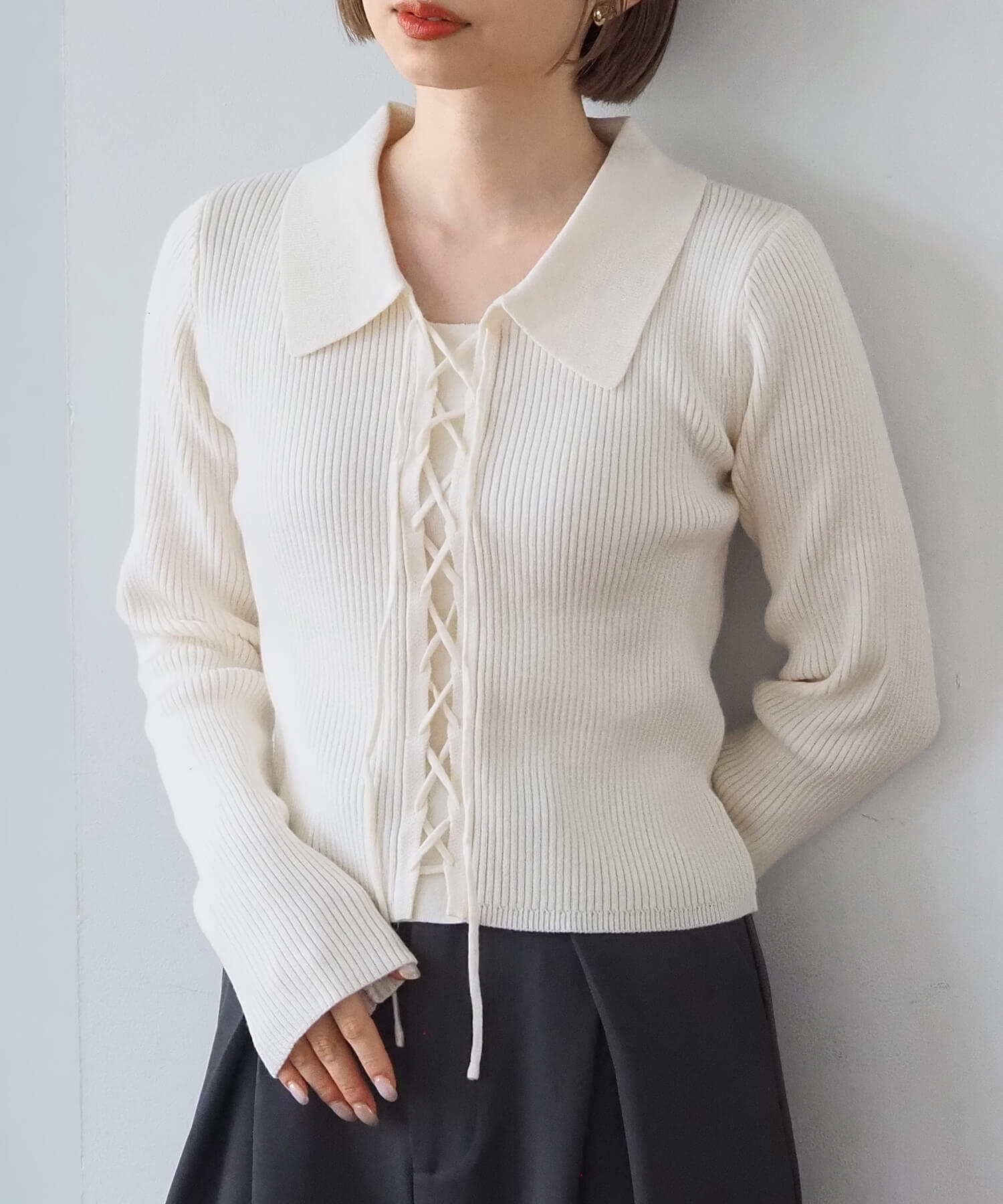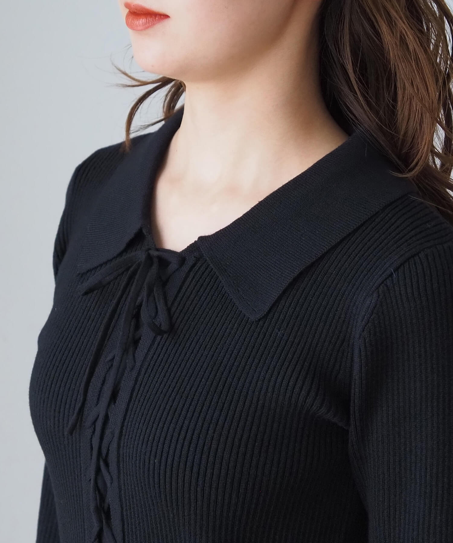前レースアップ襟付きニットプルオーバー