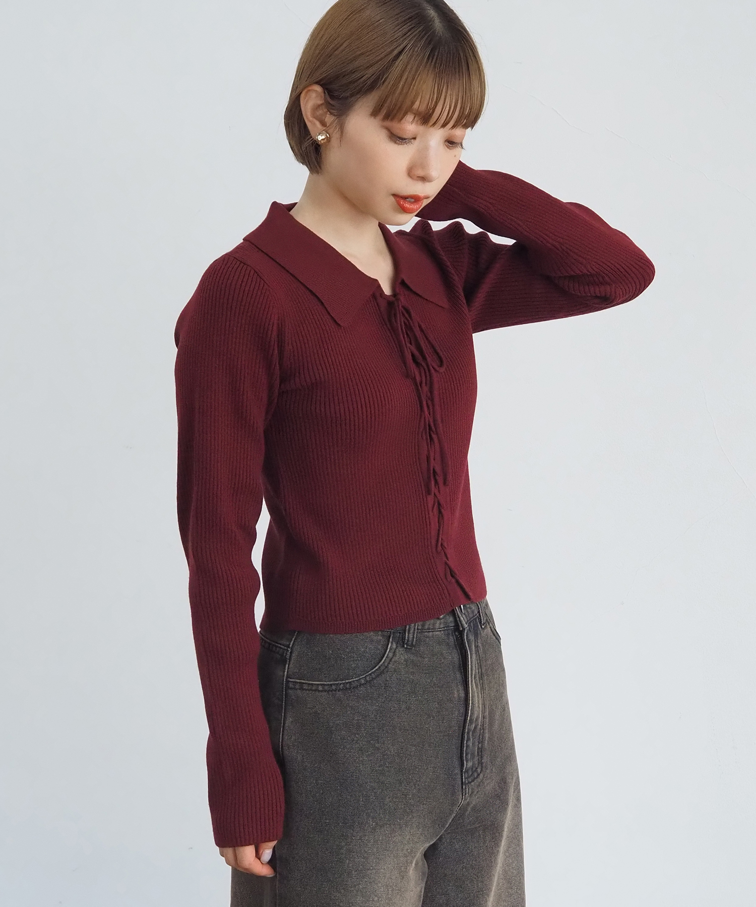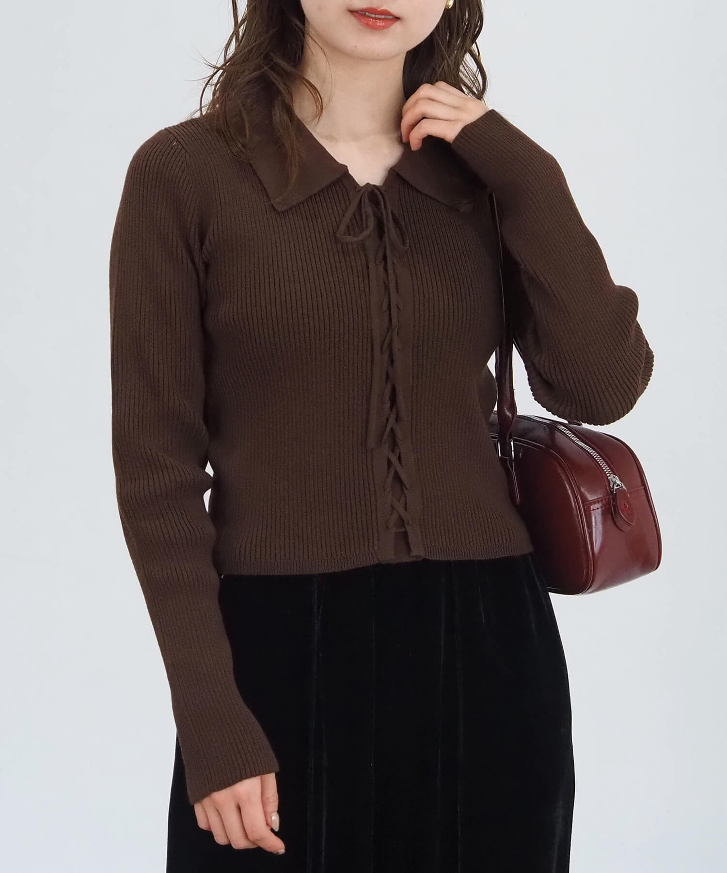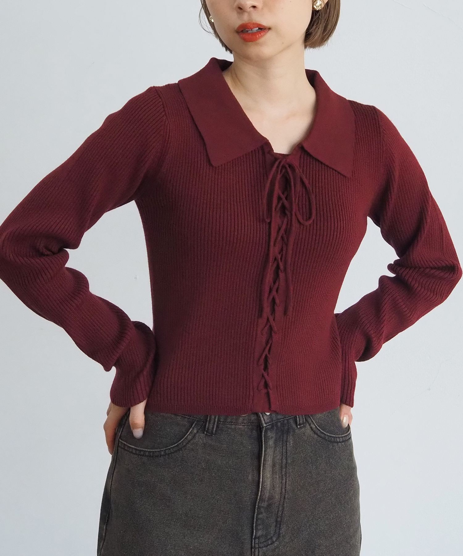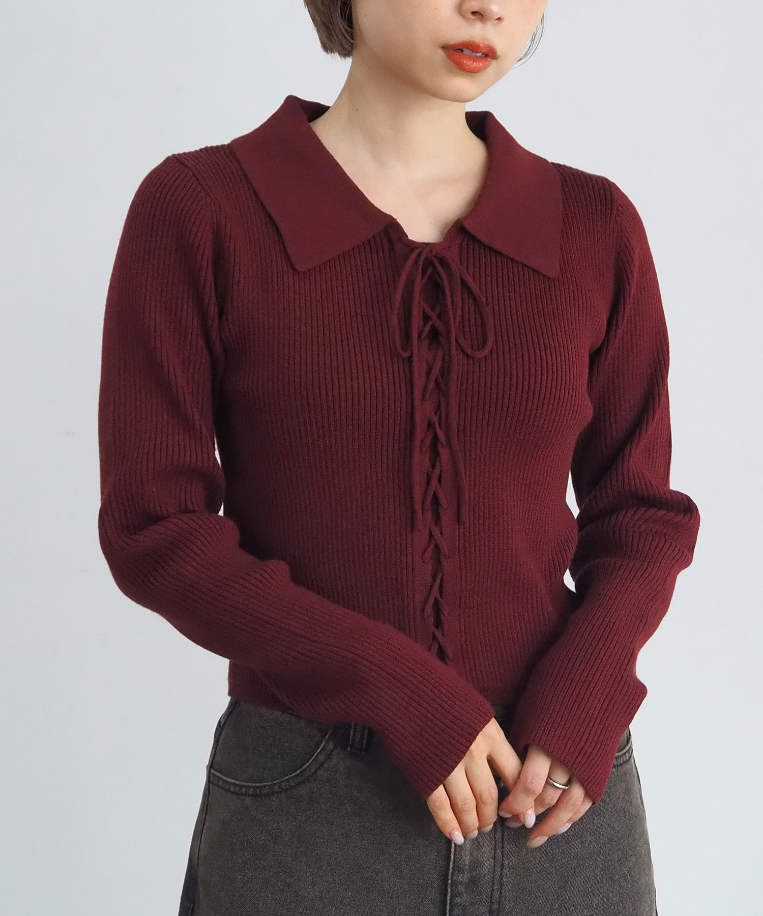 前レースアップ襟付きニットプルオーバー