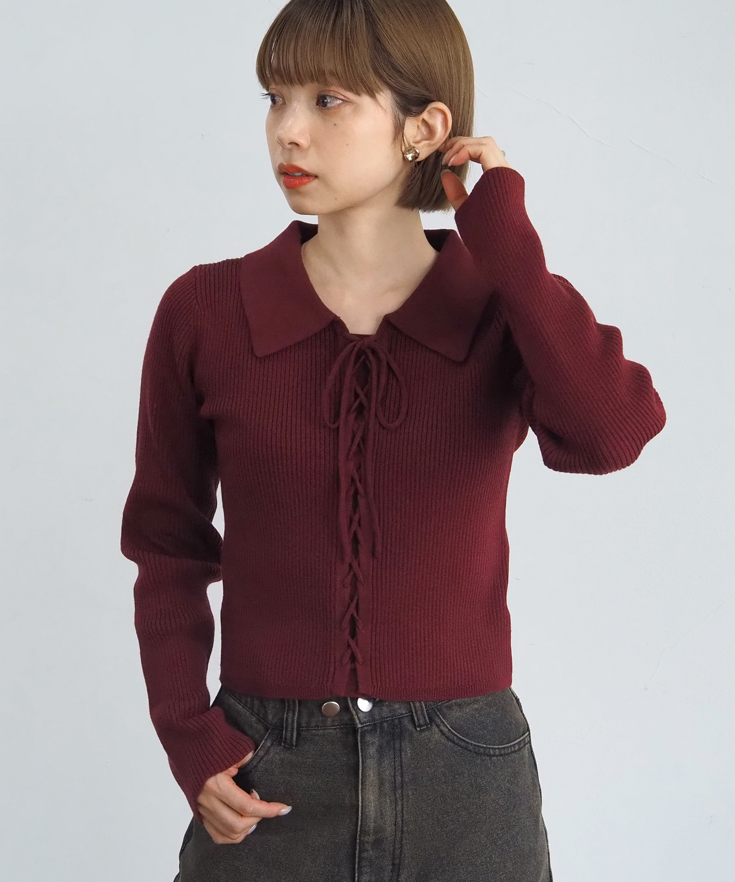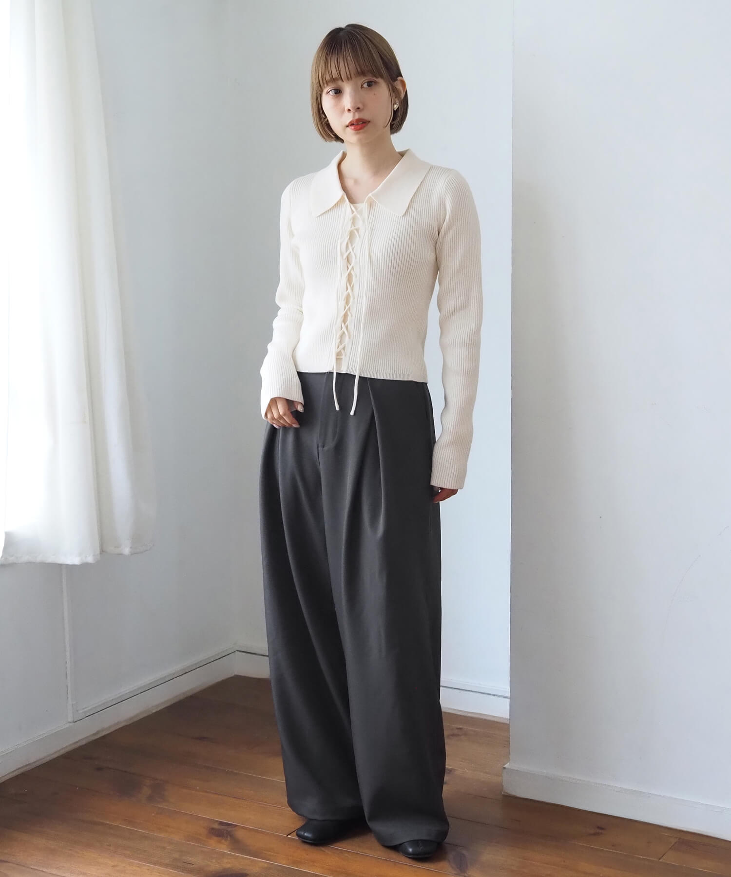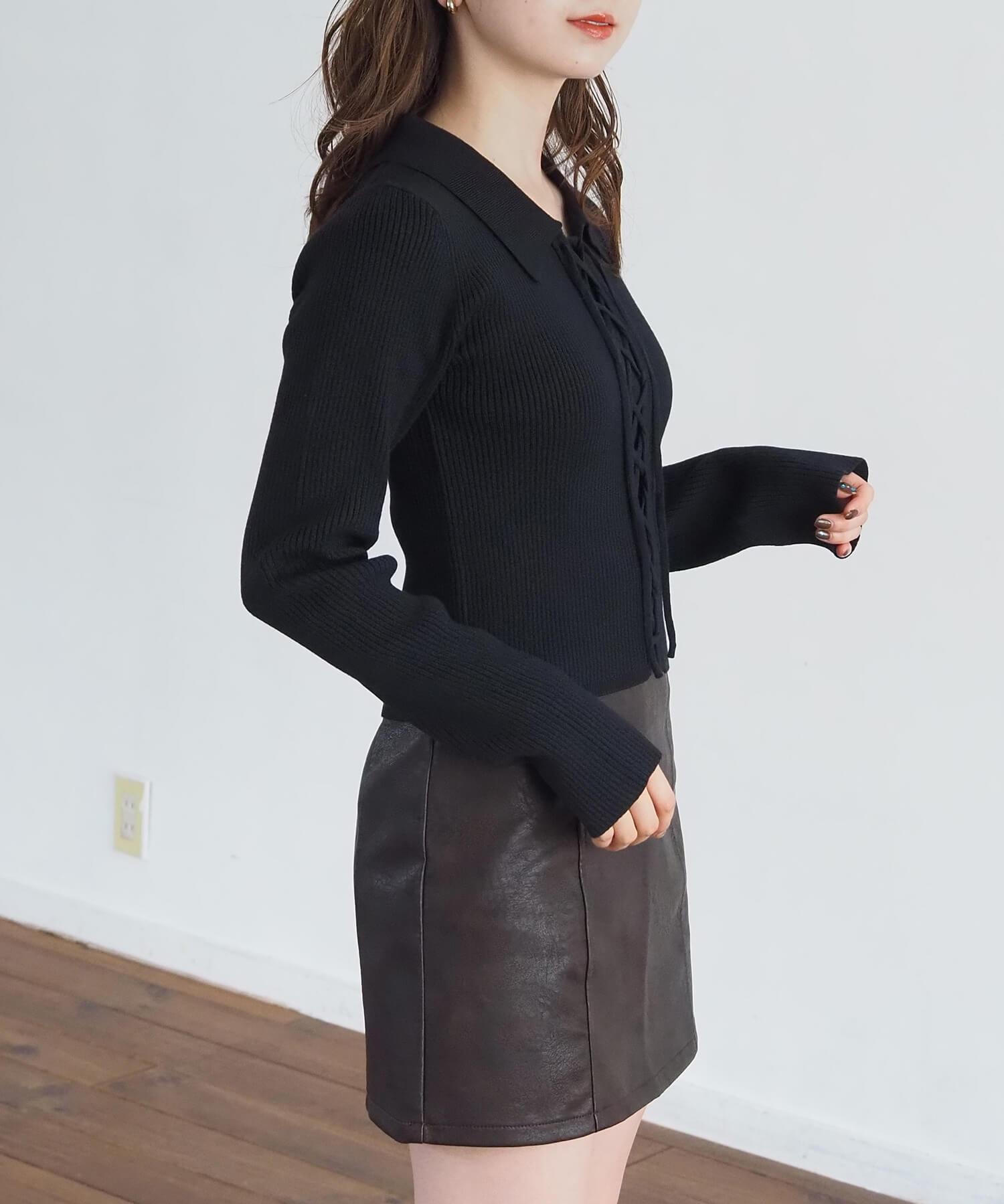 ・レースアップ部分は好みでアレンジができるので、ラフに垂らしてクールな着こなしもおすすめです。