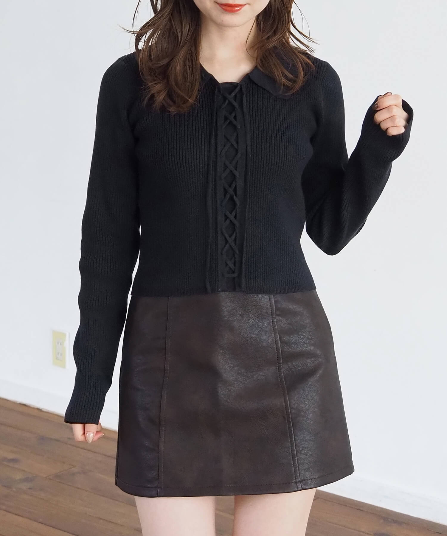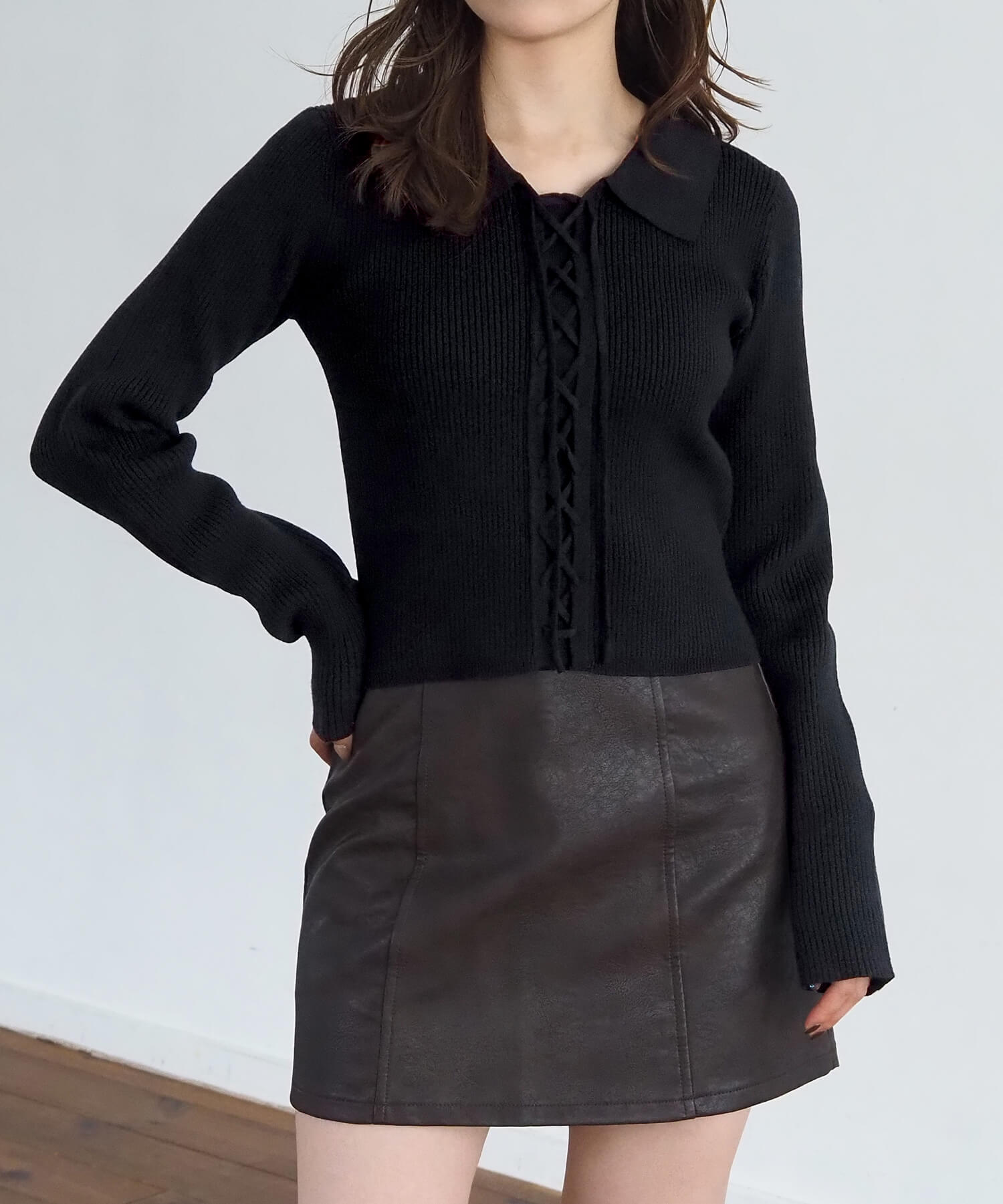・シャツライクな襟とレースアップが着映えポイント。