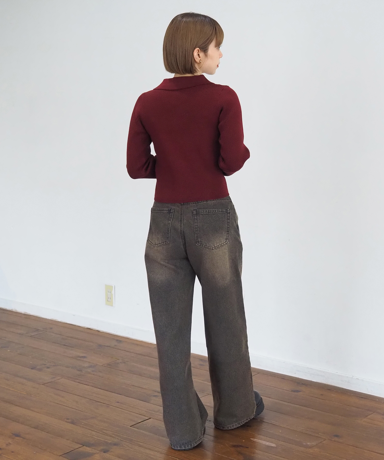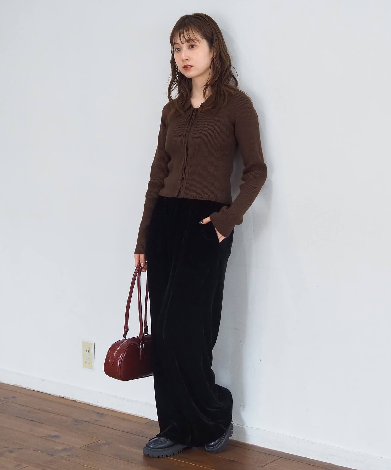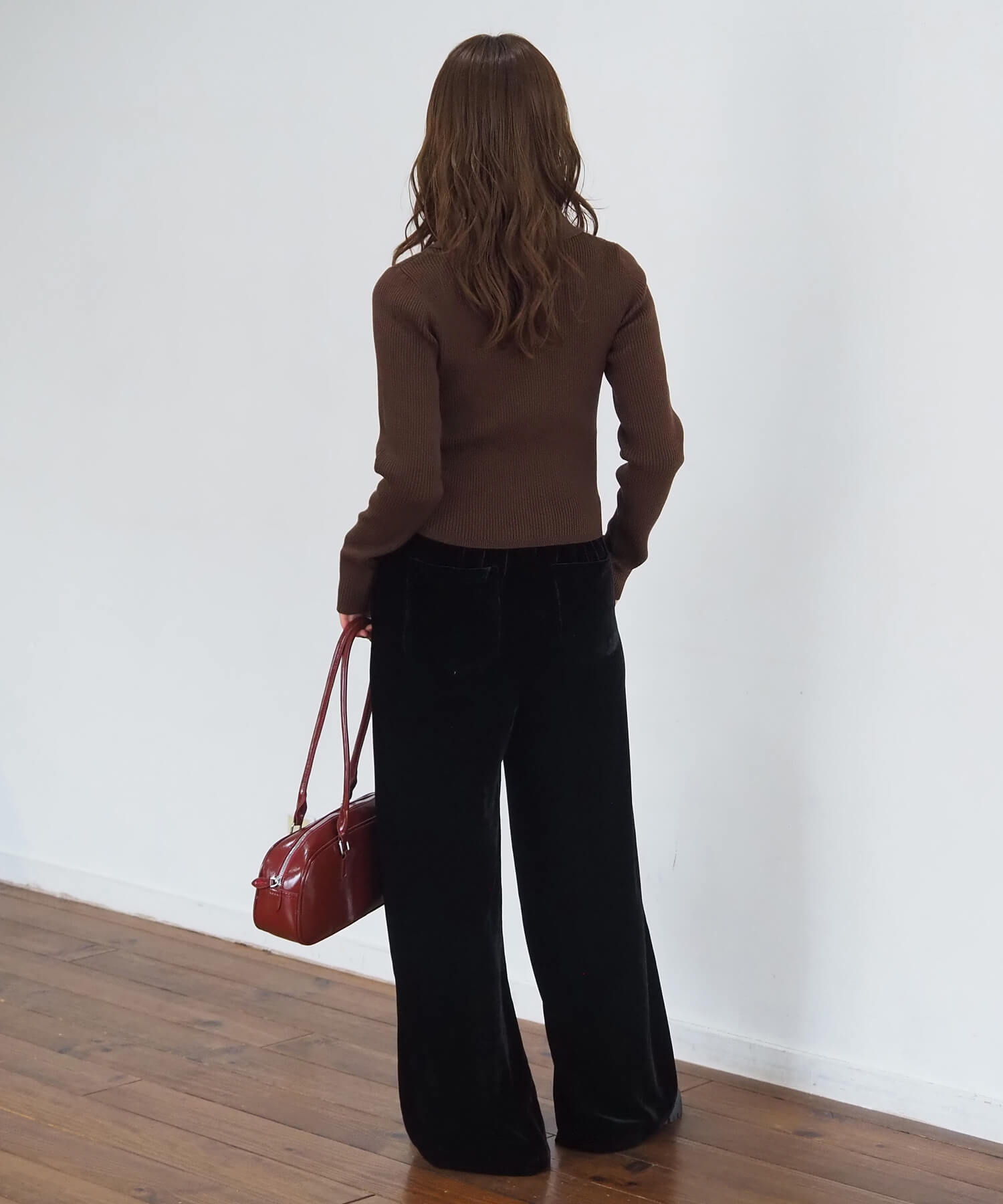 ・すっきり見えするデザインなので、ワイドパンツと相性が良く、ニットならではの上品さのあるコーディネートを楽しめます。