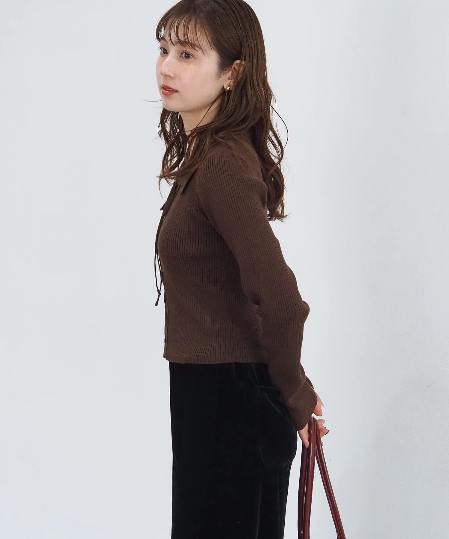 ・秋はベストのインナーとしても、冬はコートからのぞくレースアップがさりげなく華やか。目立ちすぎないデザインなのでマフラーやキャップなど、小物使いも楽しめます。