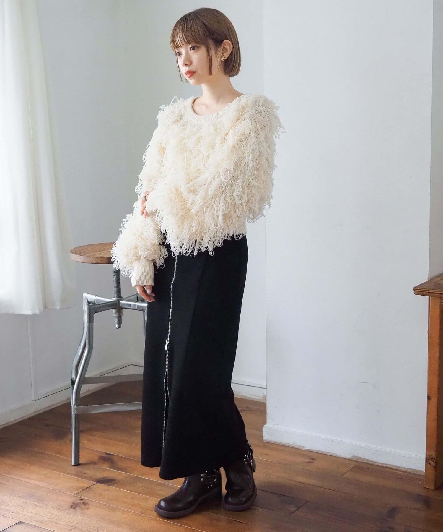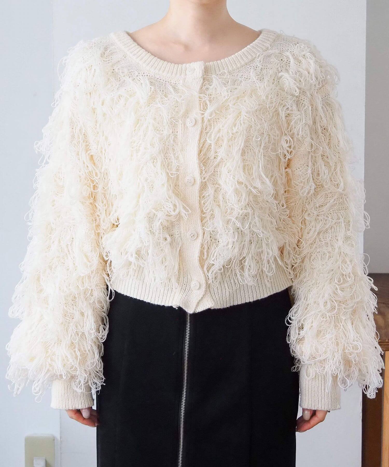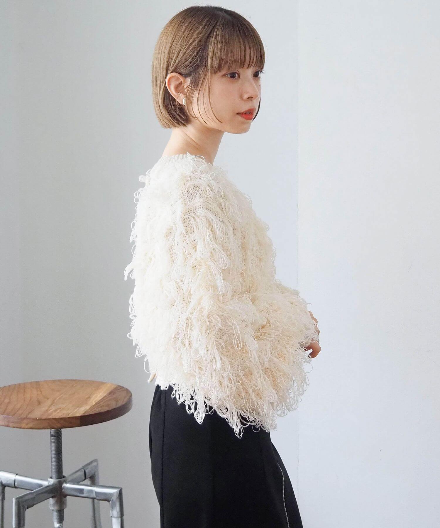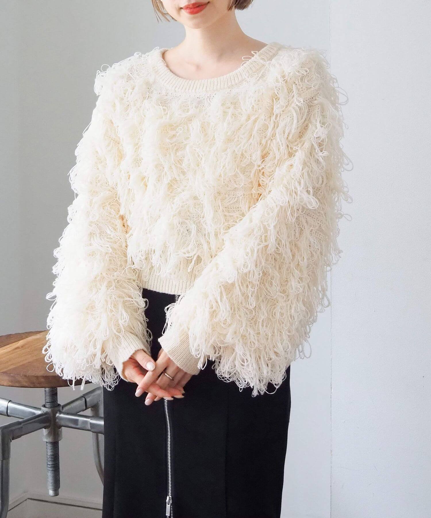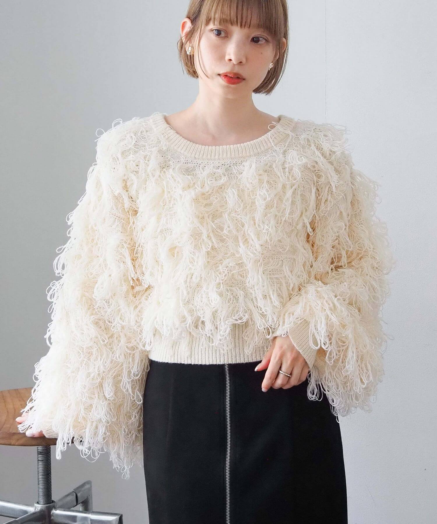 ・ループ状のフリンジが目を惹くボリュームのあるニットです。