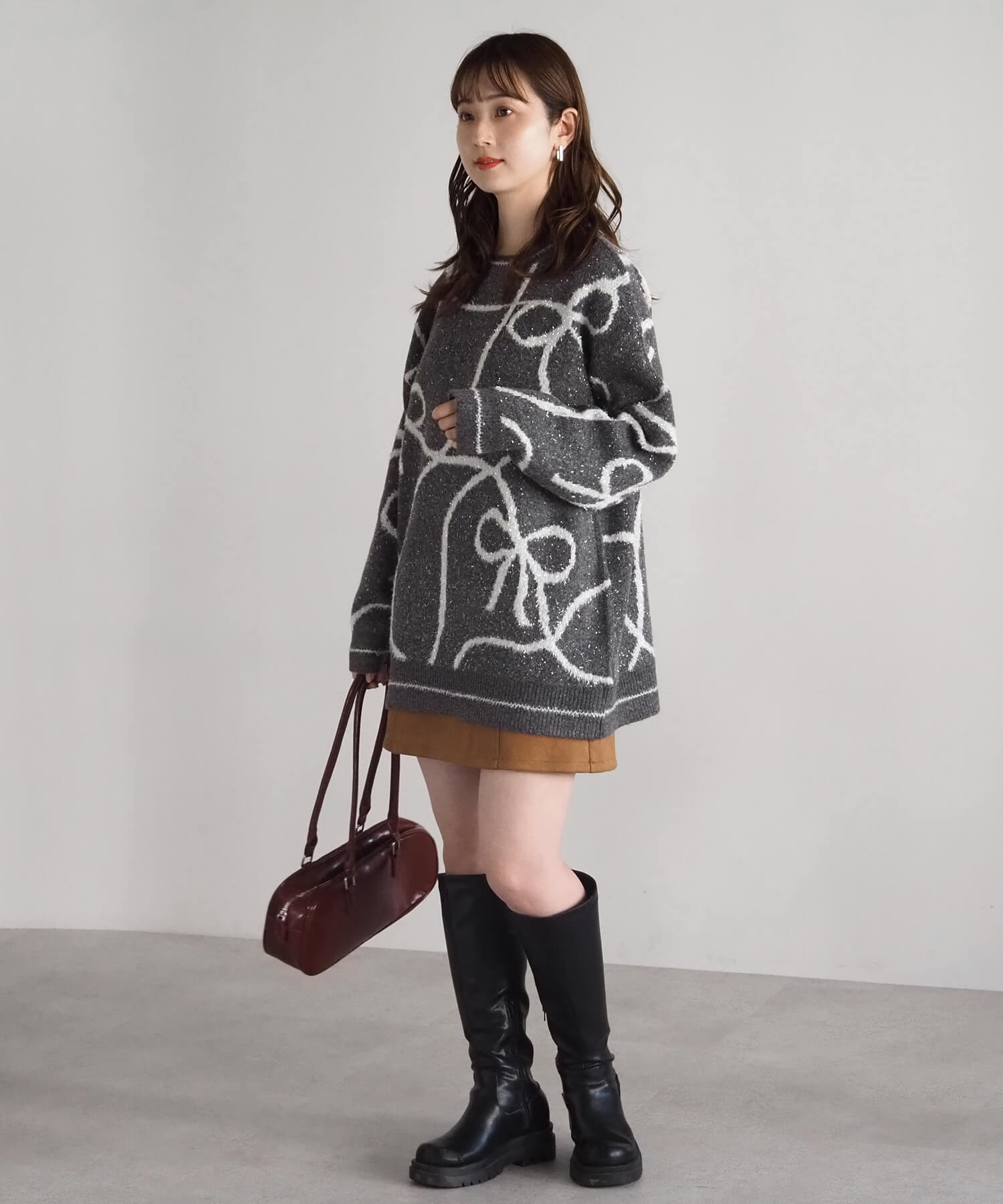 ・ニットのビッグシルエットが際立つミニボトムであざとコーデに。ブーツやソックスで足もとのアレンジも楽しめます♪