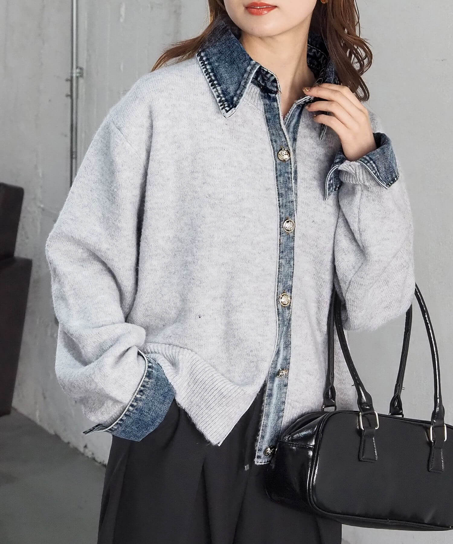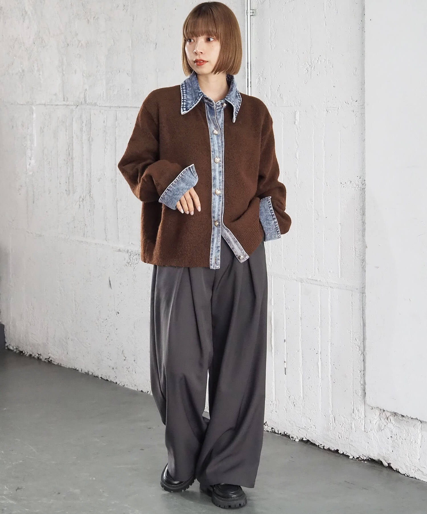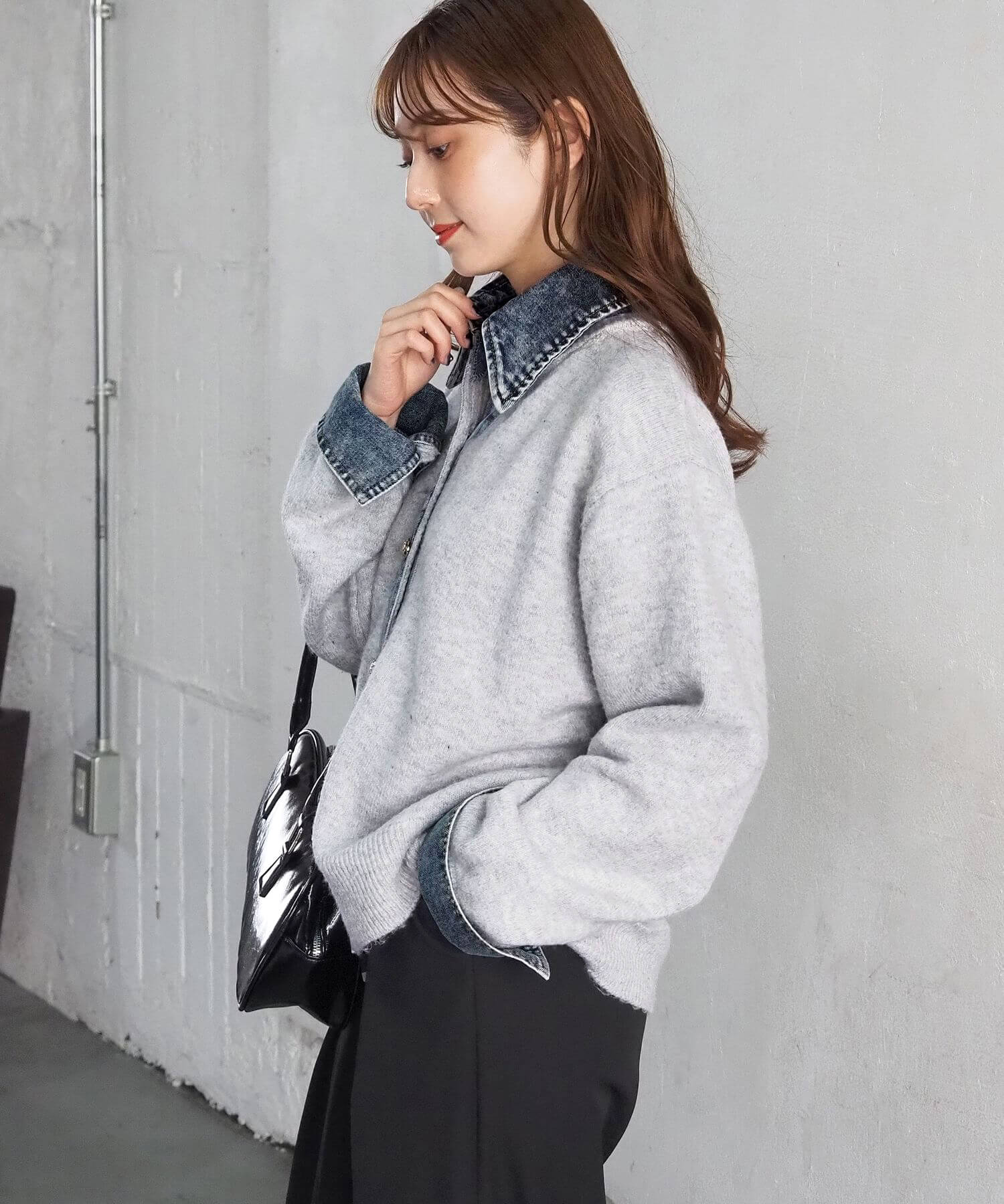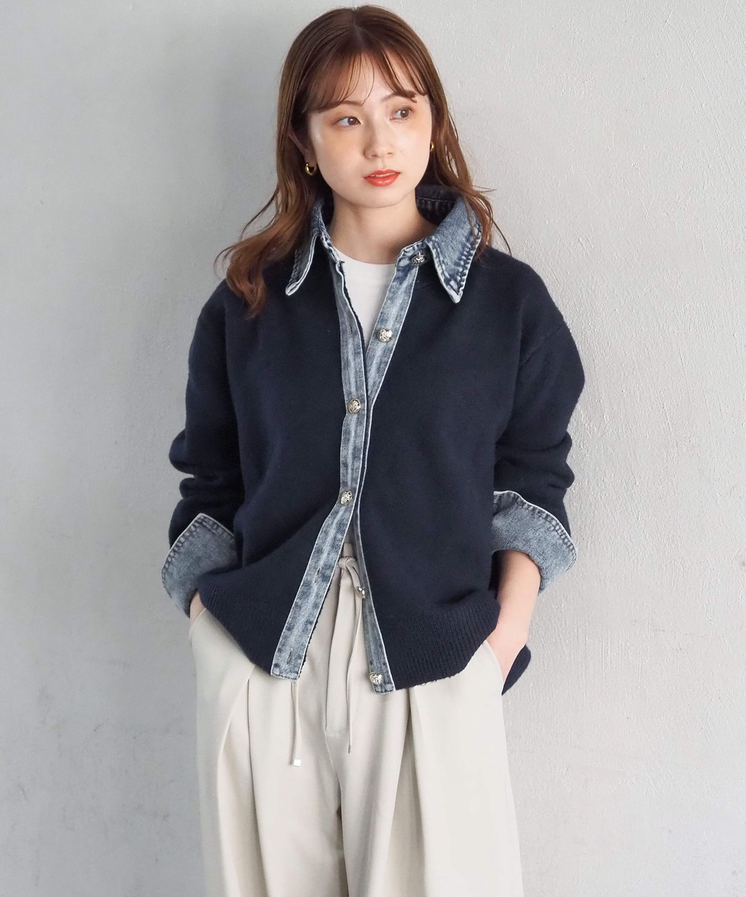 ・前立て部分はデニムで切り替えており、カーディガン×シャツの無難なレイヤードとは一味違ったデザインで洗練された雰囲気に◎