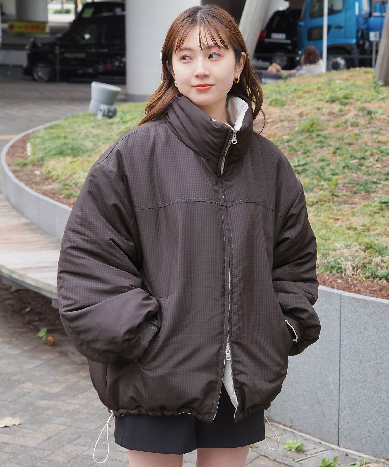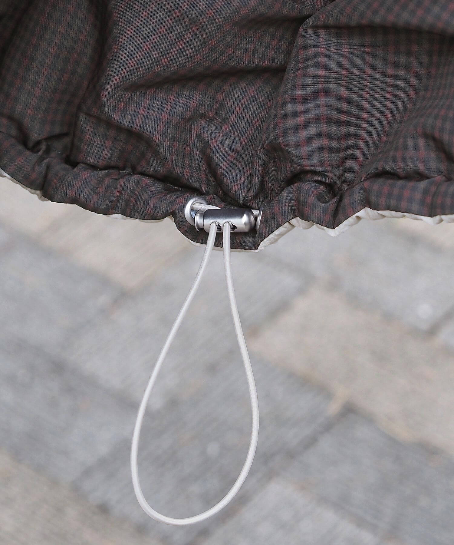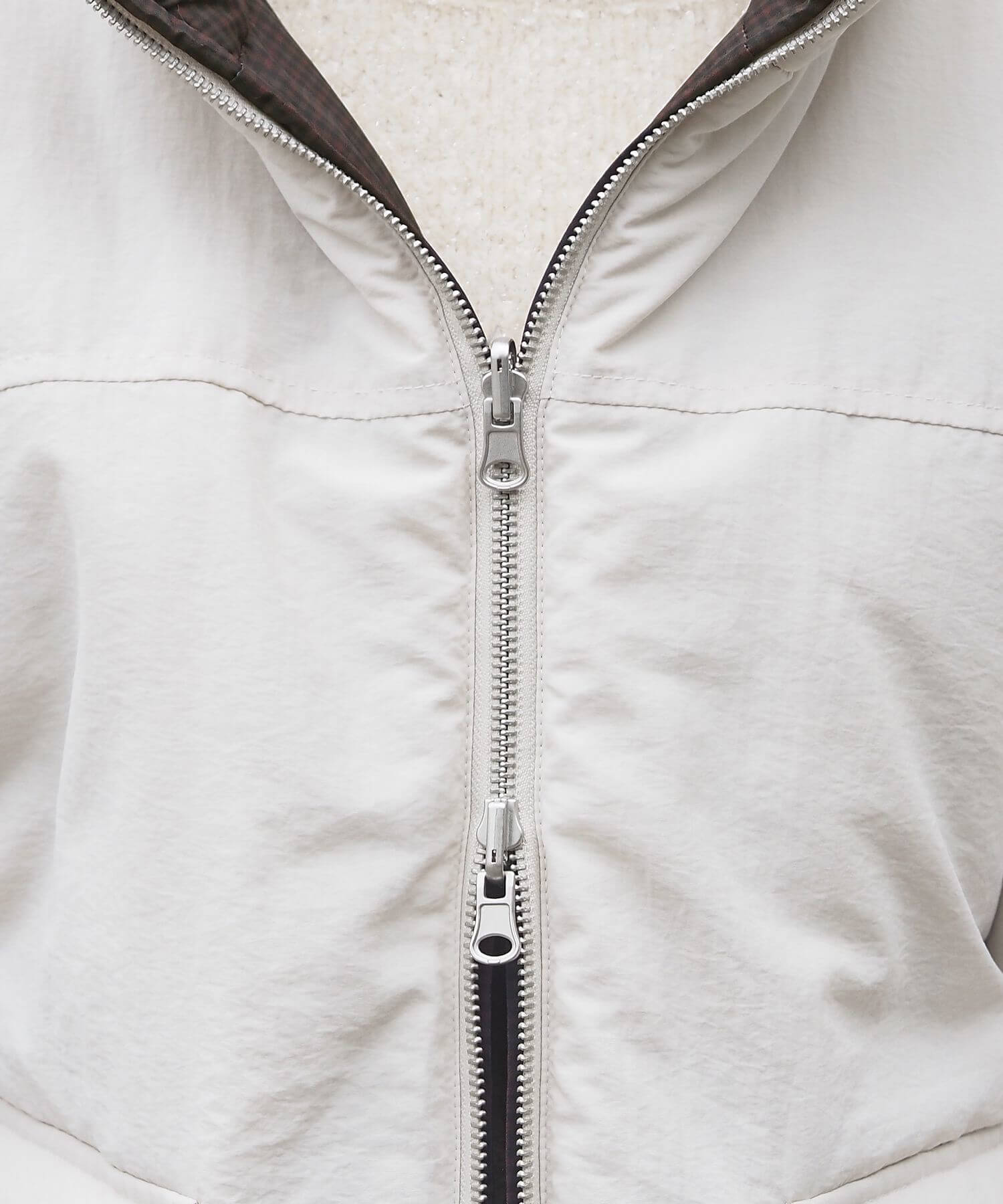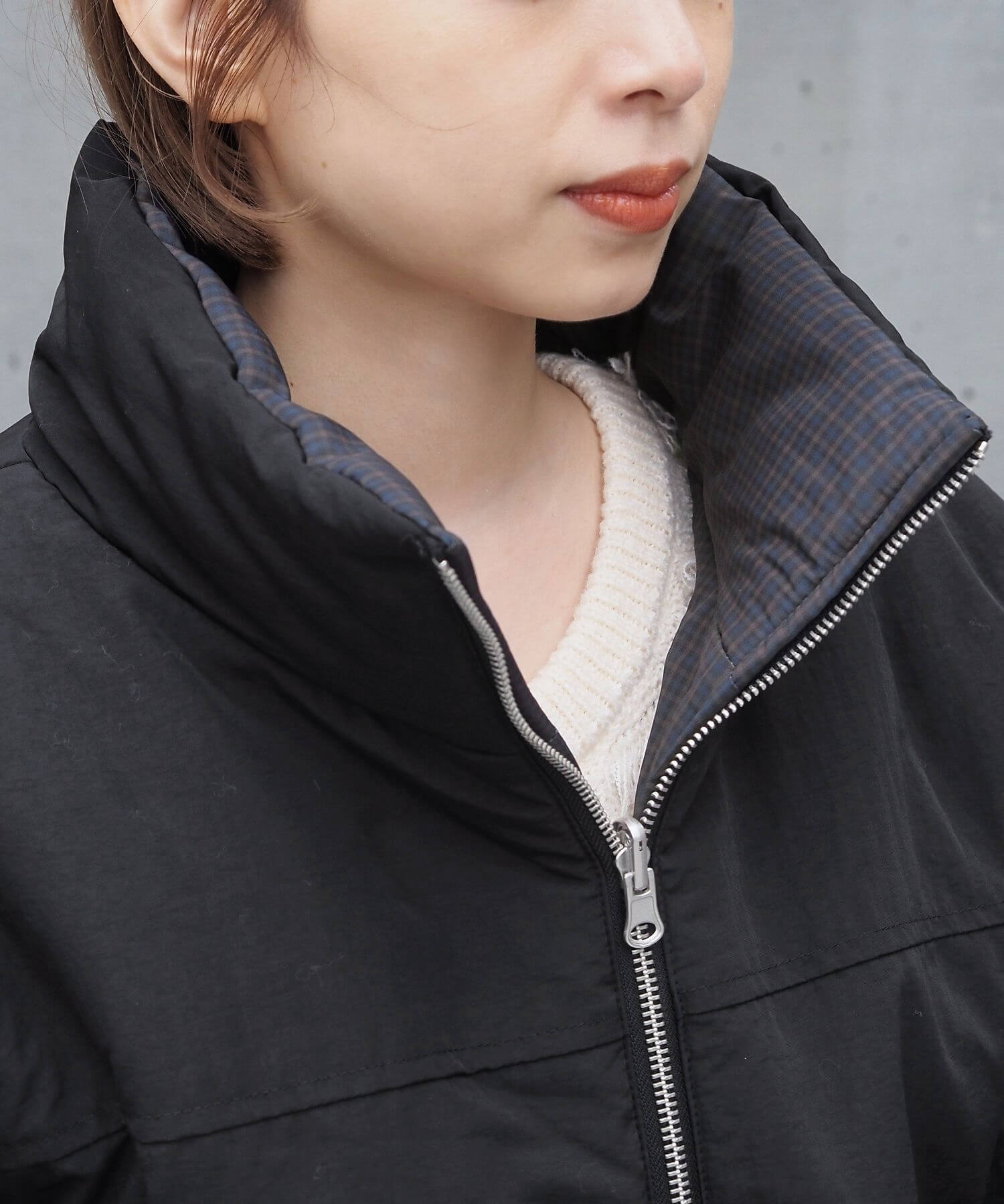 ・無地とチェック柄、リバーシブルで着用可能なスタンドブルゾンです。