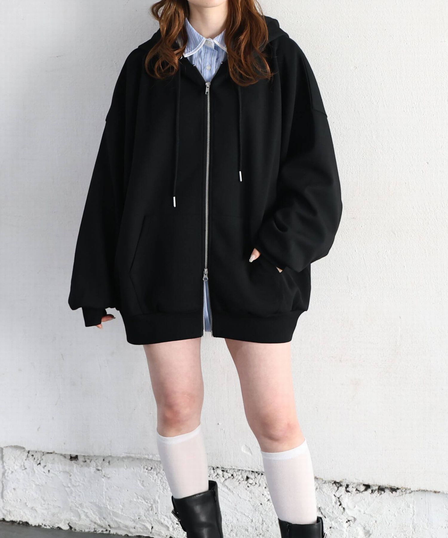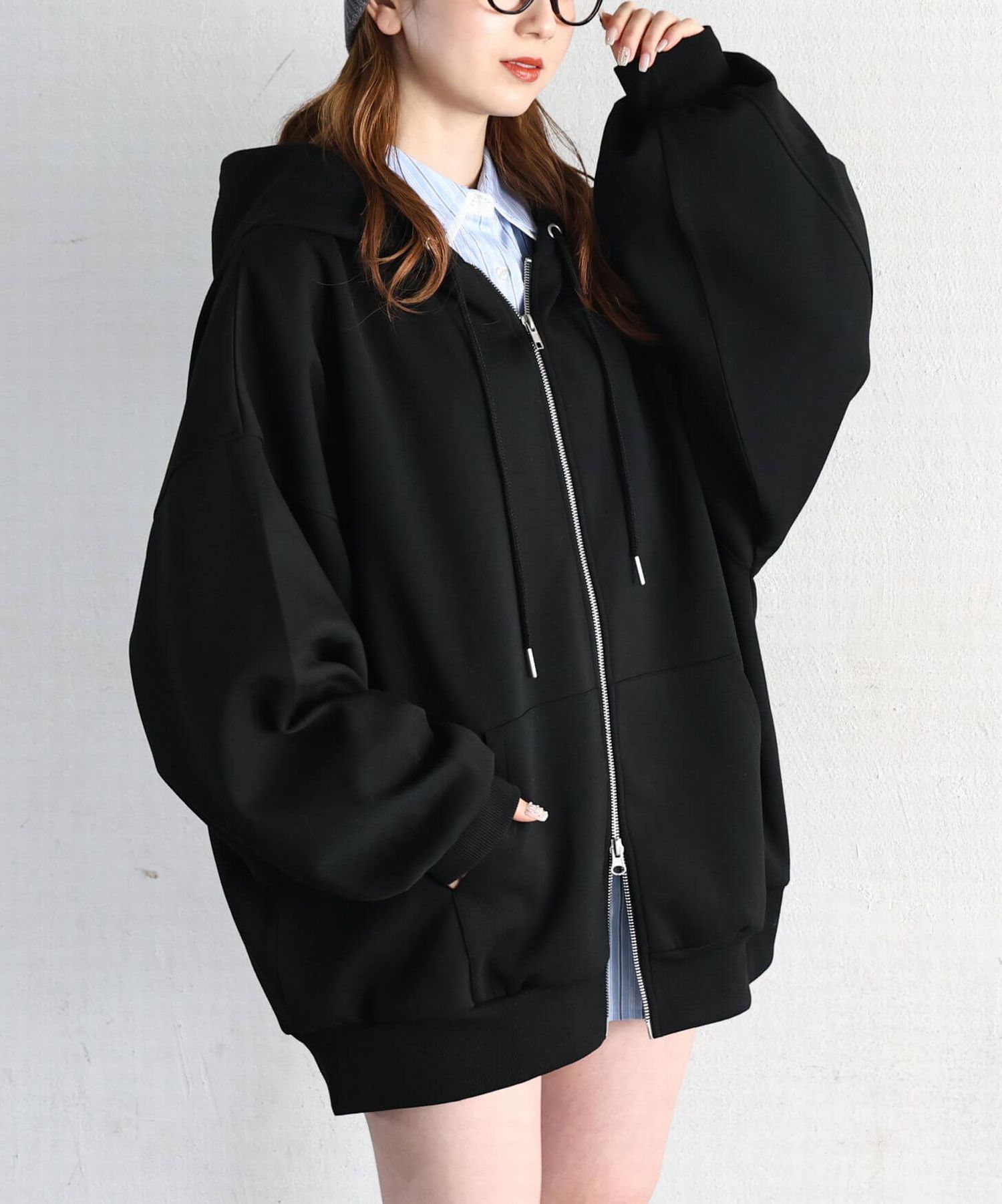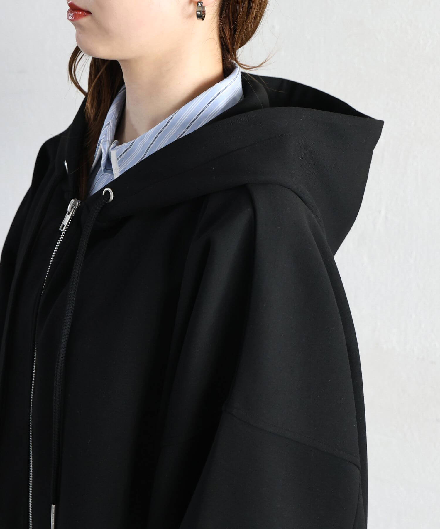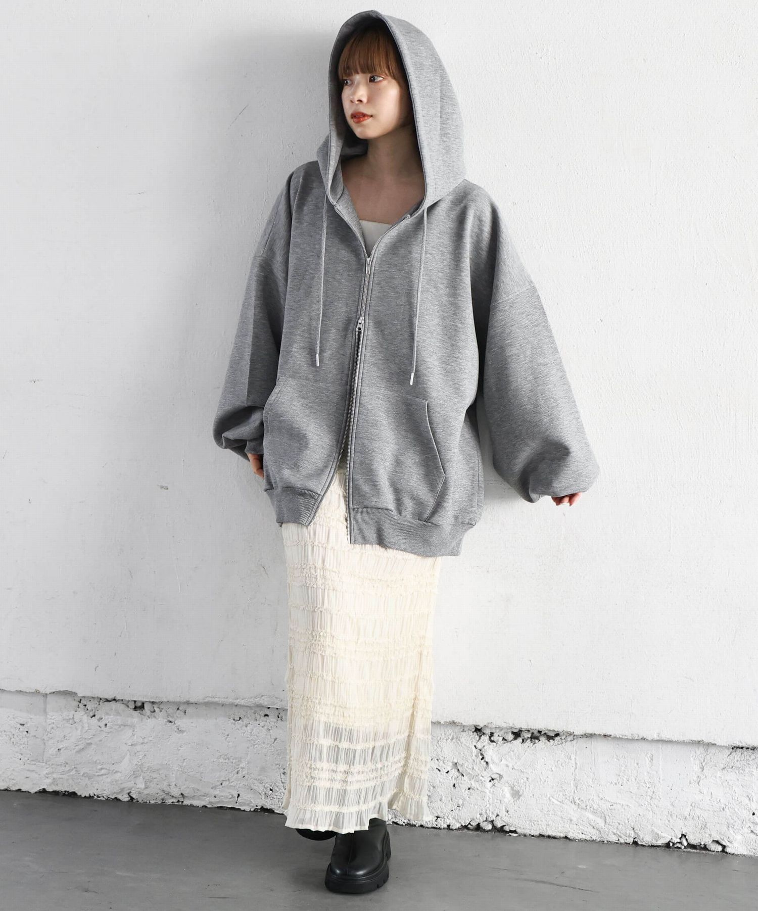 ・フロントのジップを少し開けると、程よい抜け感が出ます。
