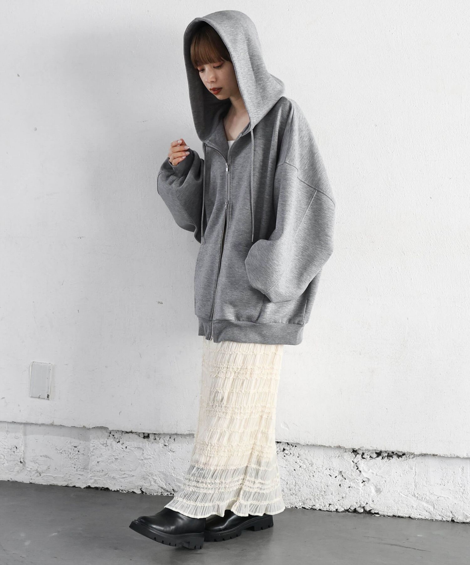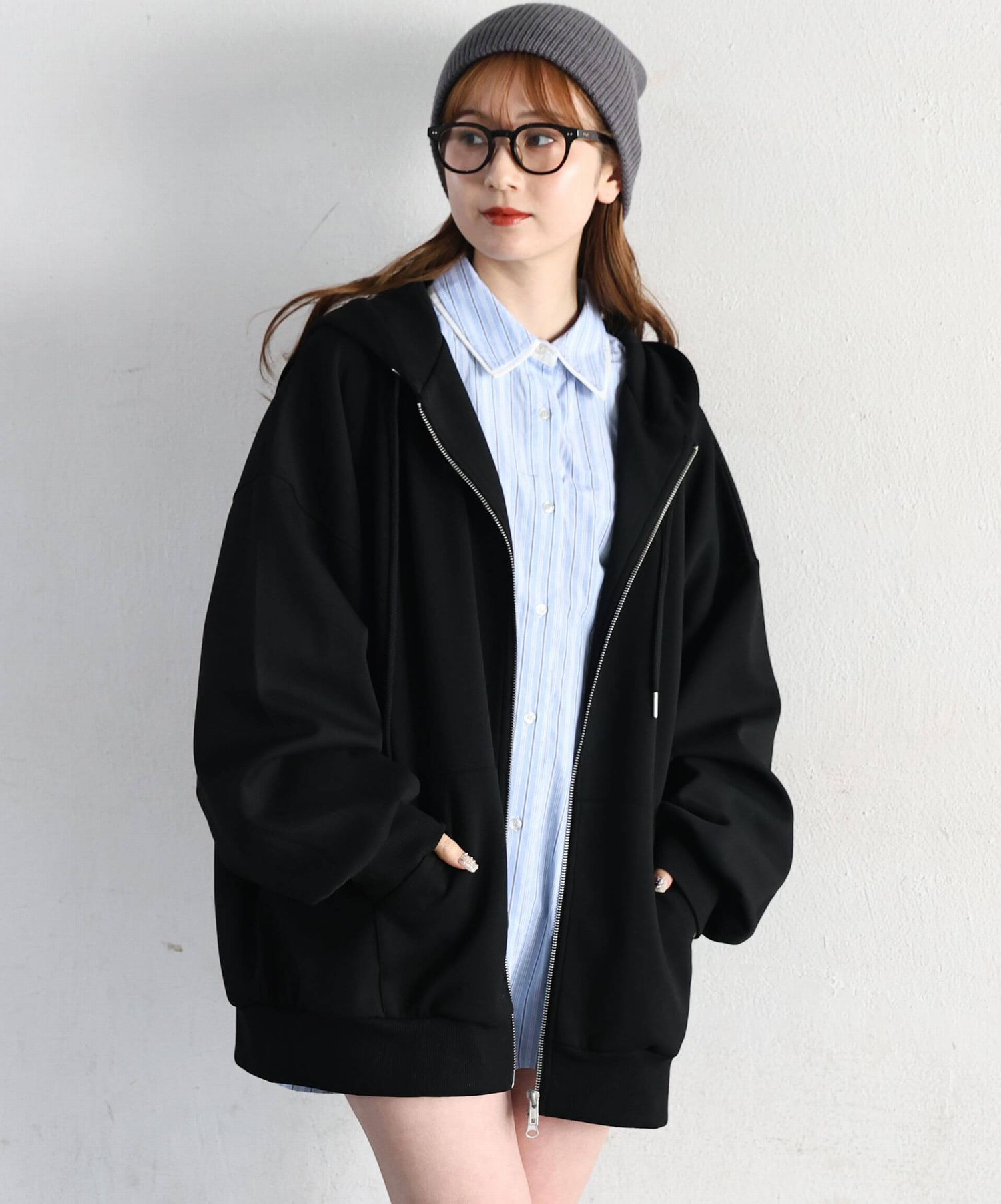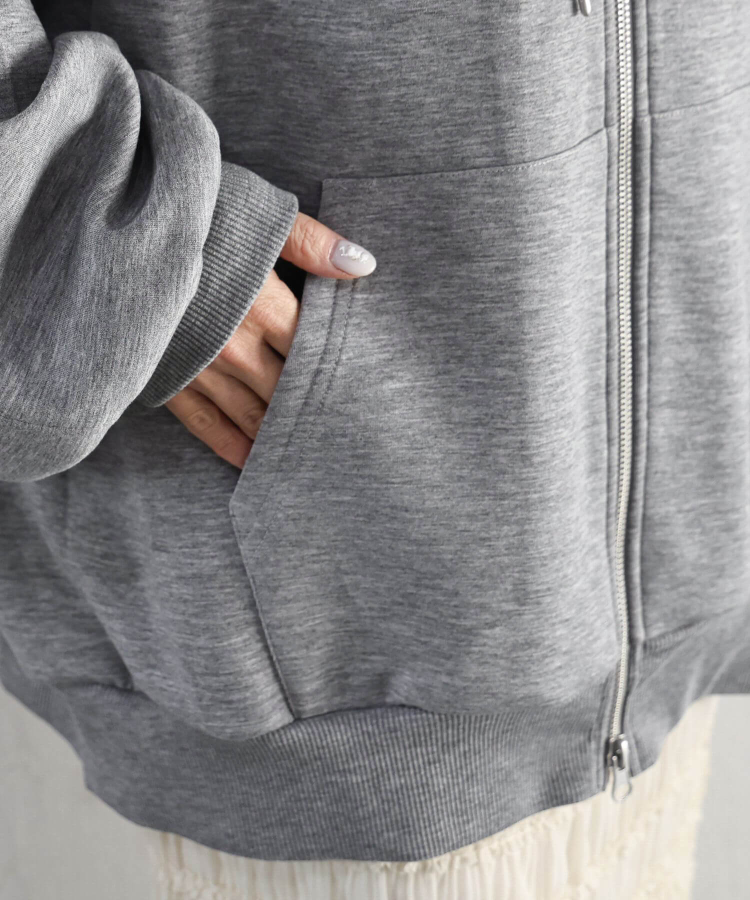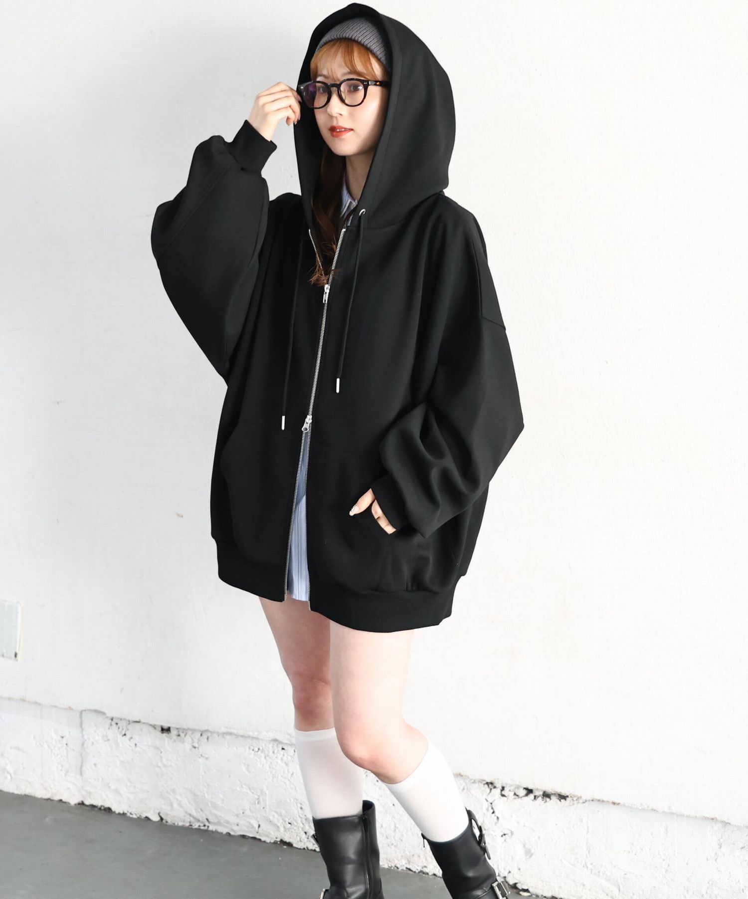 ・フロントのジップを少し開けると、程よい抜け感が出ます。