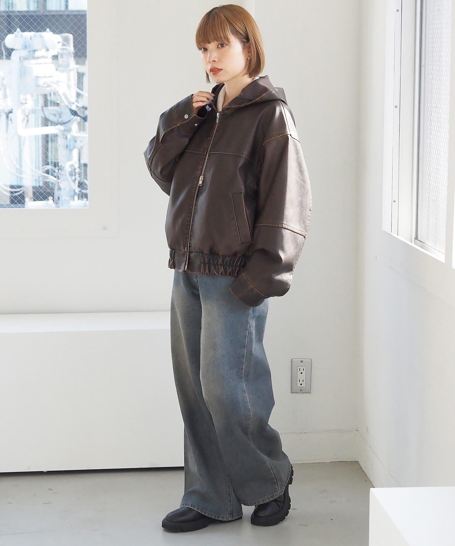 [2月10日販売開始!!] ヴィンテージ加工合皮フードブルゾン
