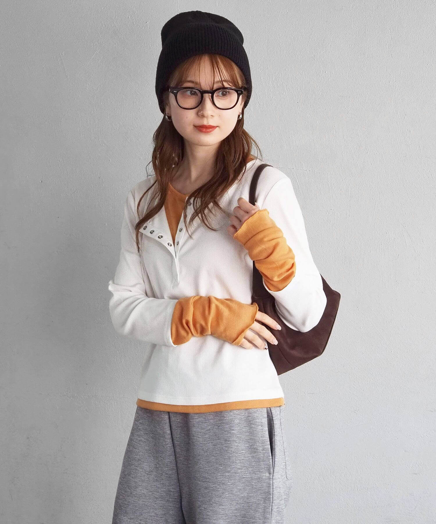 [2月17日販売開始!!] 配色シアー×ヘンリーネックレイヤードロンT