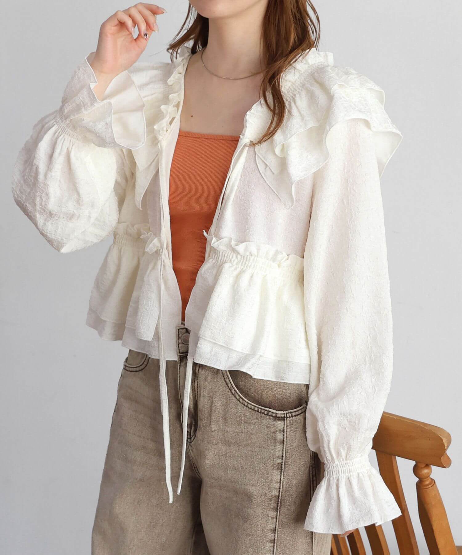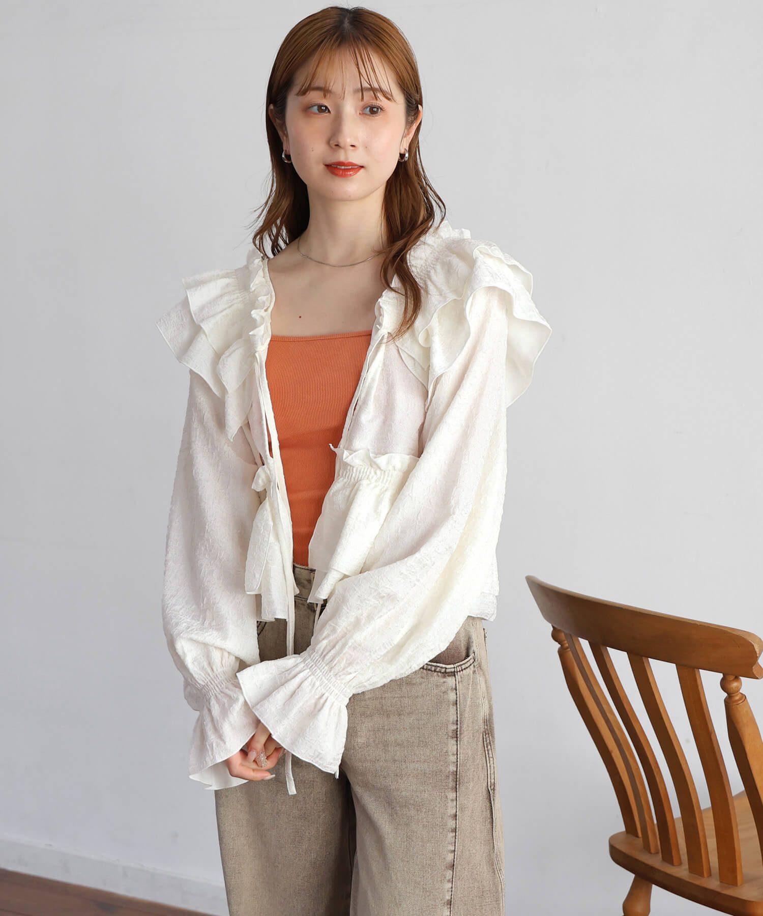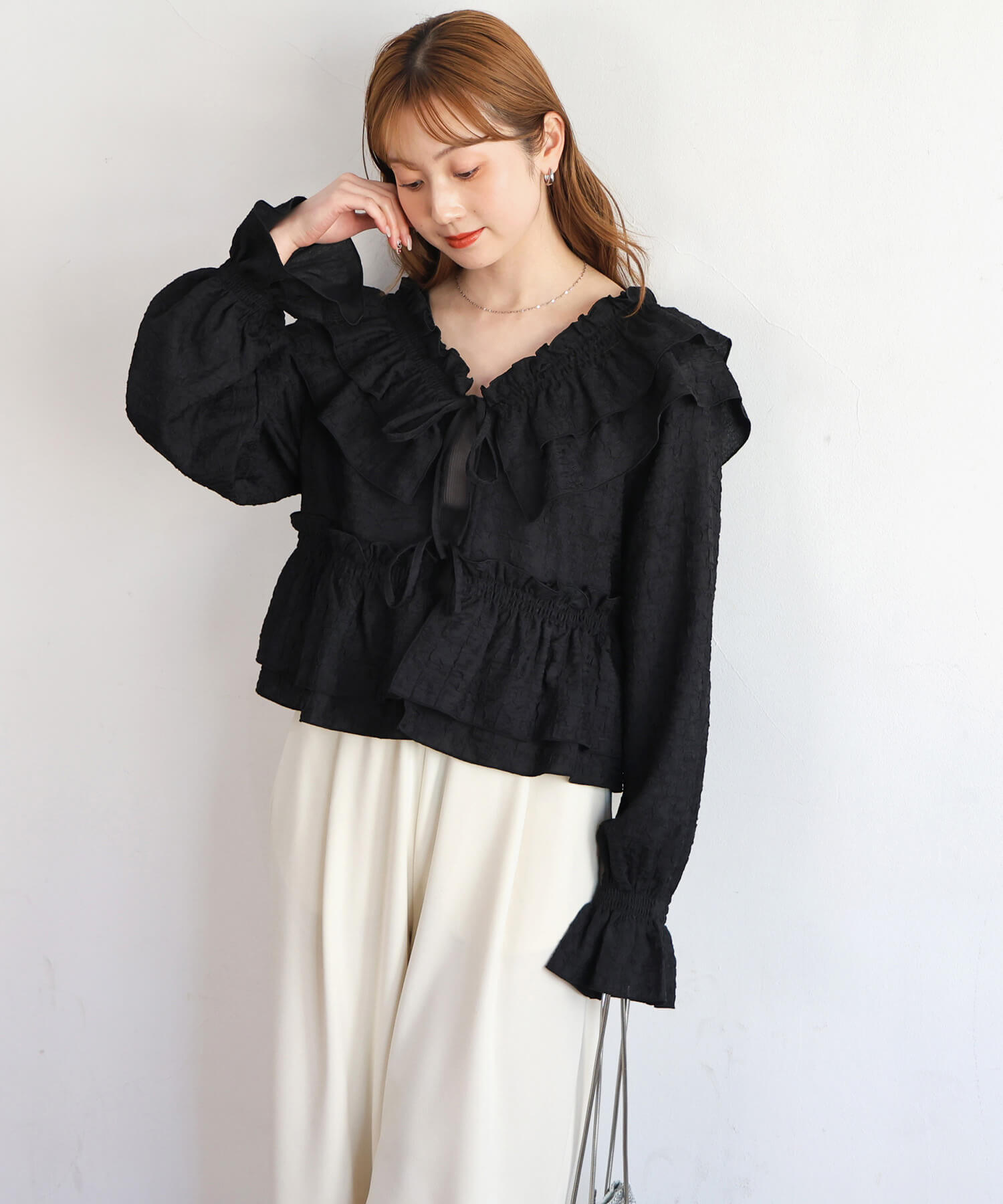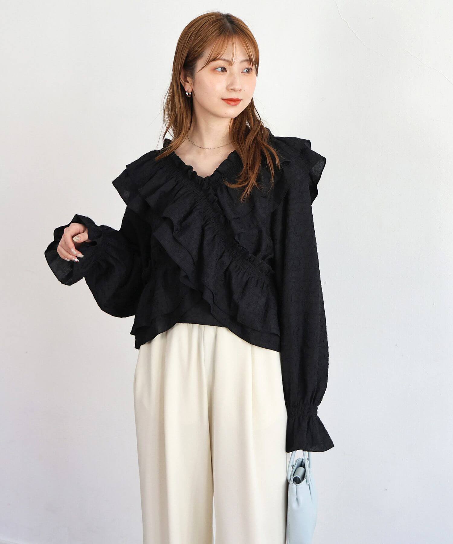 ・着映え確実なたっぷりのフリルに、すっきりとしたVネックが甘すぎず、程よく華やか。