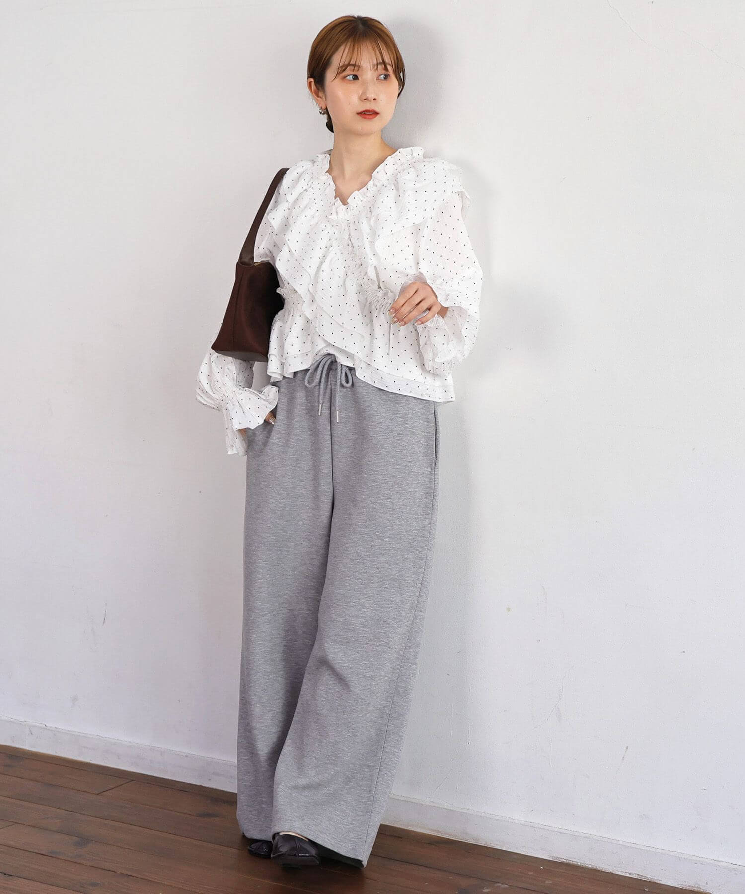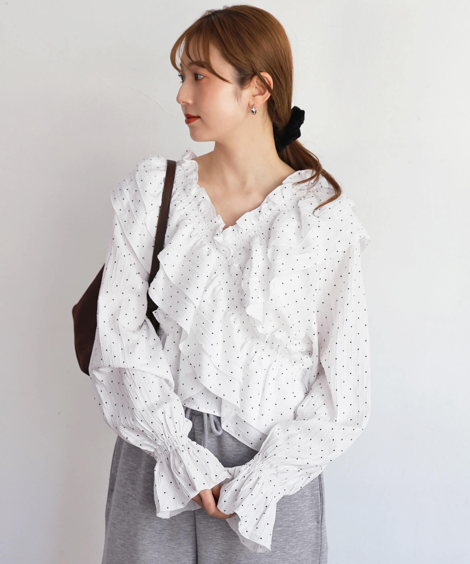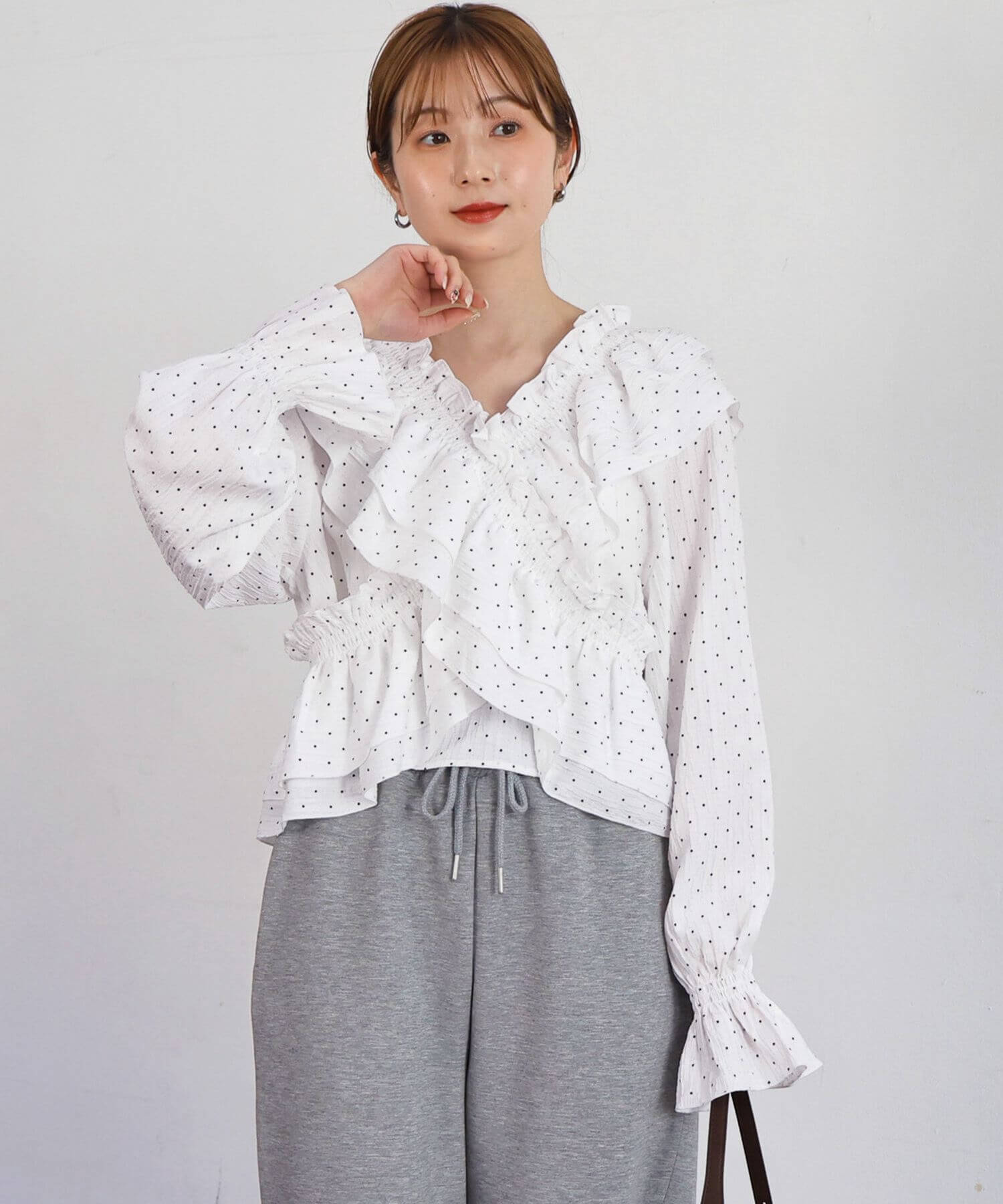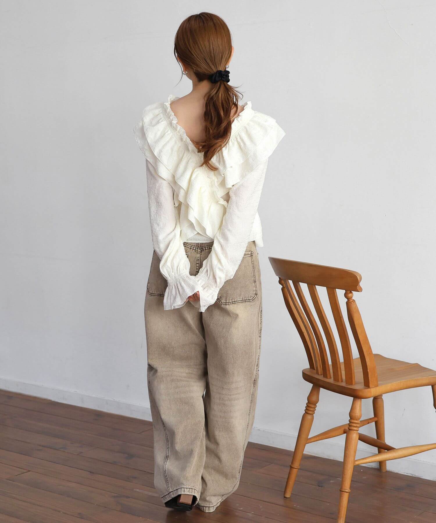 ・着映え確実なたっぷりのフリルに、すっきりとしたVネックが甘すぎず、程よく華やか。