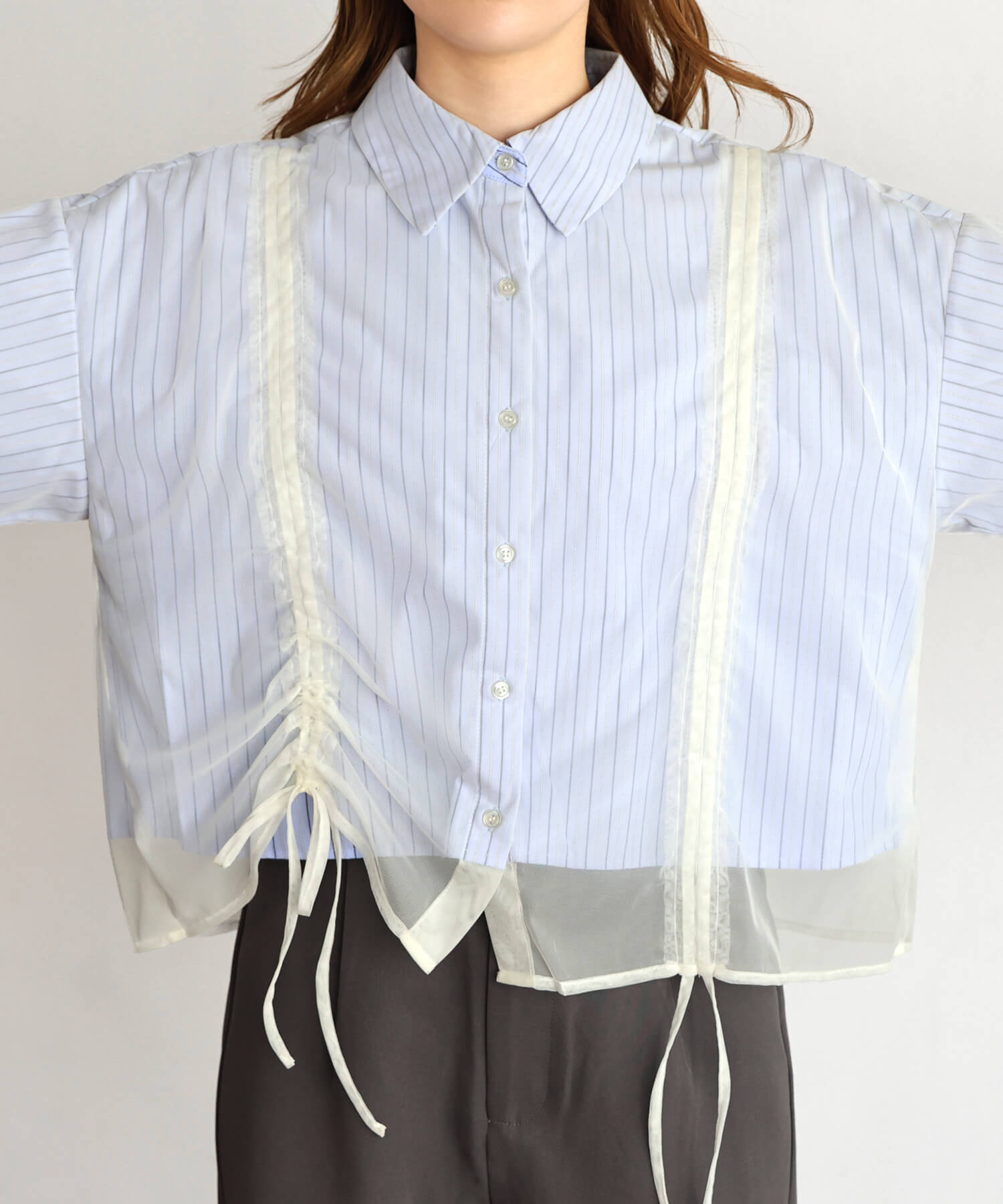 ・この春注目のストライプ、ブルーが爽やかなチェック柄の2デザインをベースに、柔らかいチュール生地を重ねたデザインブラウスです。