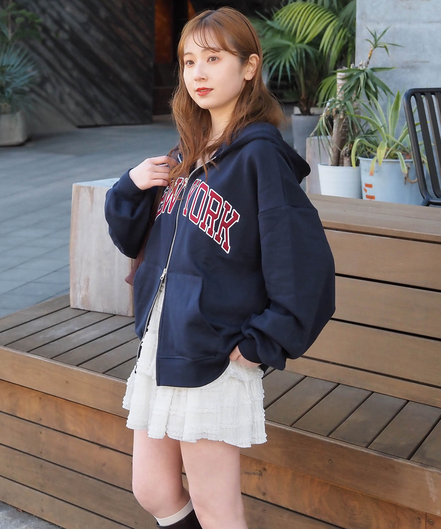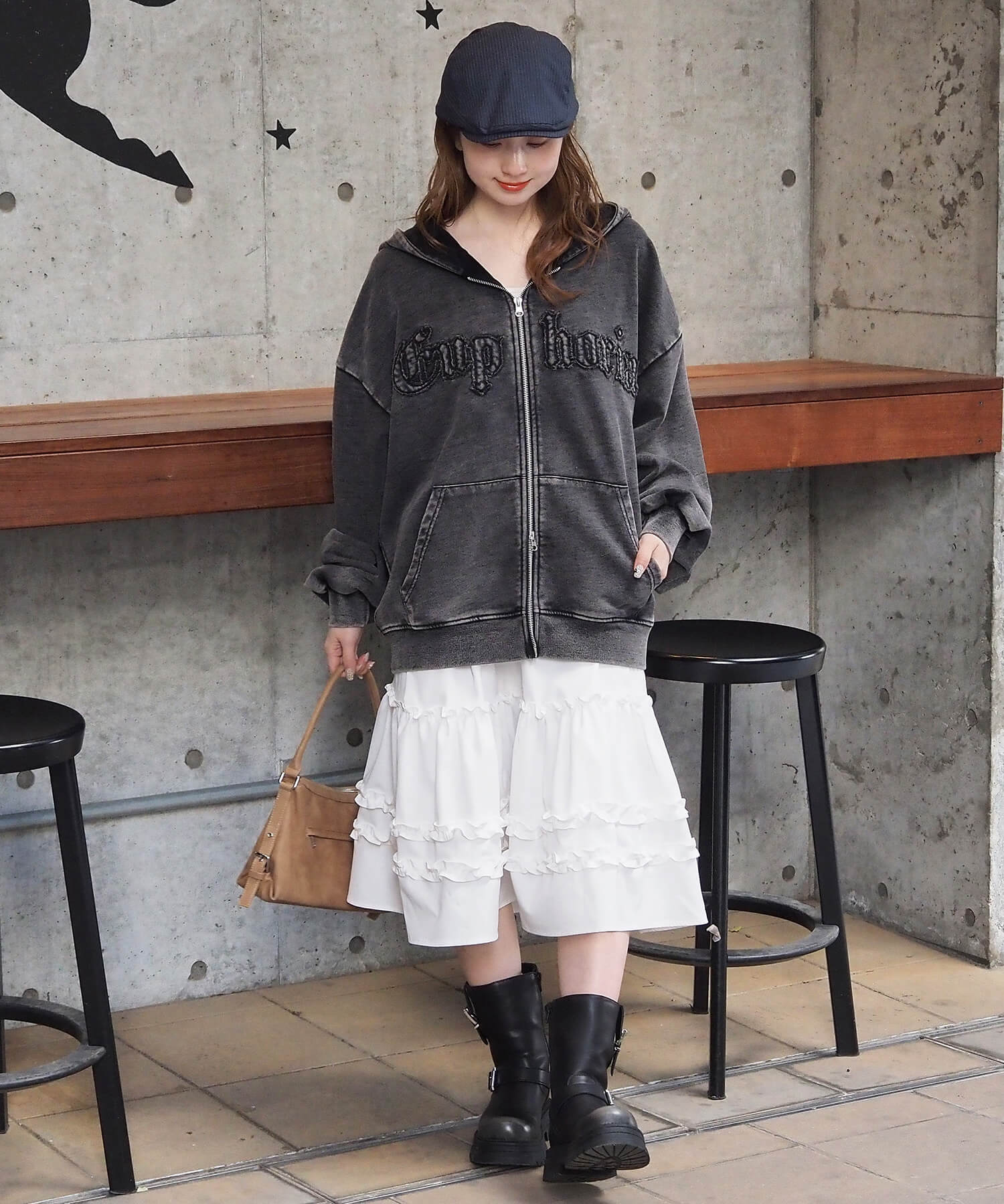 ・ビッグシルエットが映えるミニスカートでガーリーカジュアルに。