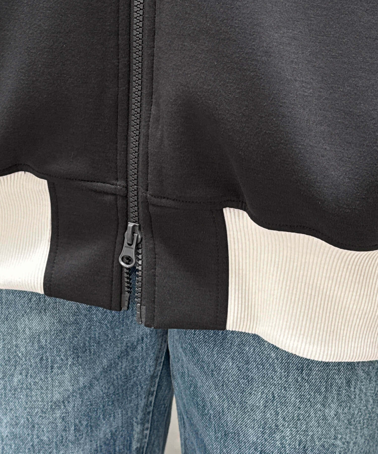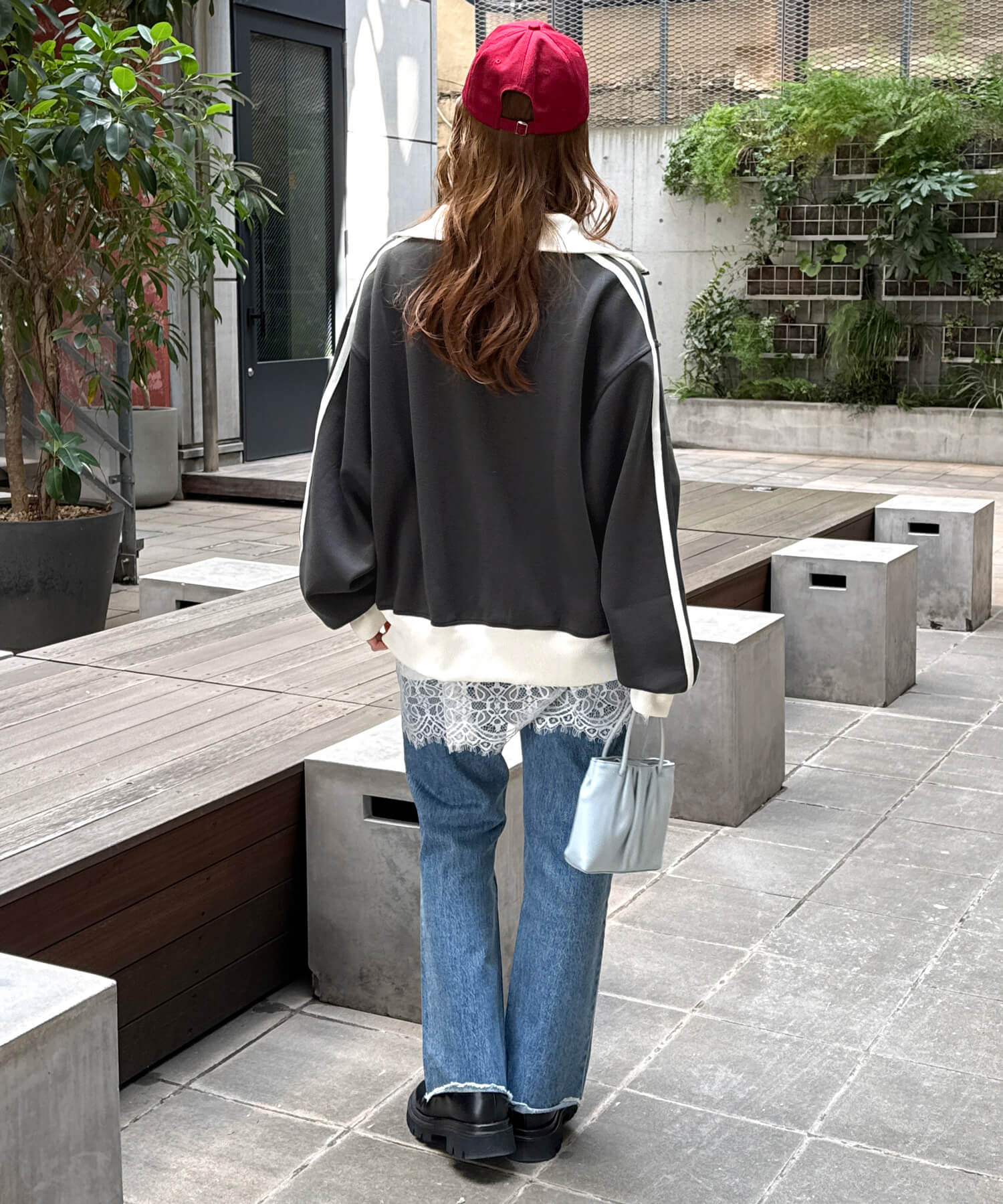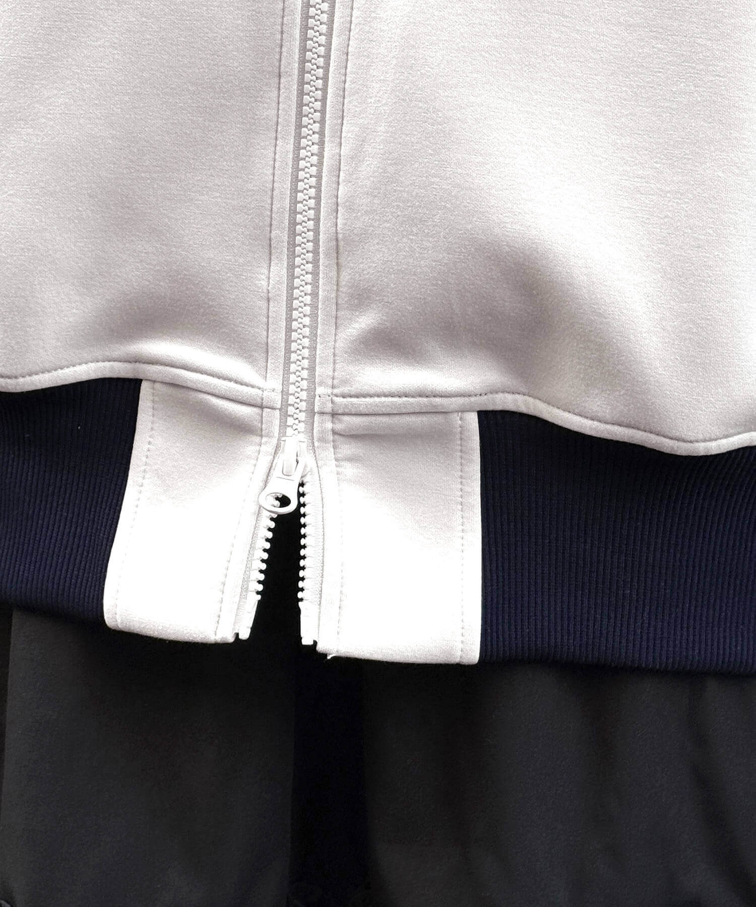 ・ジップを閉めてジャージトップスとして。裾のジップを開ければ、すっきり重心アップも可能です。