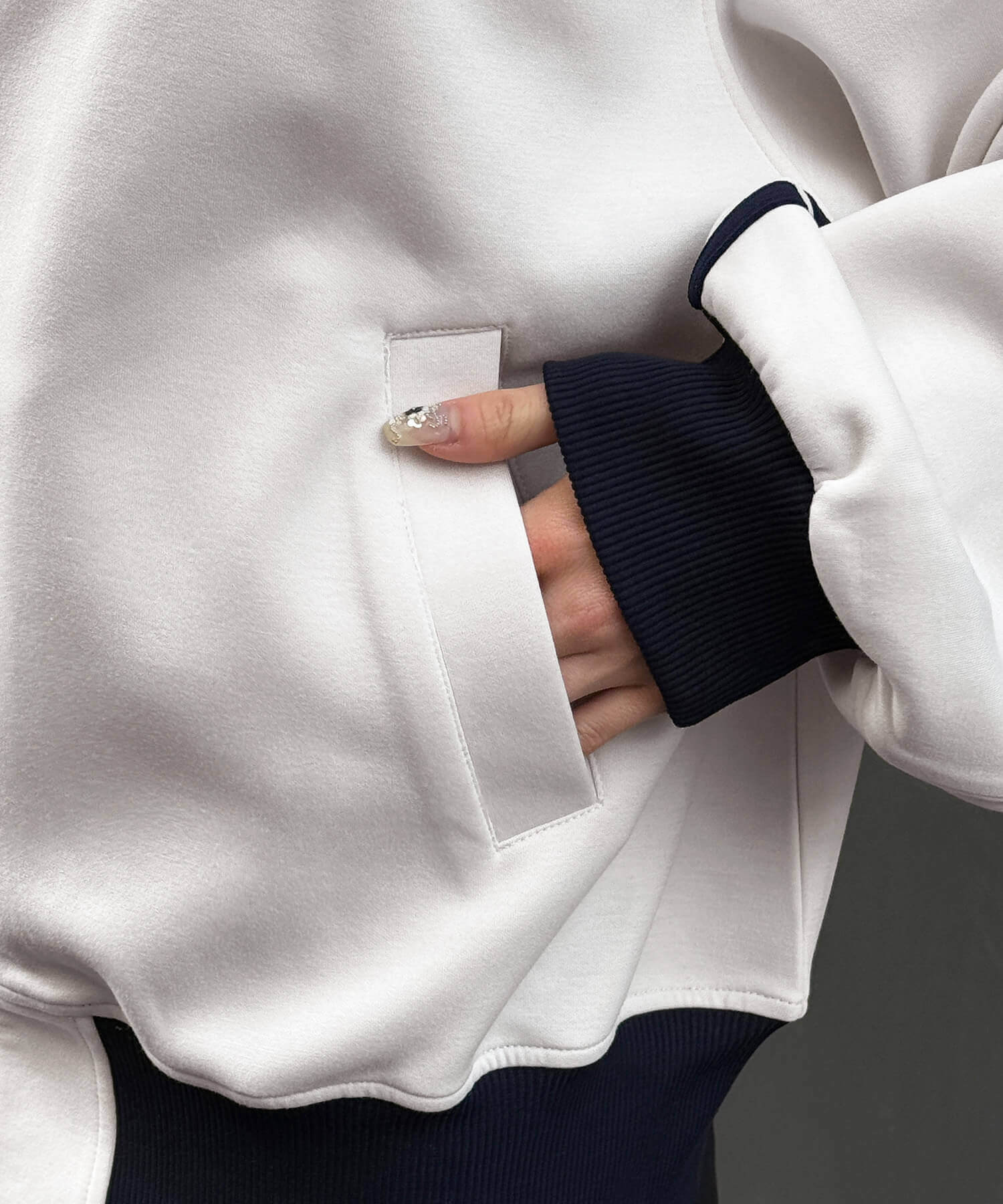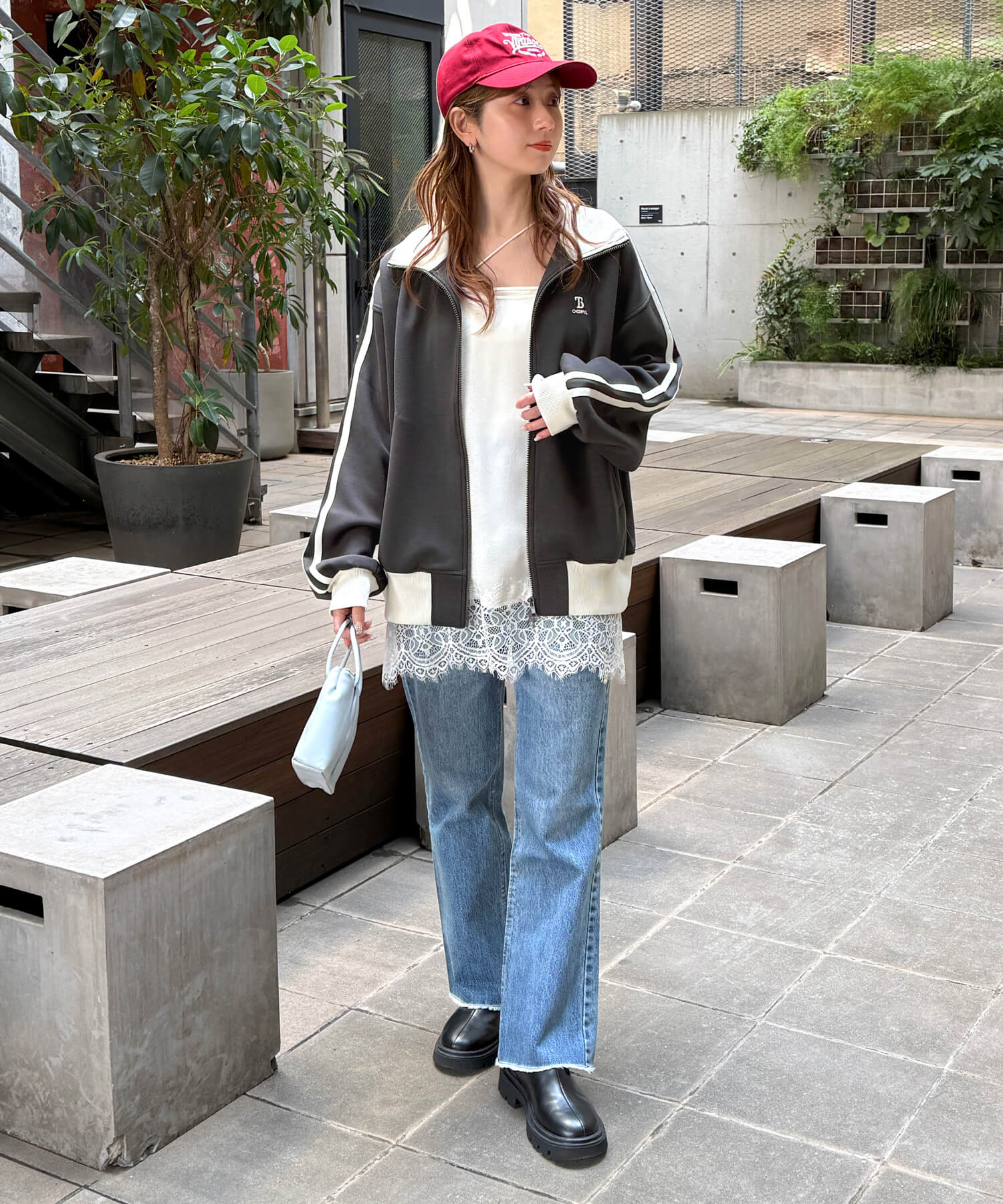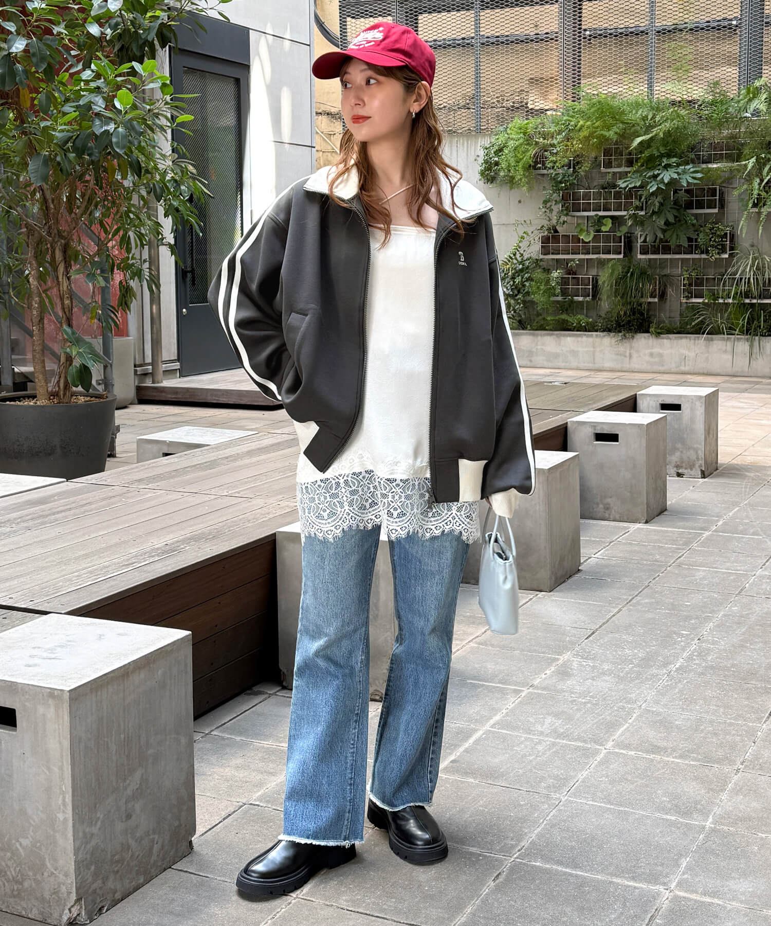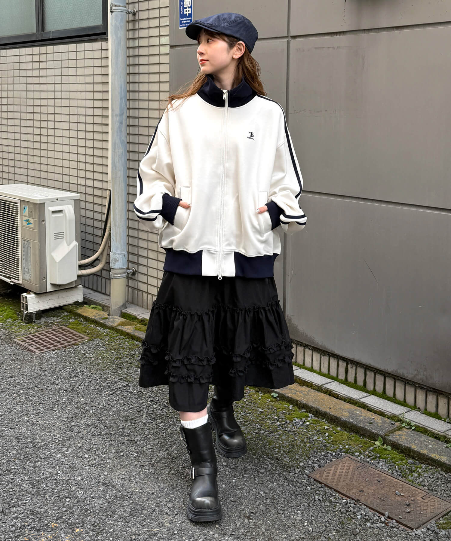 ・ジップを閉めてジャージトップスとして。裾のジップを開ければ、すっきり重心アップも可能です。