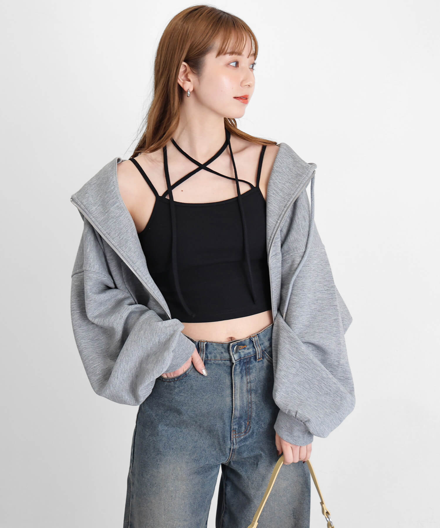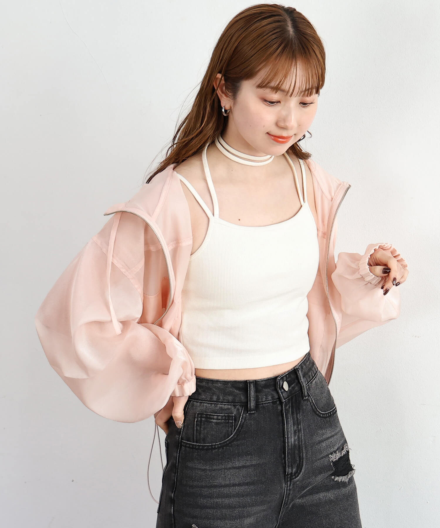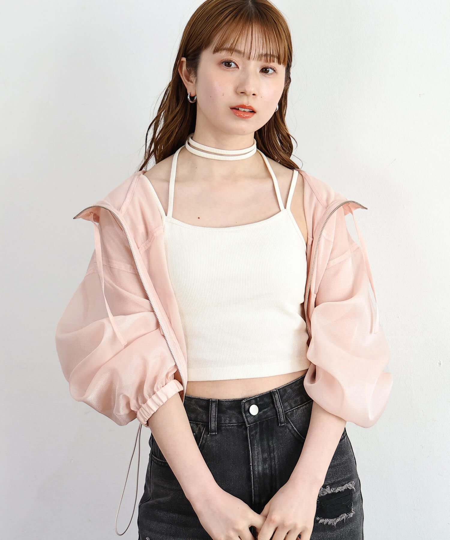 ※当アイテムはSサイズ表記ですが、テレコカップ付きチョーカーキャミ(品番:07700T2071)のショート丈です。フリーサイズとして着用頂けるサイズ感です。