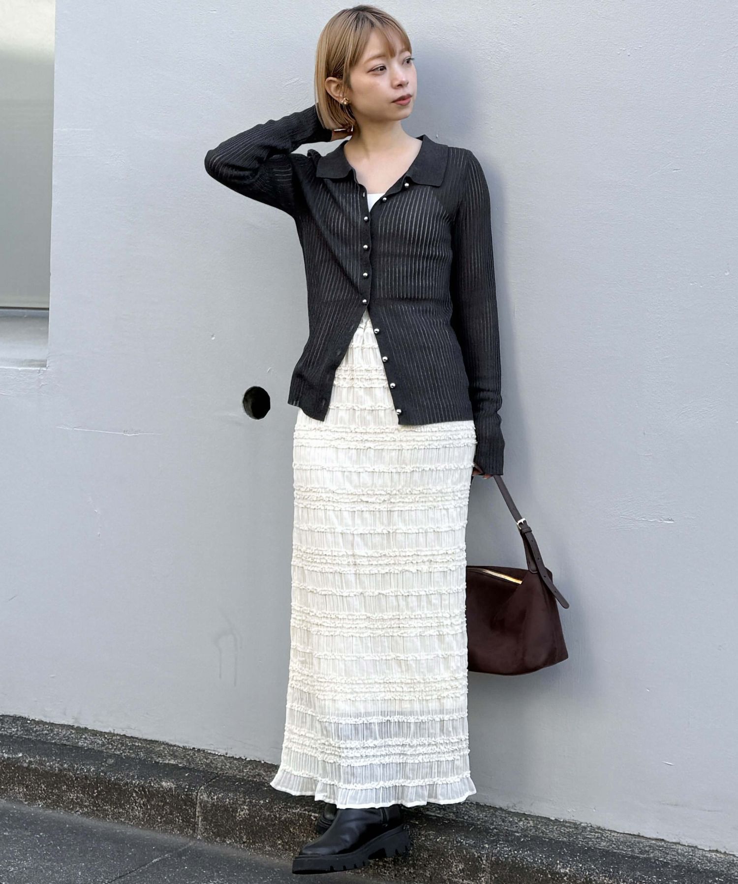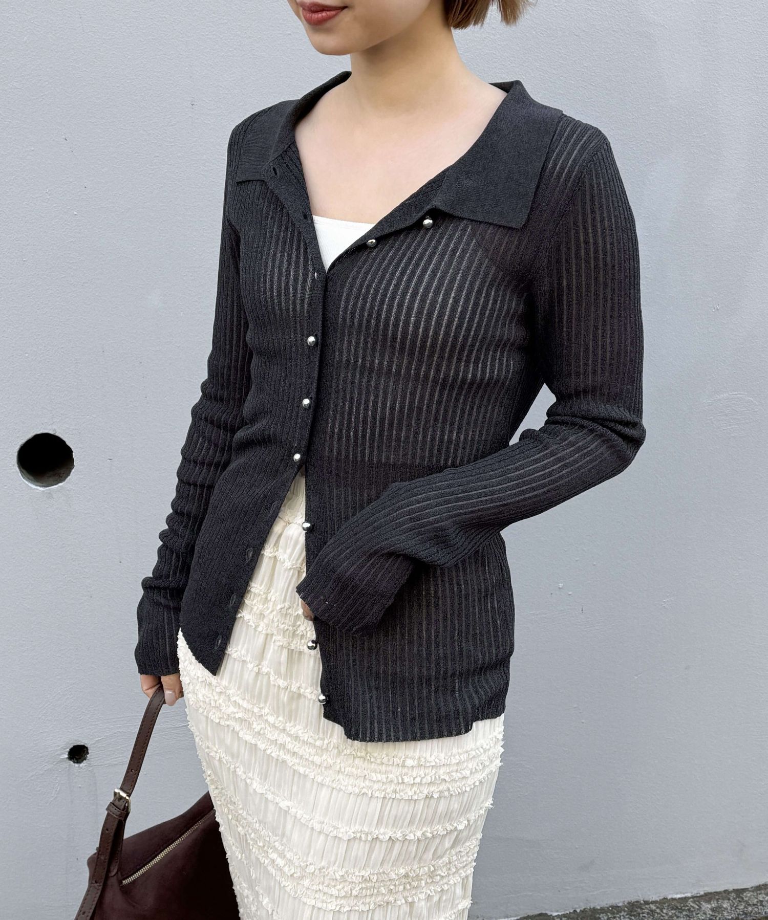 ・フロントボタンは裾を開くとくびれのあるシルエットで着られます。