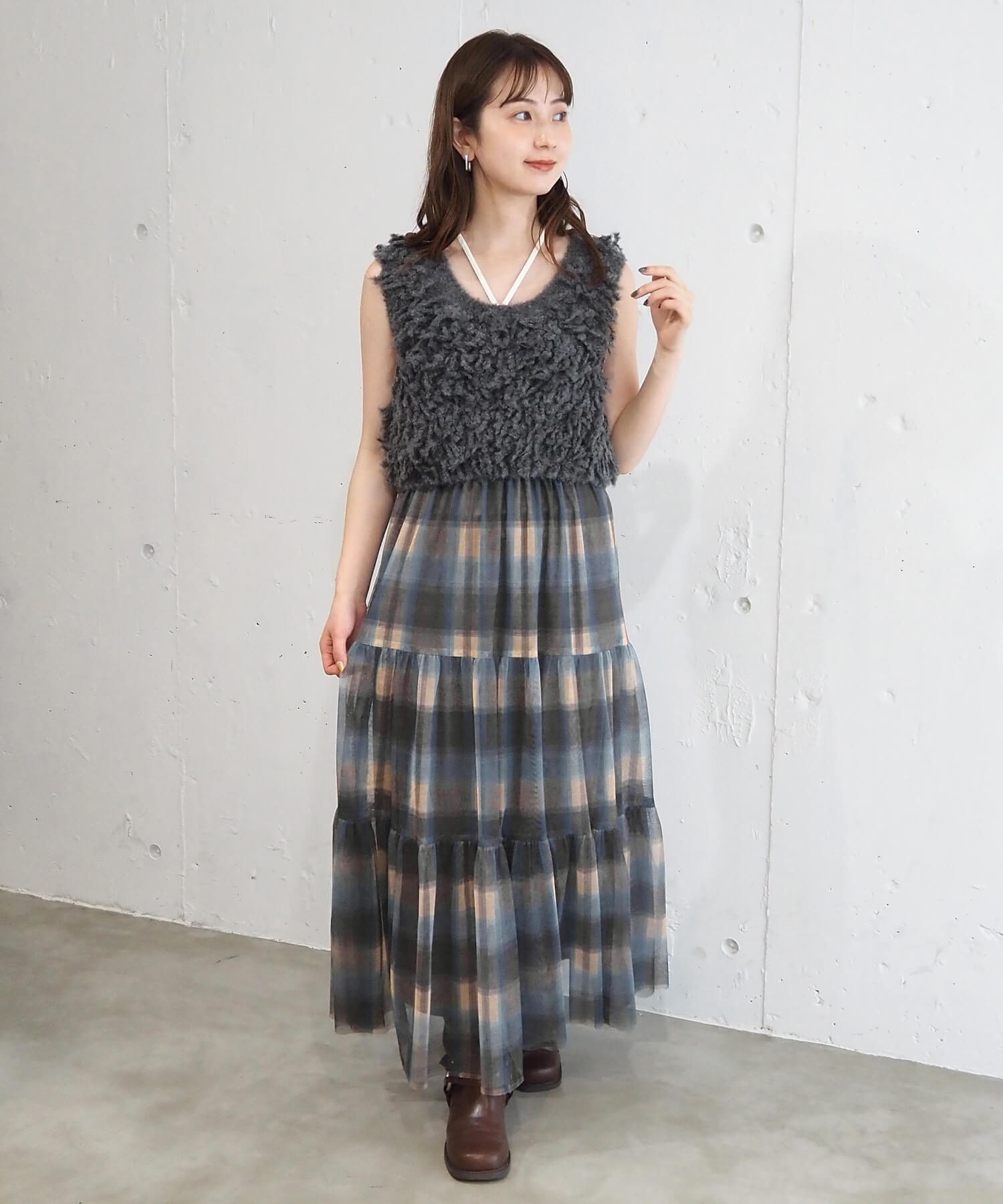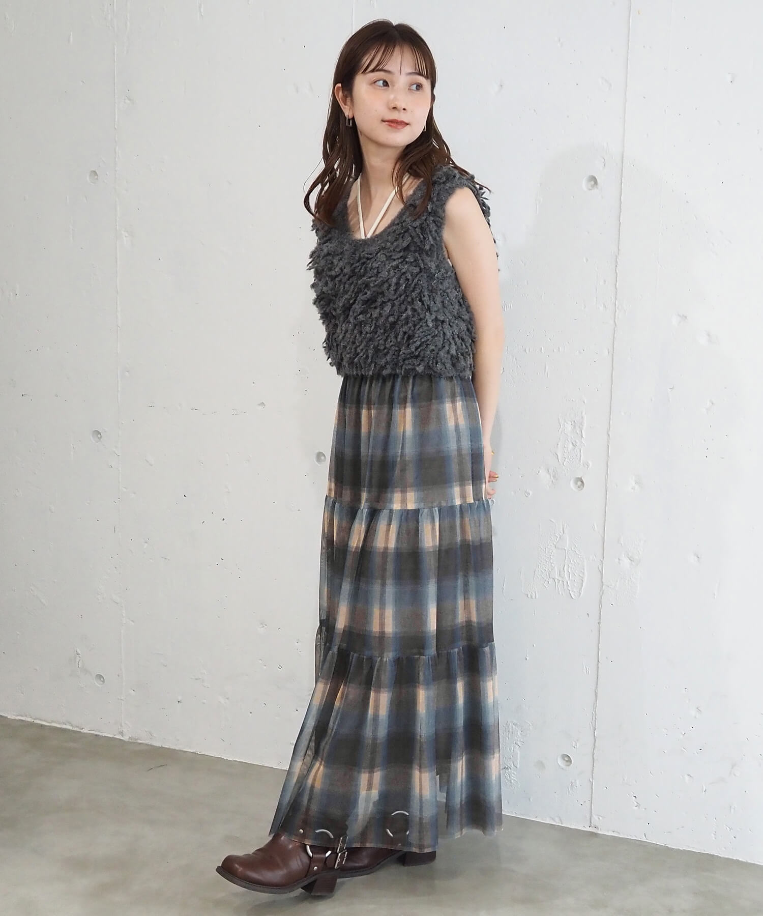 • ブルー系その他2(チェック柄) model:H155 着用サイズ:FREE